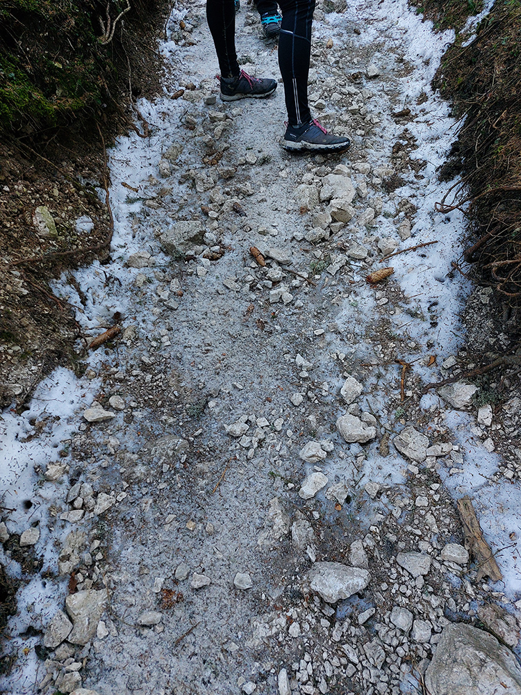 Zostup na juh je síce na viacerých tienistých miestach šmýkavý, ale bezpečnejší a istejší ako sever. Skaly suché a ľady špinavé, nižšie sa aj blato nájde. Pred očami rastie Stoh a za chrbtom brčkavý terén Rozsutca v neskorodenných pastelových farbách.