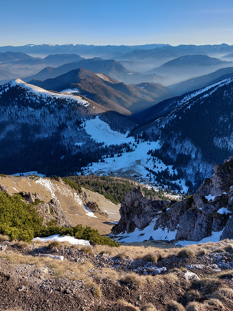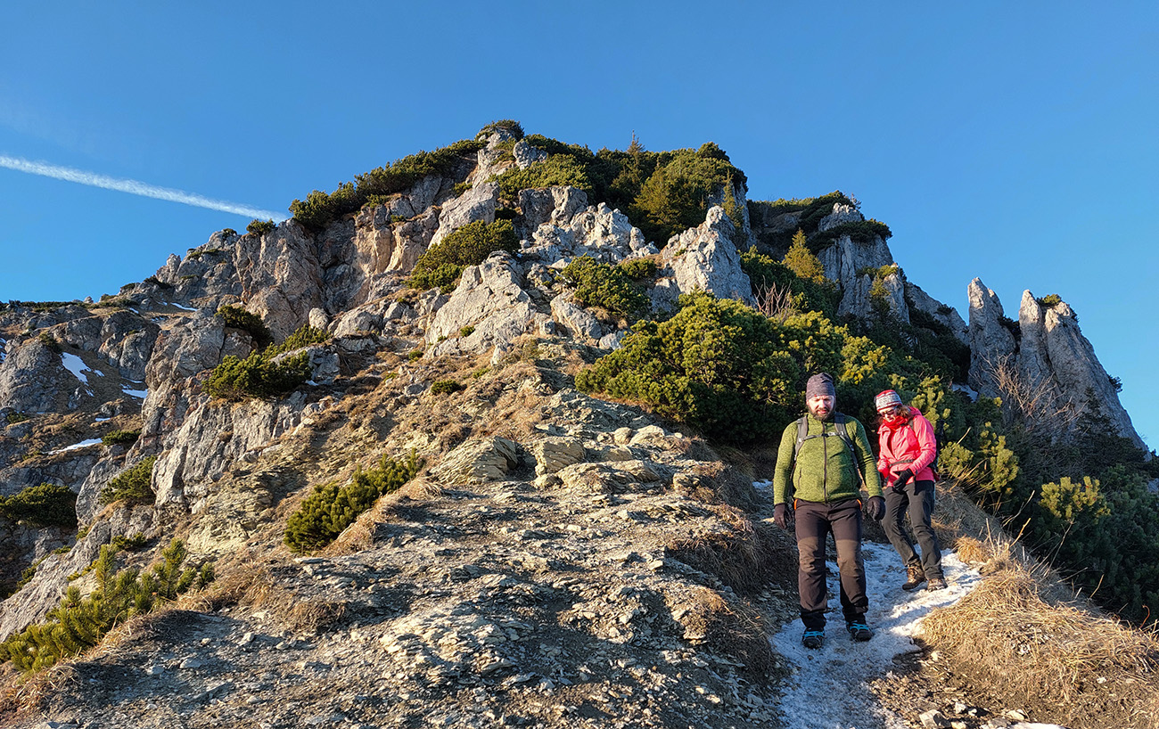 Nazad dole, medzi sedlami jedovato prefukuje a v tieňoch prituhuje, tešíme sa, ako sa ohrejeme výstupom na Veľký. Aj tu cestou pár pekných miest na predýchanie a pokochanie. A kontrast zavinený polohou a výškou zimného slnka: