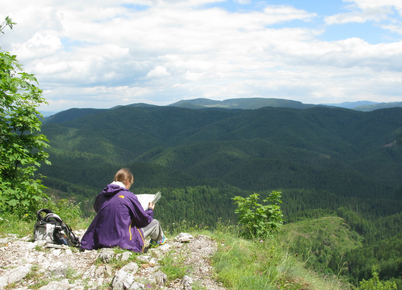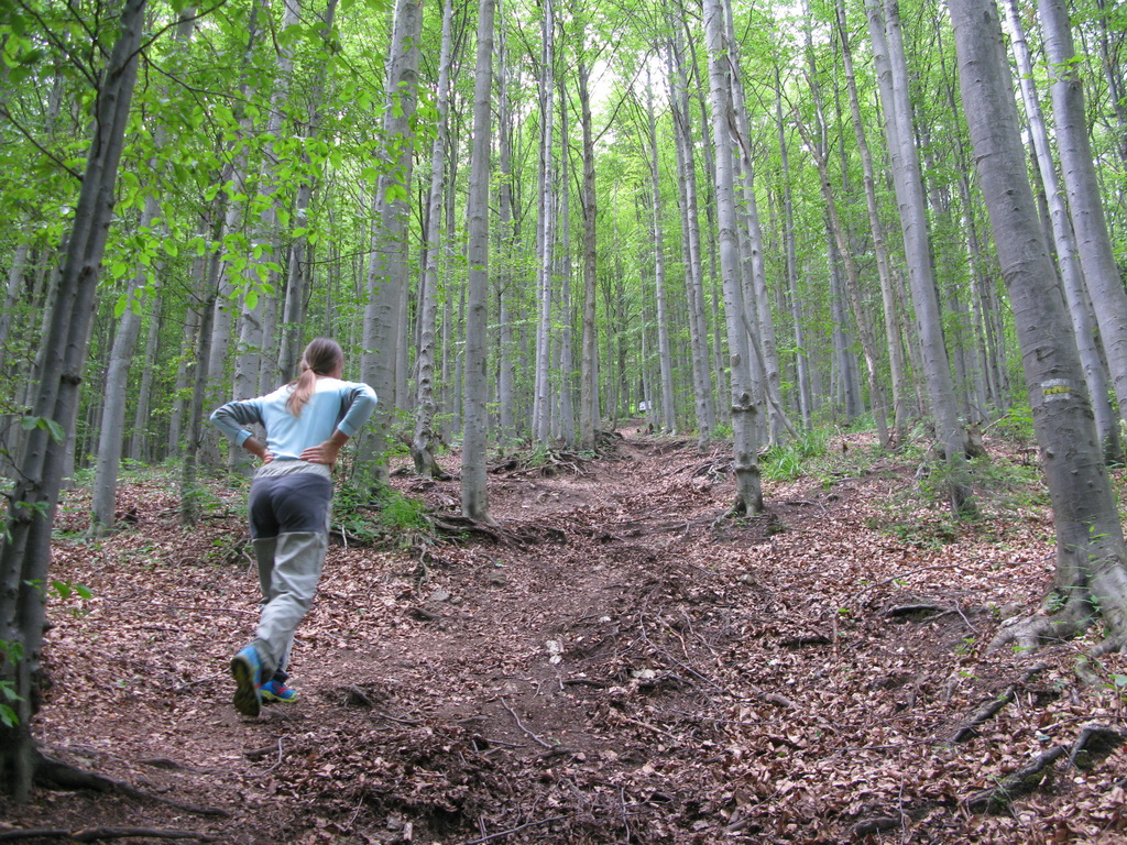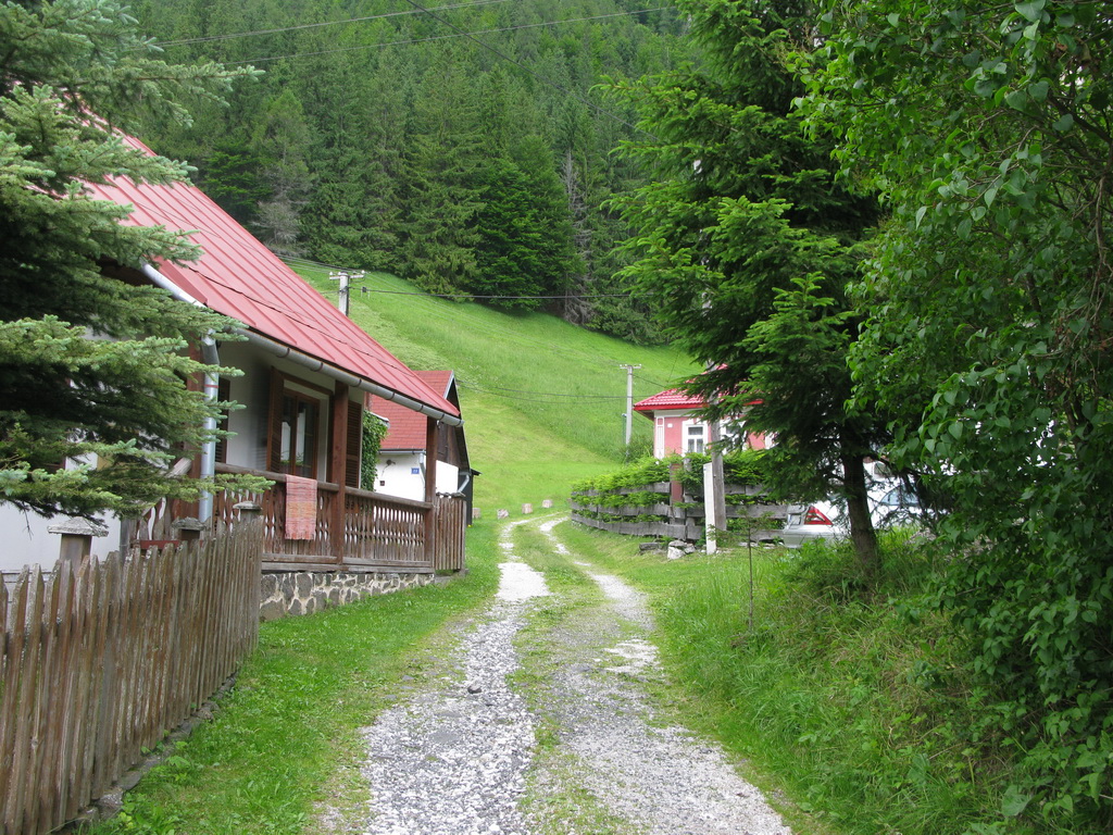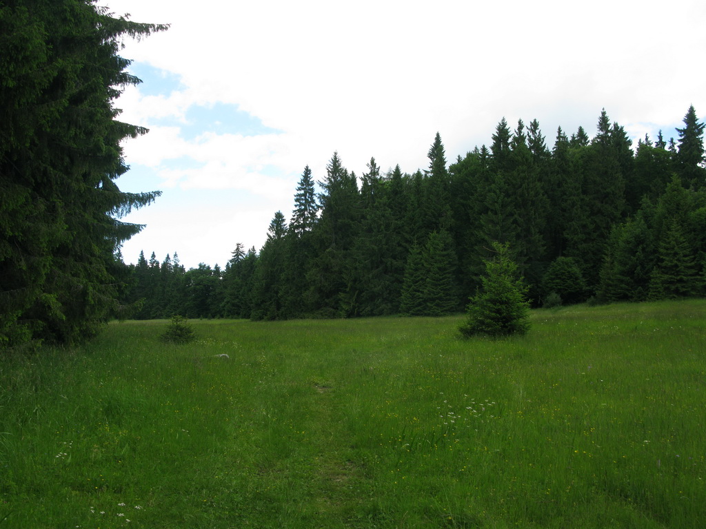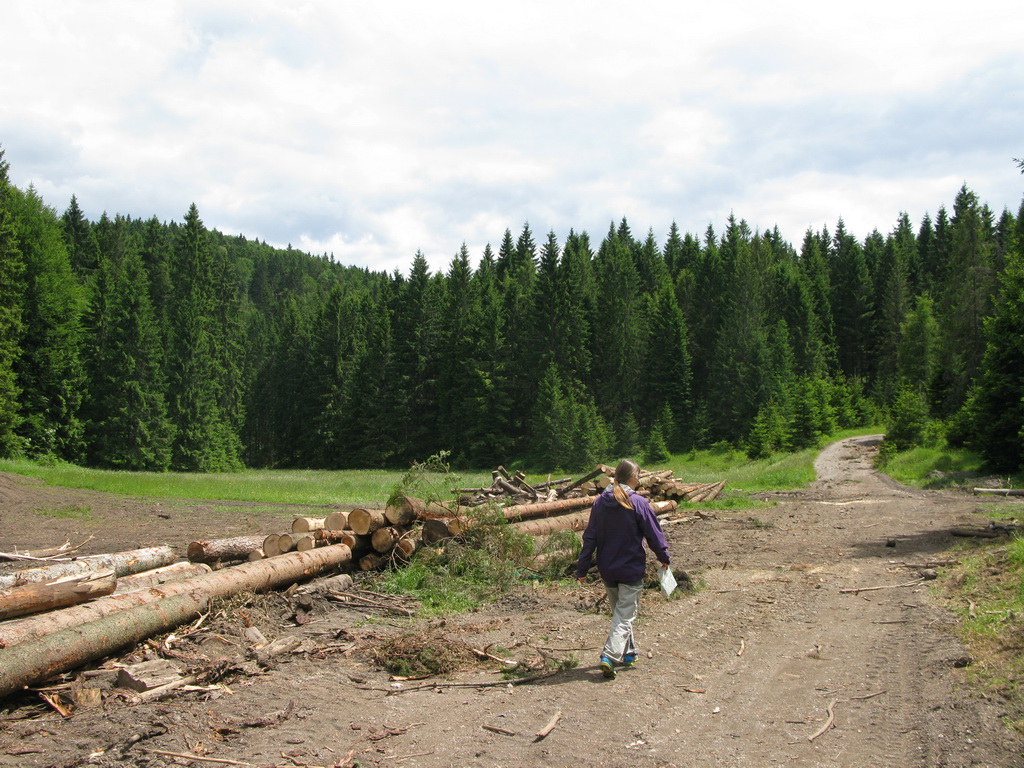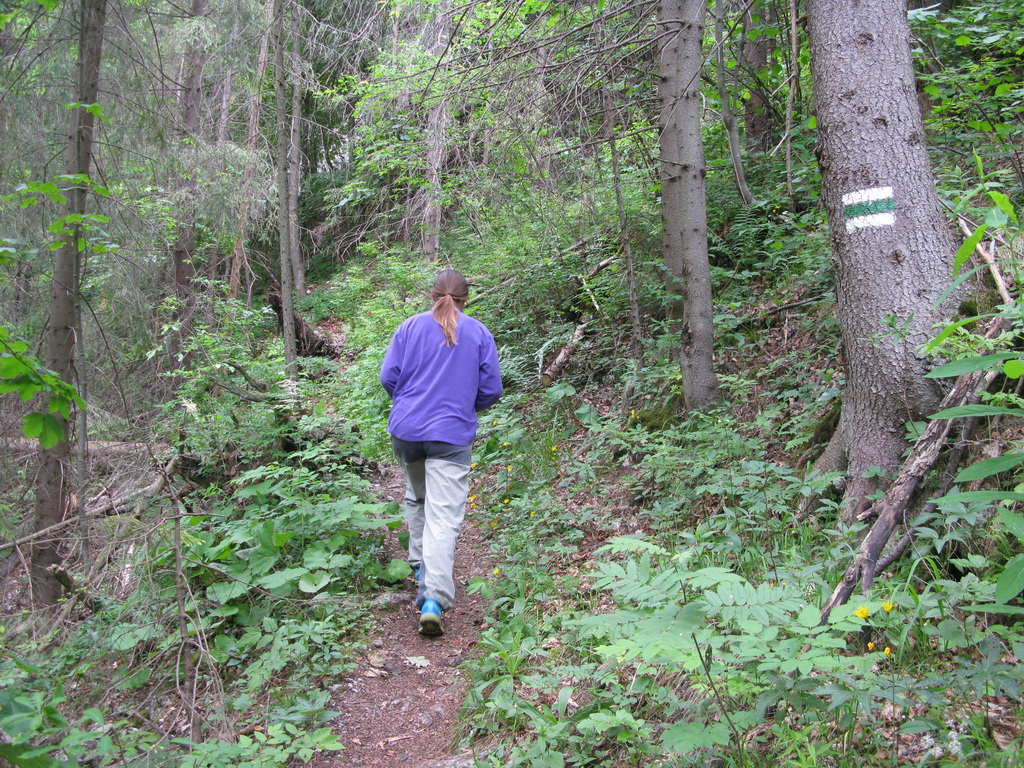 Naspäť sa vraciame po žltej značke. Zostup je miernejší a pohodlnejší, ako keby sme mali ísť naspäť tou istou trasou. Na lúke, ktorá momentálne slúži ako skládka dreva, sa žltá so zelenou len tesne míňajú. Rozhodujeme sa neísť do Stratenského kaňonu, ktorý jazdíme často na bajku, ale po lúke sa dostaneme naspäť na zelenú, po ktorej sme prišli.