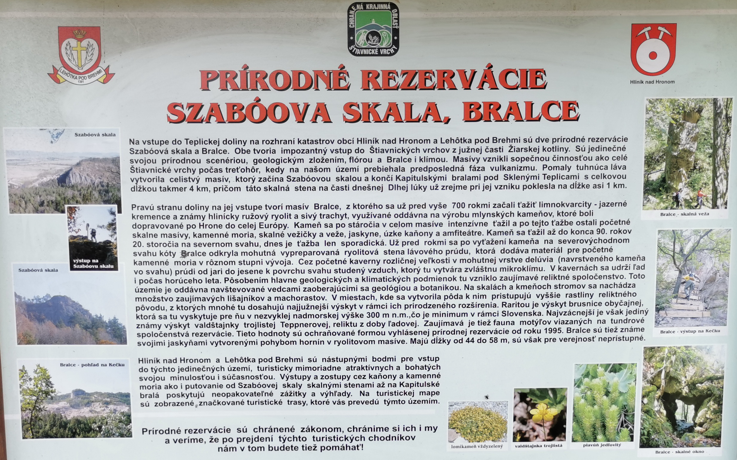 V ústí Teplickej doliny, na pomedí katastrov obcí Hliník nad Hronom a Lehôtka pod Brehmi, sú dve prírodné rezervácie. Szaboova skala a Bralce. Dnes sa pozrieme na Bralce, odporúčania od kamarátov sme mali pozitívne. Zo Sklených Teplíc, kde sme pár dní bývali, je to na skok, a tak vyrážame. Parkujeme pri ceste (foto) pri autobusovej zastávke, je tu tabuľa s kvalitnými informáciami (foto). Najprv ideme kúsok po hlavnej ceste a z nej odbočujeme na zelenú značku vpravo.