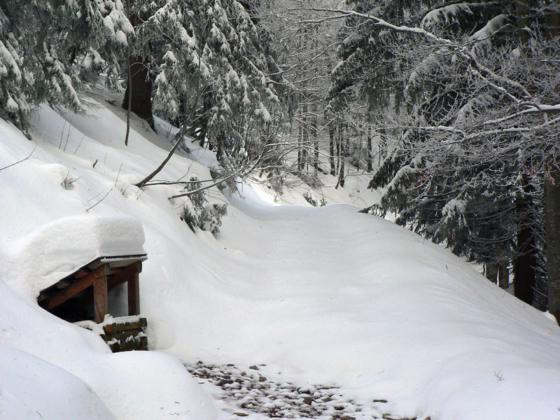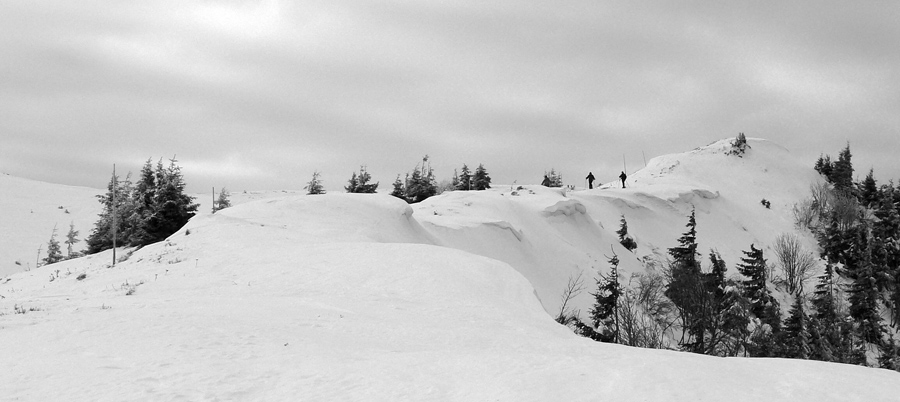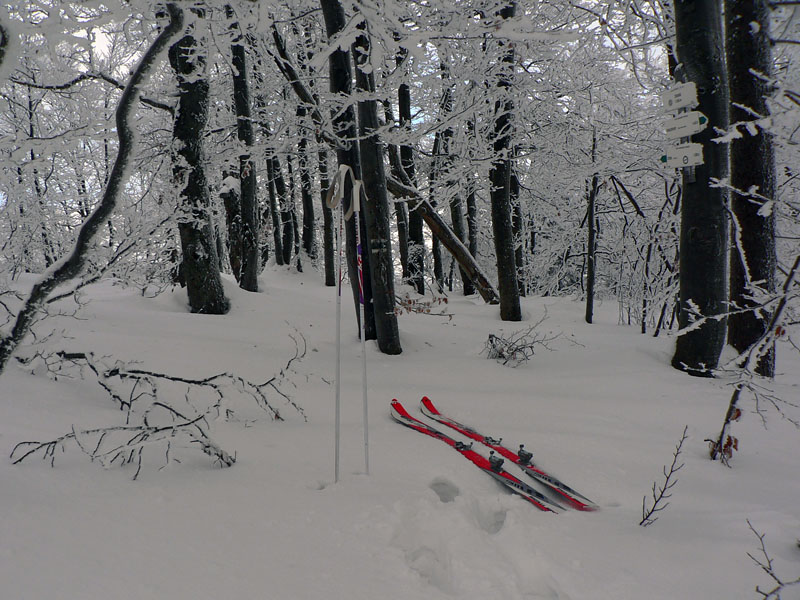 Na Žobrák sa ide lesom a pekne strmo a pekne pomedzi stromy, na lyžiach nič moc, kľučkovanie, obchádzanie a ešte aj ľadová kôra pod tenkou vrstvou prašanu. Posledný úsek som musel lyže hodiť na batoh, našťastie sa to moc neborilo. No prvý jemný zjazdík na pásoch na lúku a prásk – poriadna držka dopredu. Na otvorených miestach sa totiž od začiatku striedal prašan a vetrom ubité preveje, jeden som trafil. Nič neobvyklé, len špička provizórne gumou upnutého pásu prestala lepiť. Ale ešte je pás hádam použiteľný, ide sa ďalej.