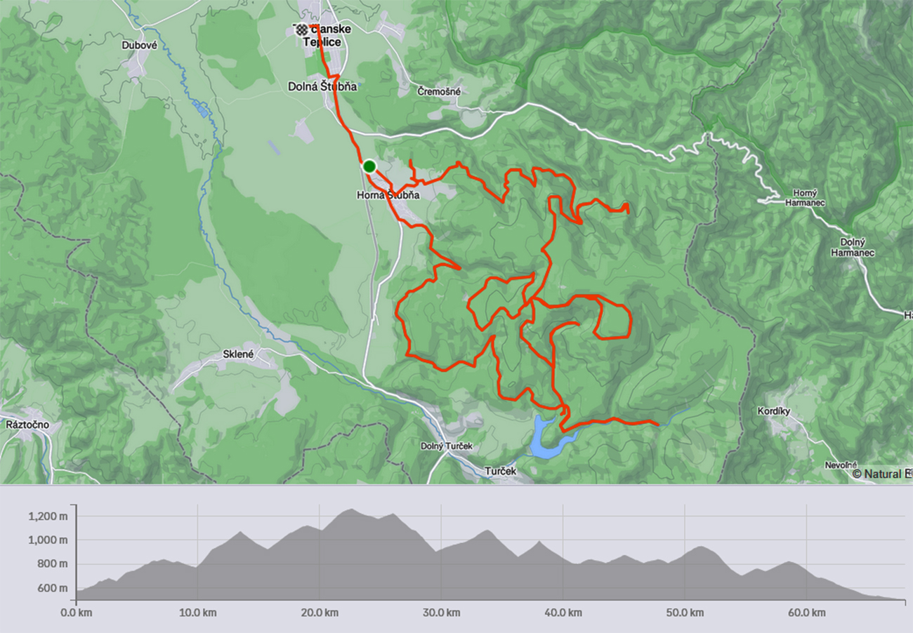 Dušičkový víkend a počasie konečne chvíľu prívetivé – nepršalo už zo tri dni, to je na túto usmoklenú jeseň poriadne dlhá pauza! Ako bola zrušená ostatná zima, tak teraz aj babie leto, že? No aj teplo udrelo na dušičky poriadne, ale zas tie blatá teraz už tak rýchlo neschnú. Tak sa mi nechcelo moc sa zaprasiť. Mal som síce na bajku už dve vrstvy blata, vari ešte zo septembra a októbra, tak že sa nič nestane, ak pribudne aj novembrová, ale zase s mierou! Bicykel v trojobale? Nie, lebo viem, že pod Flochovou v Kremnických vrchoch sú kilometre exkluzívnych lesných ciest, ozaj veľa ich je bielych, šotolinových. Ako na ozajstných pretekoch Strade bianche, ani tu sa nejde stále po šotoline - aj asfalty kadejaké a kameňohlina, samozrejme. A tunajšie strade bianche majú často zelený stredový pruh. Že mám týždenník na vlak, nič ľahšie ako dokúpiť lístok pre bicykel a vyložiť sa na Štubni z Fatrana. A už von z dediny cesta k lomu suchá ako v strede leta. Len keby nohy išli – zriedka už sa na bajk dostanem, tak to potom aj vyzerá, aj som pôvodný zámer trochu skrátil. Ďalej čítať ani netreba, fotonávod je v galérii a tu hore gpx. Takto to celé vyzeralo: