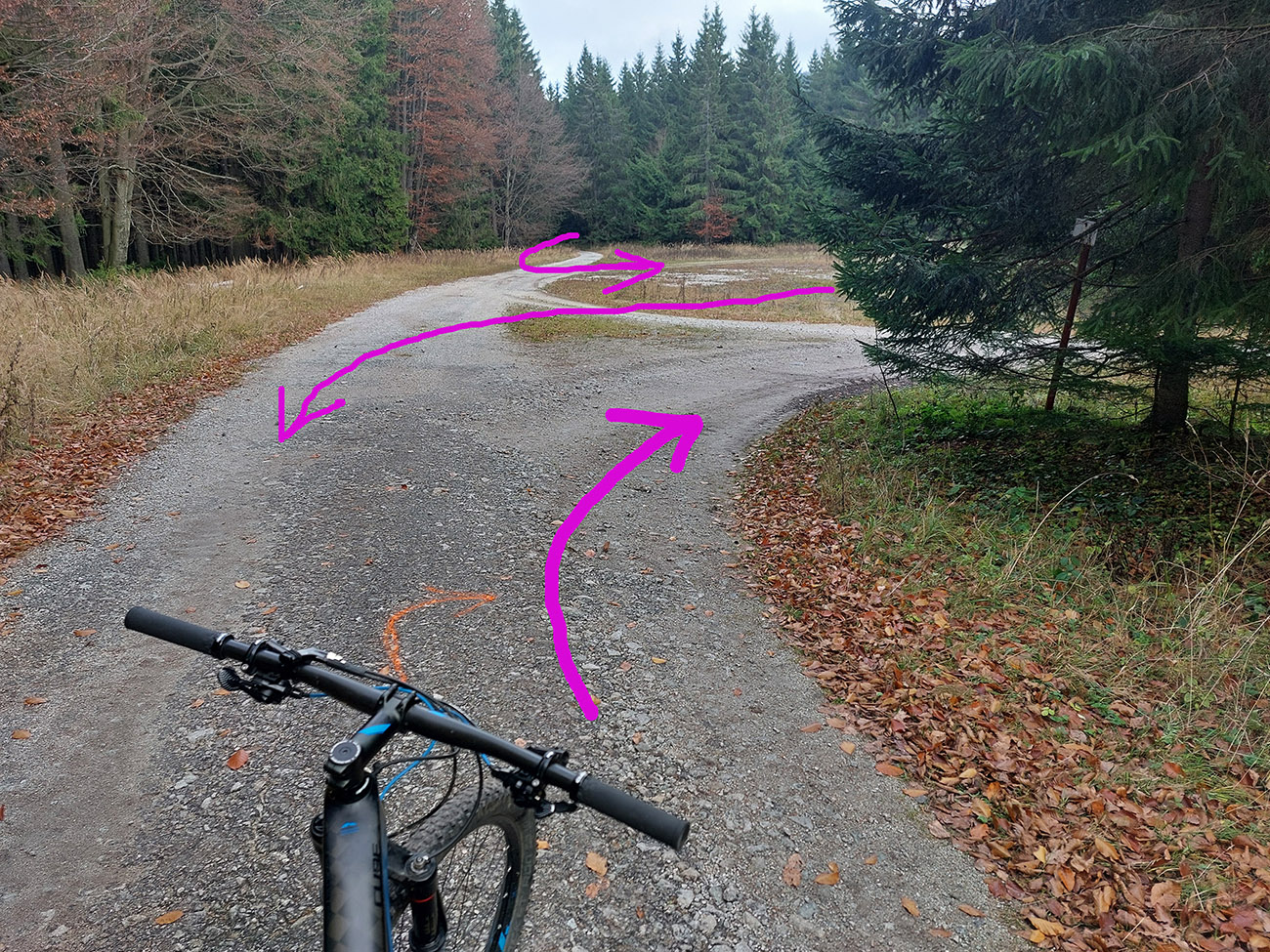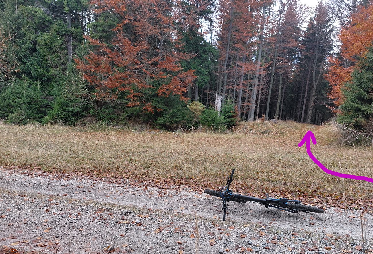 Takže prvá mašľa či uzol: doľava, priamo popod Flochovú, také kolečko okolo horárne Jegorovka a susedného, bezmenného kopca (kóta 1264 m). Do sedielka na koniec stúpania pohodová šotolinka, potom asi štyri možnosti, treba brať druhú sprava (krmelec po ľavej ruke). Cesta klesá, mení sa z „bianca“ na „verde“ a vyzerá, že sa ide stratiť, aj keď mapy.com ju majú ako spevnenú. Ale je zjazdná a po chvíli sa rozšíri na serióznu zvážnicovú normu. Za odbočkou k Jegorovke sa napojí na ešte fajnovejšiu, šotolinovú. Potom už len nazad na Široký peň. Kolečko v takomto smere je jednoznačne pohodlnejšie ako opačne, keby čosi...