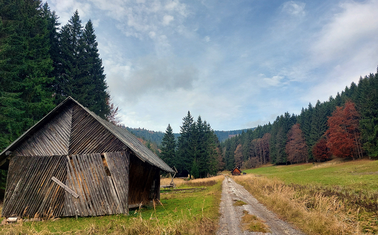 Taaak, Široký peň po tretí raz a naposledy, odbočil som odtiaľ doprava dole, do doliny Ružovej. Po bielom podklade, ako inak. Dole som si tiež dal krátku zachádzku - doľava, hore dolinou potoka Javorovec. Cez pekné lúky s lesníckymi chatami, až kým cesta zo šotoliny neprejde na trávu, pristrmí sa a skončí pri potoku.