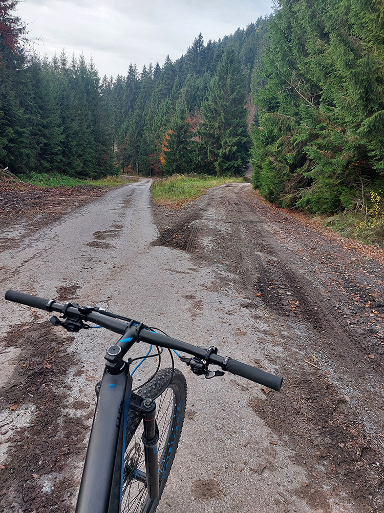 Tak nazad dole a z križovatky do ešte miernejších sklonov po príjemne praskajúcej šotoline, smer sedlo (alebo skôr križovatka) Široký peň. Cestou jedna poriadna zákruta, okolo prehľadné lesy a šírka aj pre kamión. Vynoril som sa na tej križovatke prvý raz, ešte dva razy som to mal v pláne, chystal som sa to tam poriadne zauzliť.
