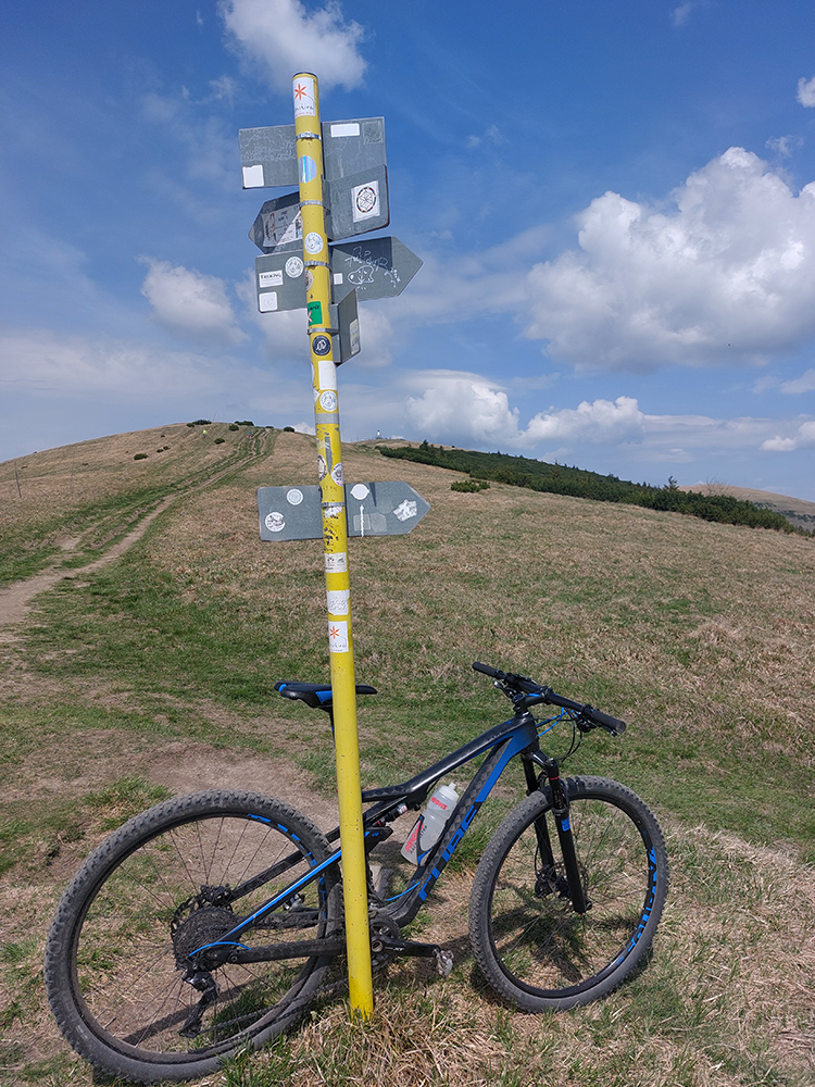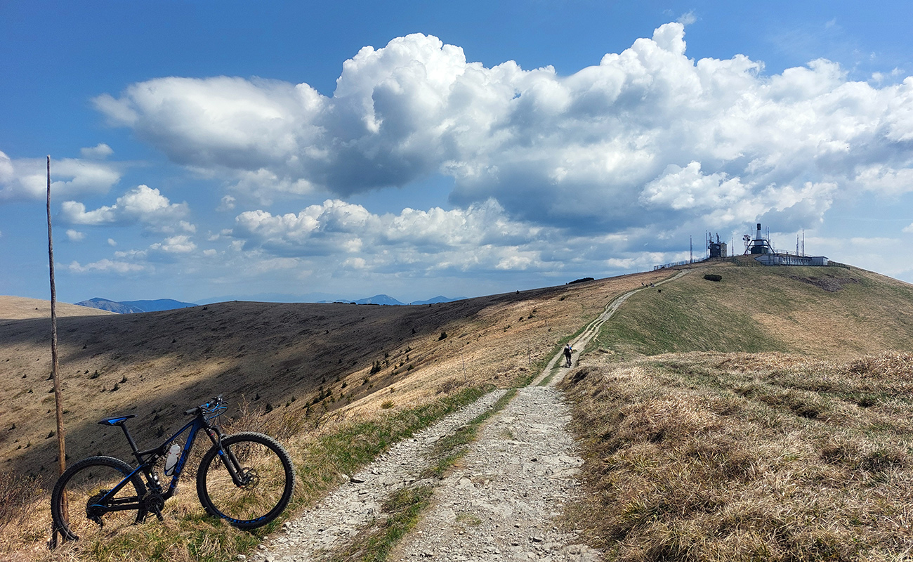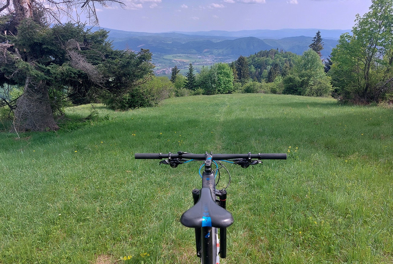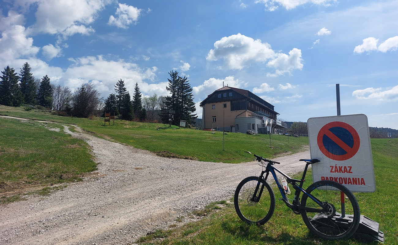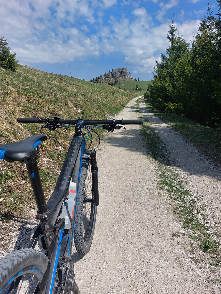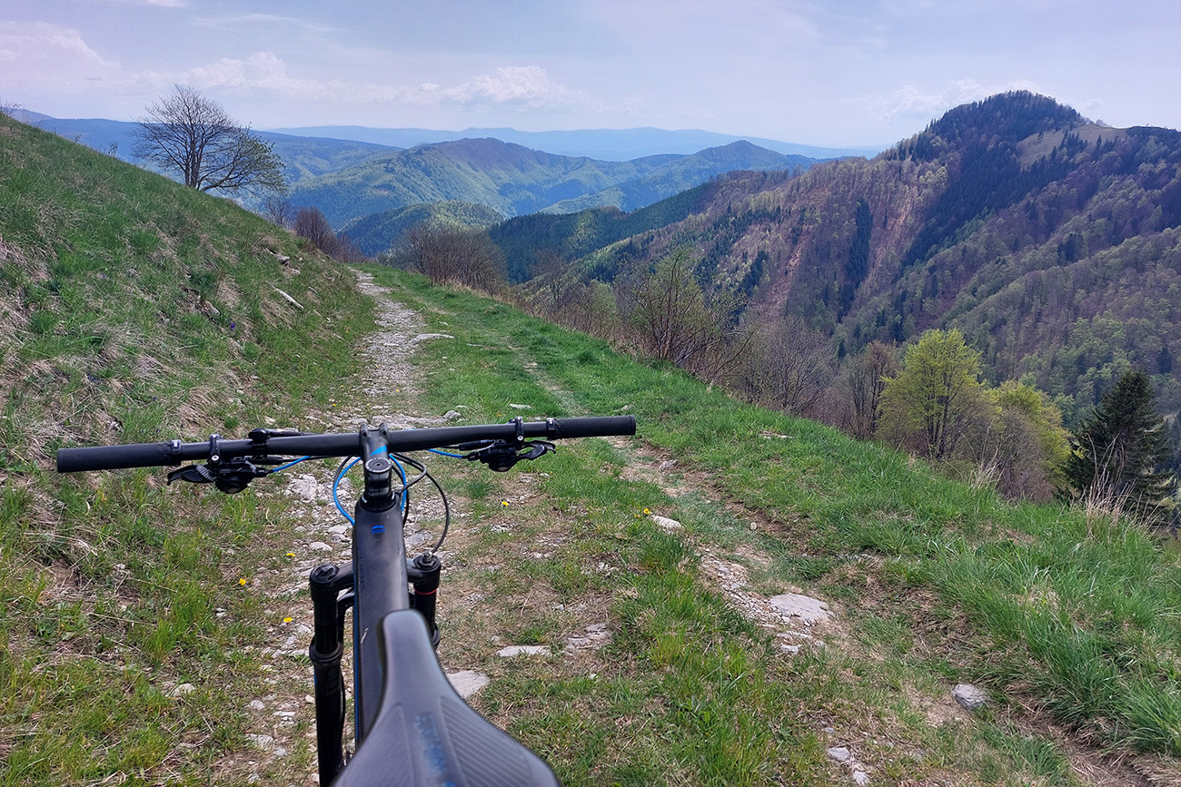 Hore na Krížnu je to už iná stena – a ešte vyerodovaná, aj keď stôp vyjazdených je tu dosť. Po úvodnej strminke za hotelom som preventívne dotankoval v napájadlách, zahryzol sa do riadidiel, zaradil „vyprošťovák“ a davááj hore. Ale nohy ešte silné a stúpanie je tu našťastie prerušované, s rovinkami na predýchanie. Vietor parádny, výhľady ešte lepšie, veď ako na holiach. Len tá technika pomalej jazdy cez šutre nič moc, trochu aj drina miestami.