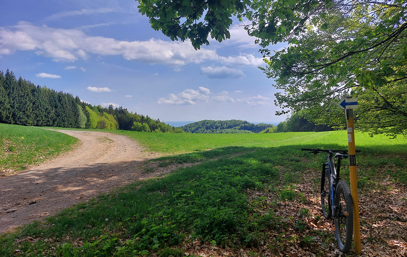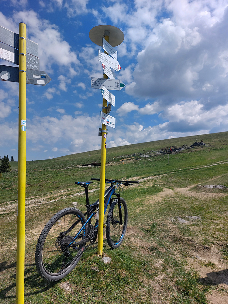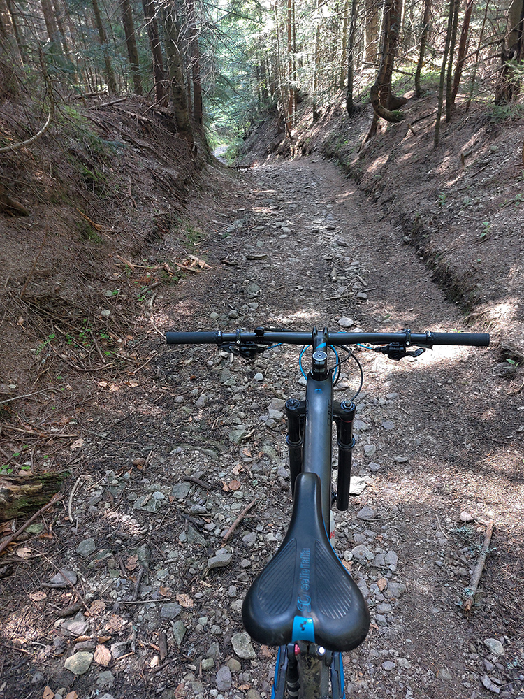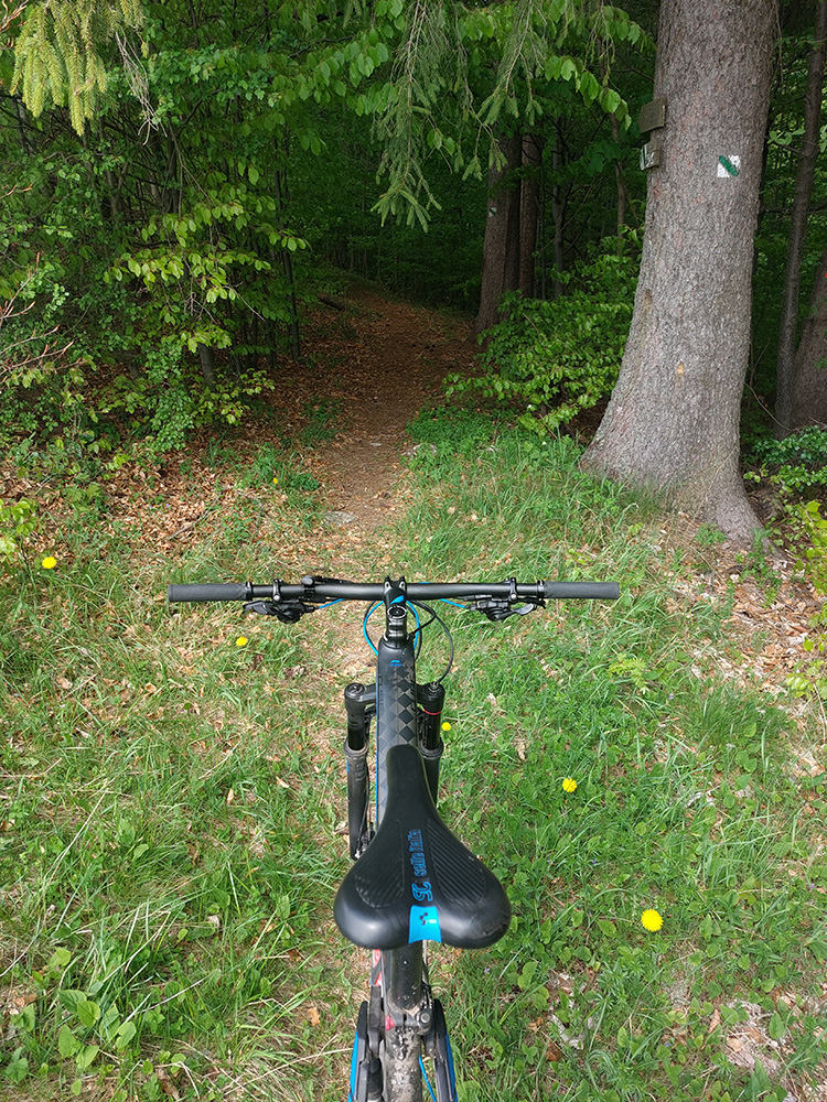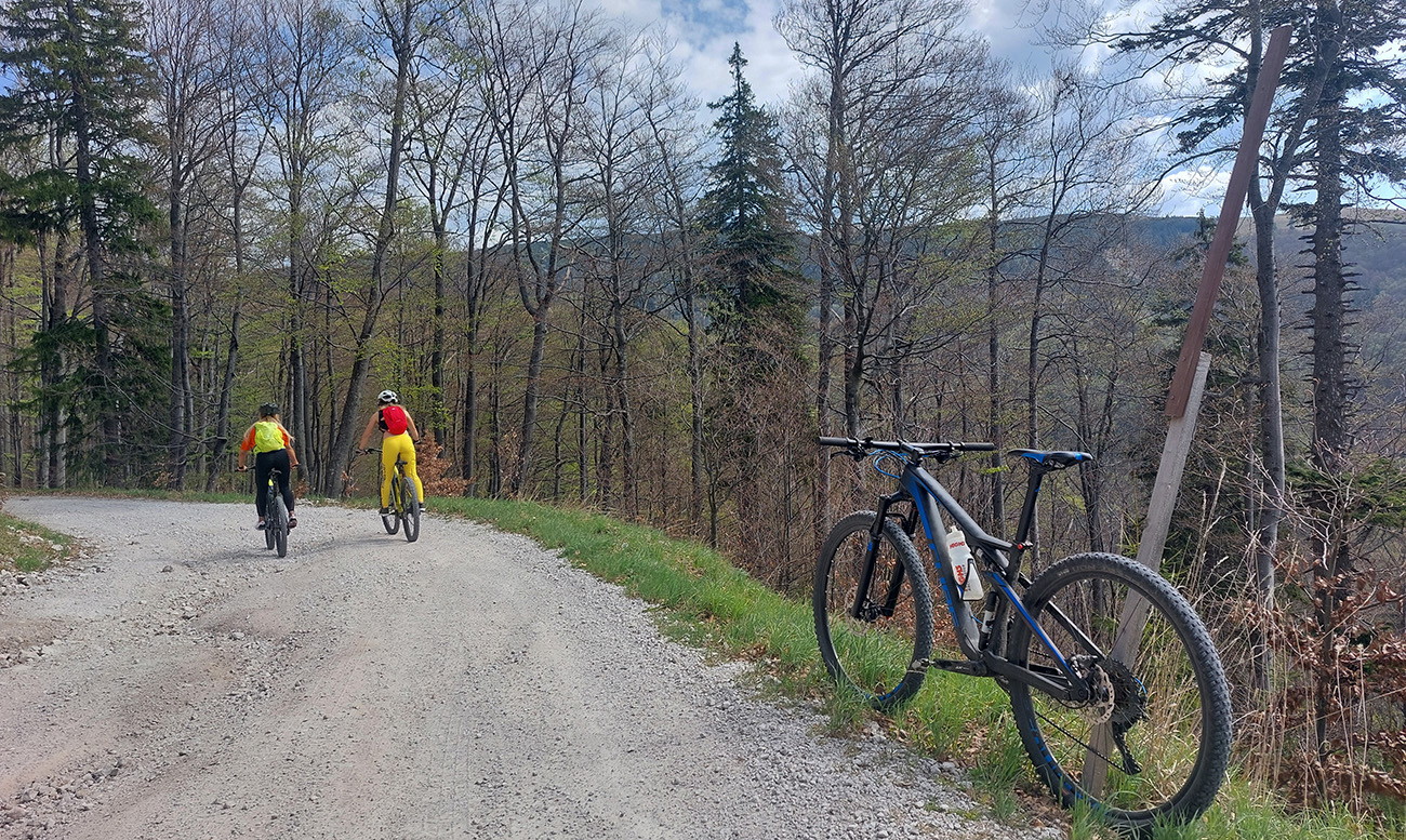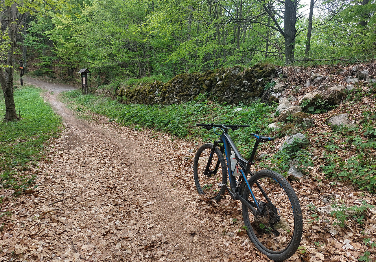 Hore na Krížnu je to už iná stena – a ešte vyerodovaná, aj keď stôp vyjazdených je tu dosť. Po úvodnej strminke za hotelom som preventívne dotankoval v napájadlách, zahryzol sa do riadidiel, zaradil „vyprošťovák“ a davááj hore. Ale nohy ešte silné a stúpanie je tu našťastie prerušované, s rovinkami na predýchanie. Vietor parádny, výhľady ešte lepšie, veď ako na holiach. Len tá technika pomalej jazdy cez šutre nič moc, trochu aj drina miestami.