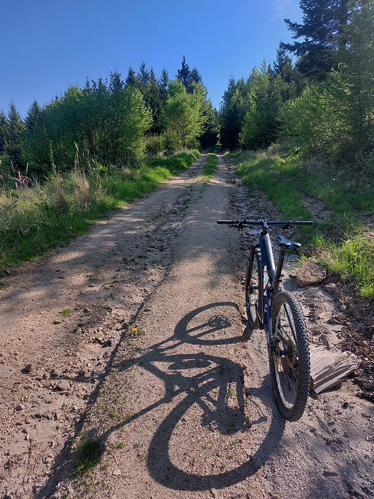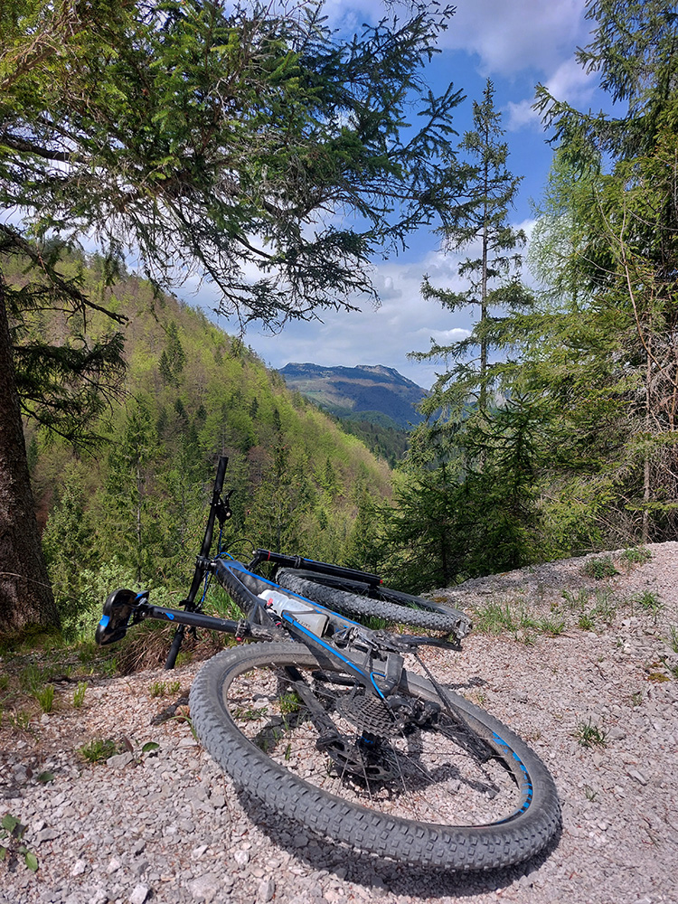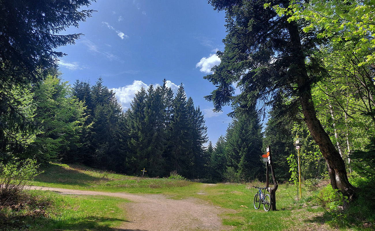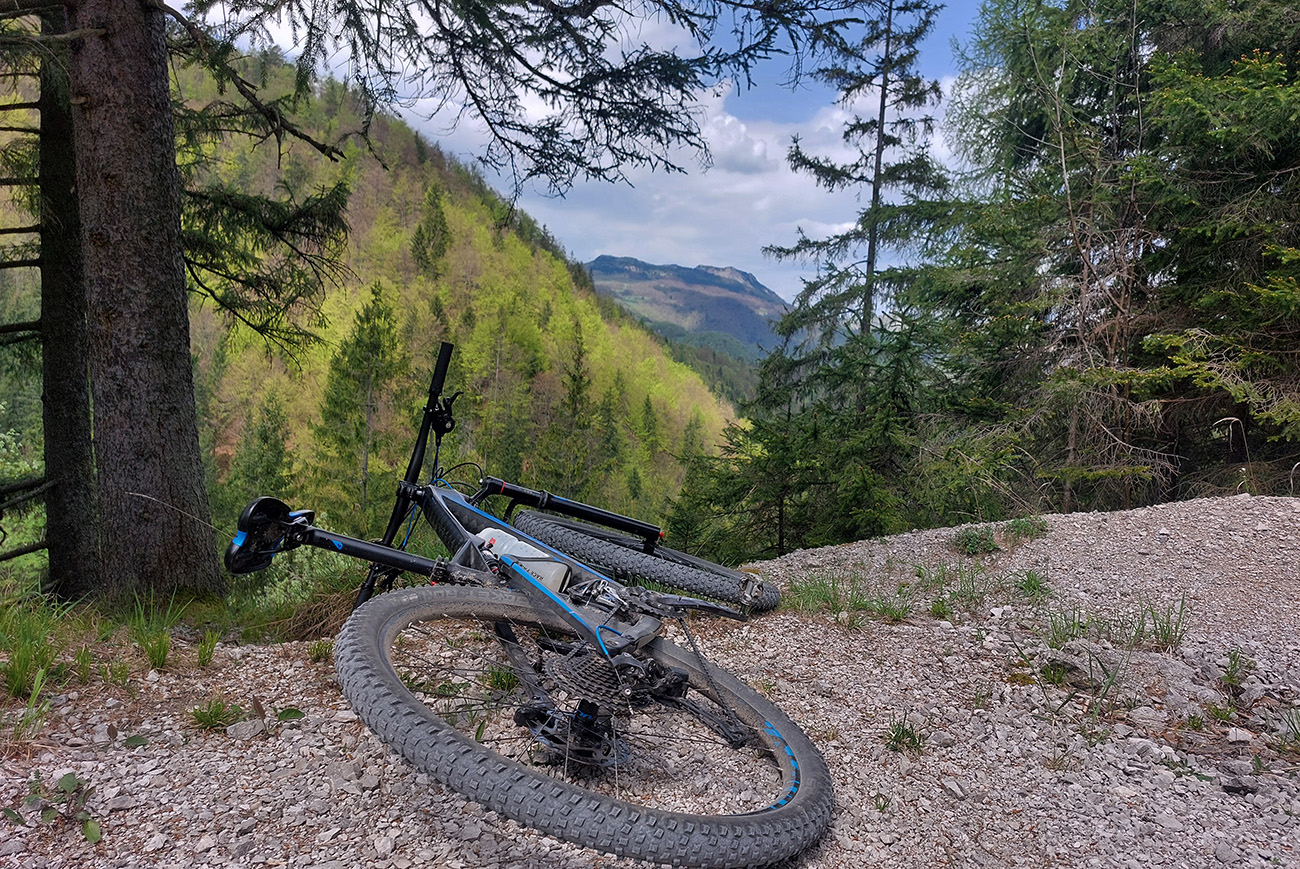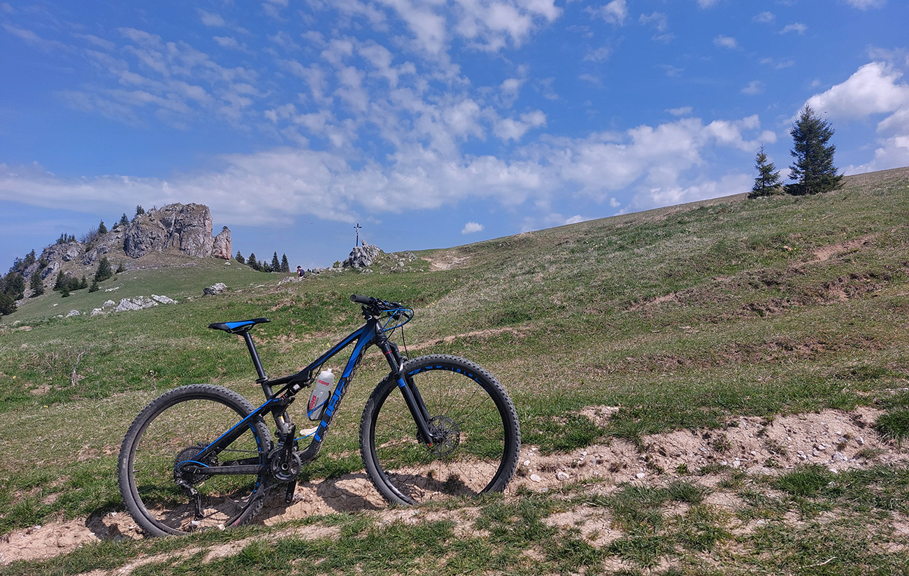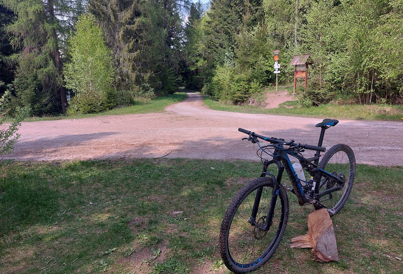 Hore na Krížnu je to už iná stena – a ešte vyerodovaná, aj keď stôp vyjazdených je tu dosť. Po úvodnej strminke za hotelom som preventívne dotankoval v napájadlách, zahryzol sa do riadidiel, zaradil „vyprošťovák“ a davááj hore. Ale nohy ešte silné a stúpanie je tu našťastie prerušované, s rovinkami na predýchanie. Vietor parádny, výhľady ešte lepšie, veď ako na holiach. Len tá technika pomalej jazdy cez šutre nič moc, trochu aj drina miestami.