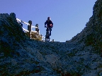 Hneď prvú noc sme sa teda aj napriek prítomnosti iste pohodlnej horskej chaty rozhodli prespať vonku. Našli sme si vhodný prístrešok, ktorým bola už nepoužívaná chata Knappenhutte a tam sme sa uložili na starých stoloch pekne pod strechou terasy. Bol to parádny bivak, no Števo ma v noci vystrašil nejakou nočnou morou a ráno sa priznal, že takto vonku ešte nespal, akurát tak v stane v lete na Šírave. Ráno pekne raňajky a už sme si aj našli to, prečo sme sem prišli. Nie zjazd po šotoline, ale do údolia pekne nenápadným chodníčkom, aj za tú cenu, že občas je tu riziko, že budete bicykel znášať nezjazdným terénom. Raz som už znášal aj dolu ferratou:) Tento chodníček sme však trafili parádny a za odmenu sme mali hneď na ráno 800 v.m. trailu do mestečka Neustift im Stubaital. Tu som si chcel kúpiť cyklorukavice, no mali len ferratové, tak som zobral tie.