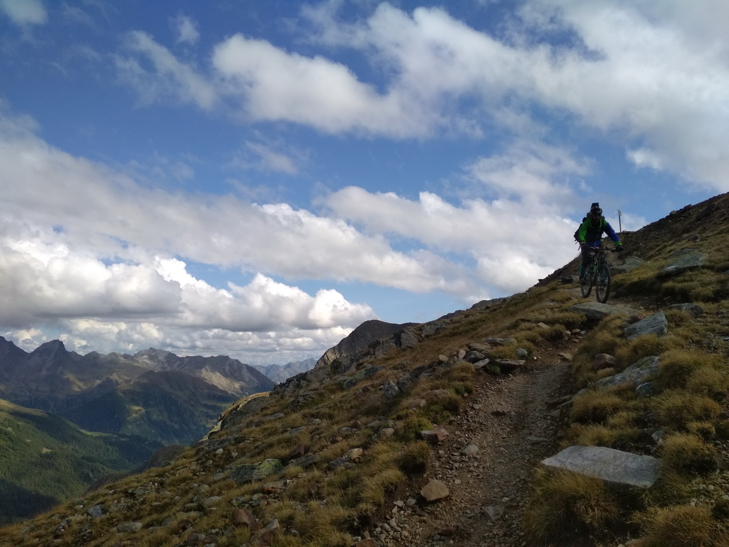 Inač Eisjoch a Hohe Wilde odporúčam aj ako výlet s manželkou. Prekročíme sedlo a už nás čaká 2300 v.m. zjazd. To nie je pre nikoho zas až tak úplne bežné. Zjazd zo sedla smerom na západ nie je technicky náročný. Je to, akoby som to opísal - fantastické, škoda reči. Kto nezažil MTB v Alpách, prichádza o jeden osobitný rozmer cyklistiky. Pre mňa je to topka. Kým zozjazdujeme na parkovisko, Števo ešte presekne bezdušák. Locus nám opäť pomohol v tom, že nemusíme strácať výšku po asfalte, ale môžeme si to ďalej užívať po singletracku, hoc aj kravami zamínovanom. Na záver je aj strmý asfalt celkom vzrúšo. Cesta z údolia sa pripája na hlavnú cestu smerom do Kurzraz odkiaľ som pôvodne chcel prejsť cez hory k Rechnenpass, ale cestu v mape som nenašiel, tak ak niekto o nejakej rideable ceste viete, tak poraďte. Zjazd k hradu Juval si ešte spestrím krátkym výšľapom do Karthaus a zjazdom mimo asfalt.
