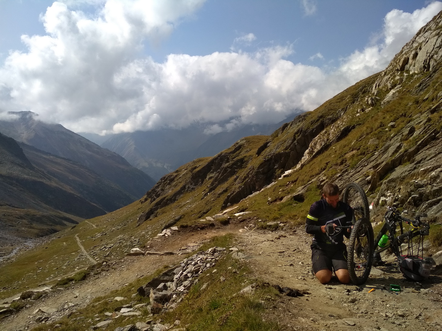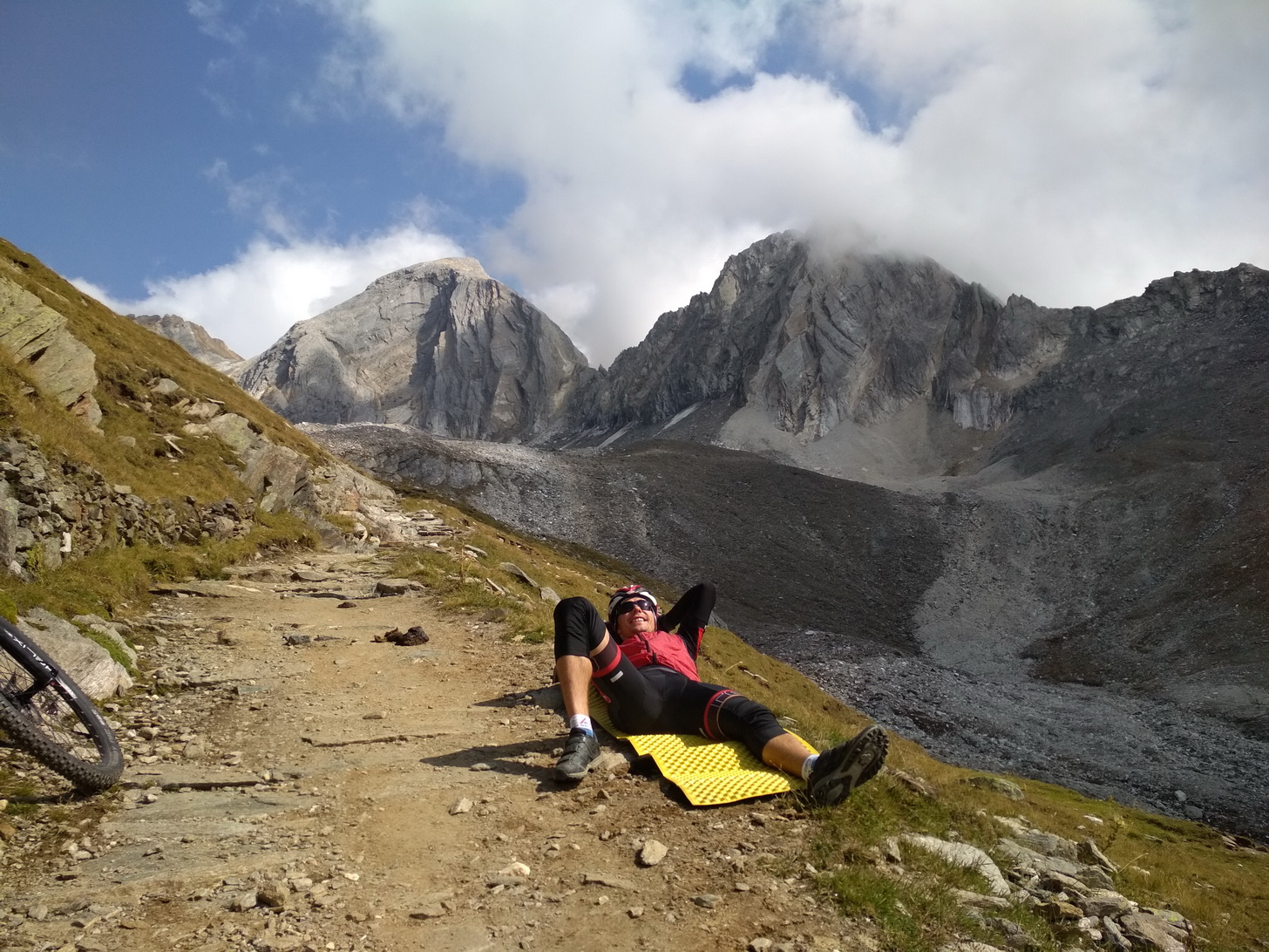 A veru. Nastalo ráno. Počasie bolo fajn a my sme mohli vyrazili. Najprv 250 v.m. strmou šotolinou a potom ďalších 250 po ľadovci popod vlek. Viem, že veľa cyklistov by to ohundralo, že trebalo hore ľadovcom tlačiť a že to vedie cez lyžiarske stredisko a že to už ani nie je cyklistika. To je transalp, kde sa prekonávajú alpské hrebene. Pre mňa to je NAJ, čo môžem v cyklistike zažiť. Boli sme vo výške 3150 m.n.m. a pod nohami sme mali dlhočízne alpské údolie, kde o 1800 v.m. nižšie keď skončí zjazd, tak máte od šťastia ten priblblý úsmev na tvári. Kým sme sa však dostali do Soldenu, tak sme najprv zjazdovali po ľadovci popri ratrakoch. Už pripravovali snowpark na zimu. Potom sme niesli po balvanoch, potom sme znášali po oceľových lanách na chatu Hildesheimer hutte. Tu pekne ranná kávička a ide sa ďalej. Trail z chaty do údolia je veľmi ťažký.