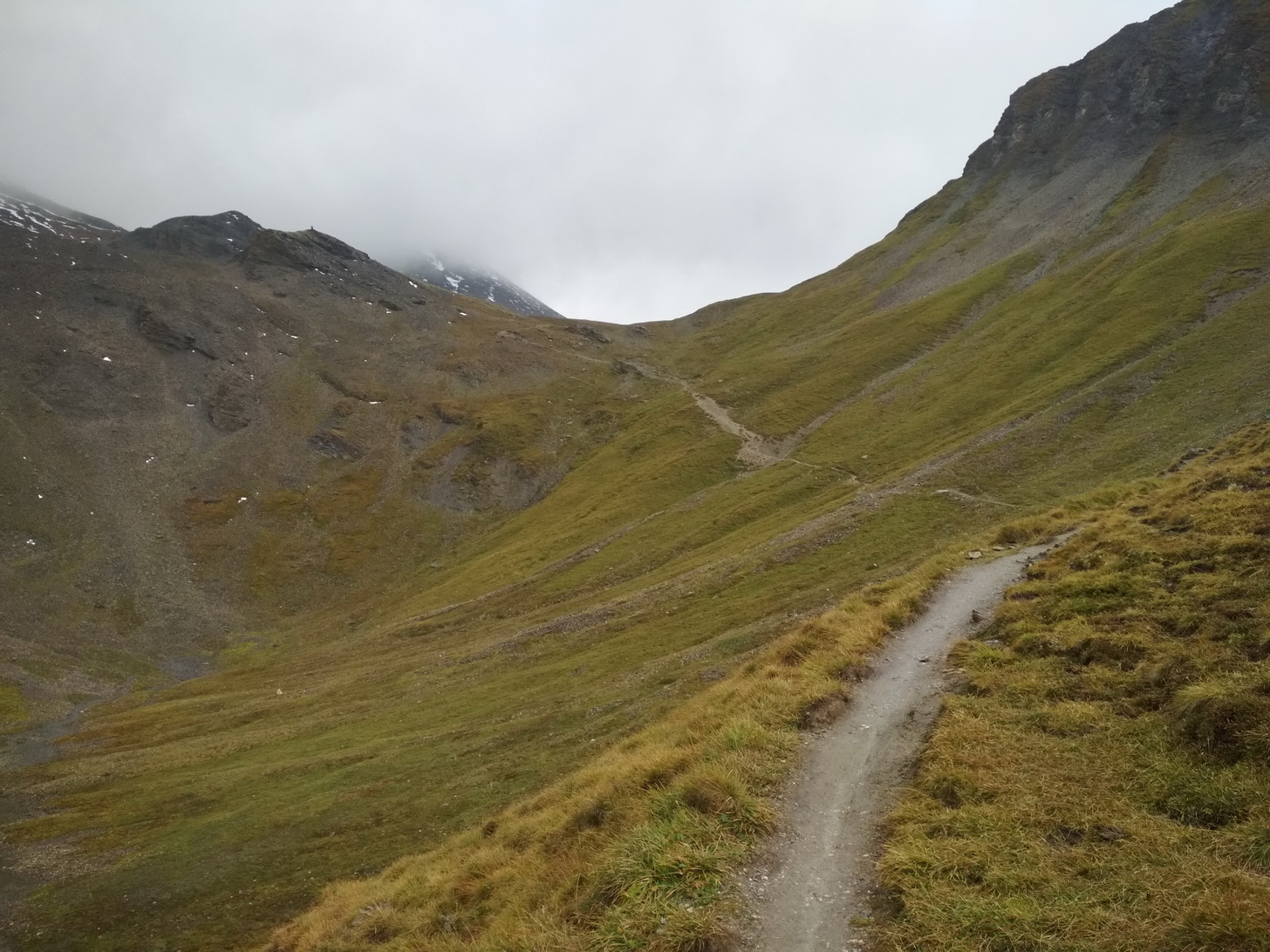 To je klasické transalpové sedlo. Zo švajčiarskej strany je posledných 600 v.m. tlačenka, ale celkom príjemná. Hory sú nádherné, počasie sa opäť pokazilo, nálada je skvelá. Zjazd k Heidelbergerhutte je zábava. Všade strieka blato. Od chaty je to tiež zábava, ale už šotolina. Dalo by sa tu vymyslieť aj niečo navyše pojazdiť, no nám tu počasie nepraje. Zvažujeme aj nocľah na Heidelbergerhutte, no aby sme ráno nezačínali deň dlhým zjazdom pravdepodobne v daždi, tak radšej sme sa ubytovali opäť v príjemnom hoteli v mestečku Ischgl.