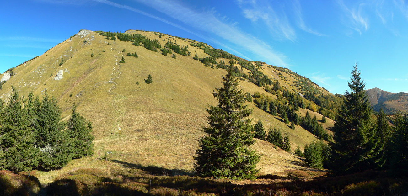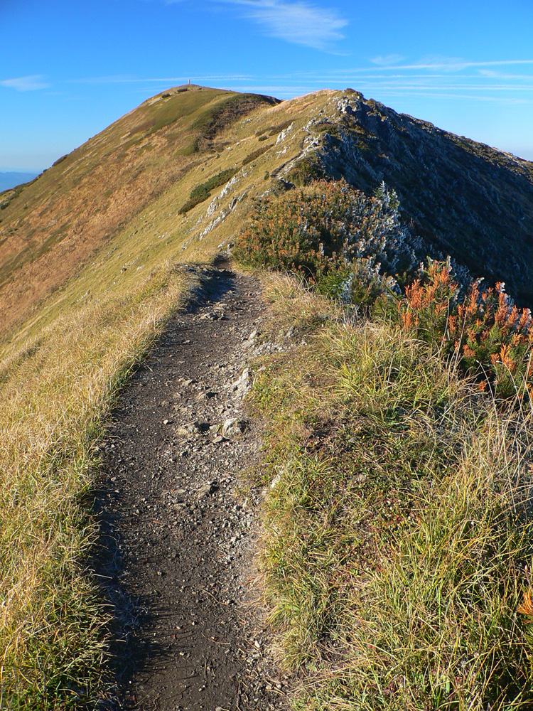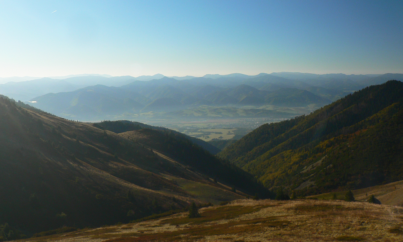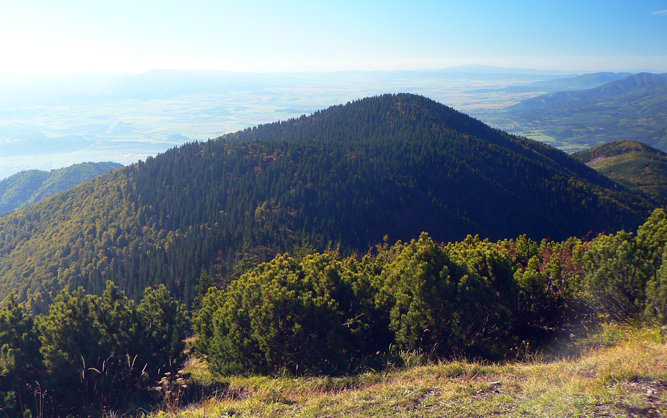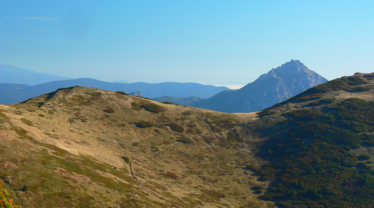 Ale zas až tak som nešibal do koní, aby som nefotil - to počasie proste nútilo každú chvíľu zastaviť a obdivovať panorámy jednej z najkrajších slovenských hrebeňoviek. Ráno síce ma prízemný mrázik a kosa v tieni hnali hore kopcom rezkejšie, ale už na Veľkom Kriváni to bolo skoro na tričko, bez vetra. Len sobotňajšia námraza ticho cupotala dole z kosodreviny a na chodníkoch, k slnku otočených, bolo trošku slizko z roztopeného srieňa. Bol som tam skoro presne na chlp ako pred dvoma rokmi (odkaz je nižšie), aj keď vtedy som na hrebeni mohol stráviť dvojnásobok času. Hlavne som ale mohol porovnať, ako vtedy farby jesene nastúpili oveľa skôr - vidno to aj na fotkách. Teraz ešte v lese prevládali odtiene zelenej a nad lesom to tiež ešte nebolo až tak do hrdzava.