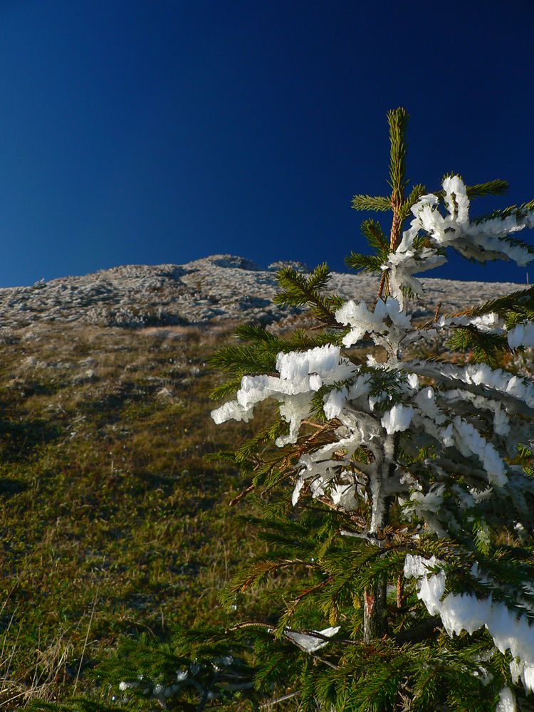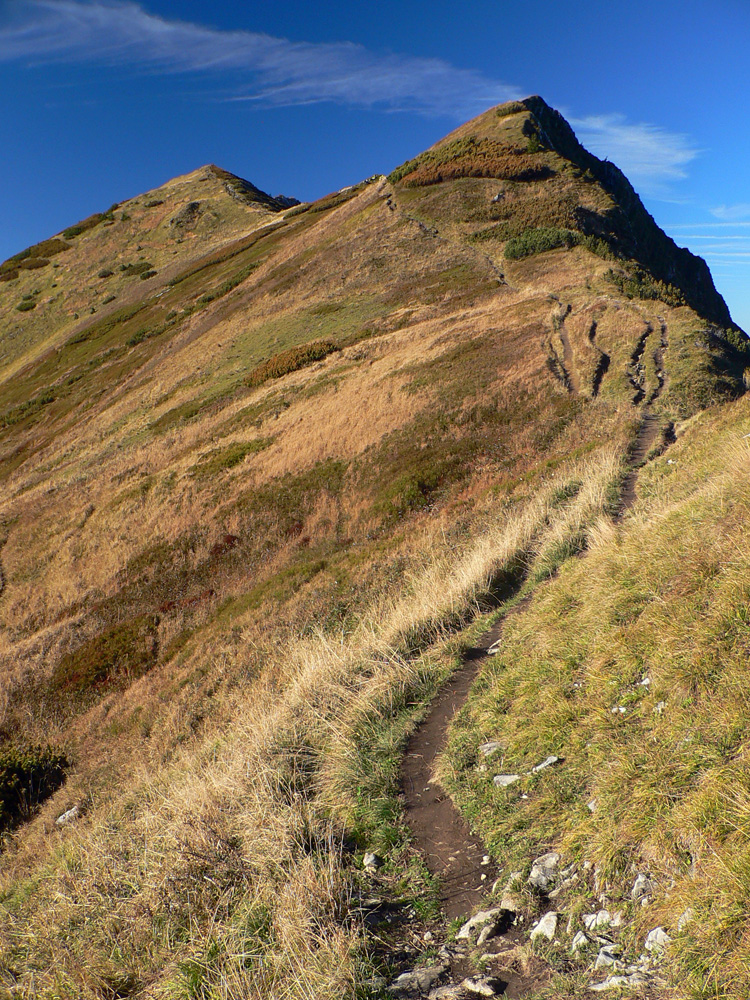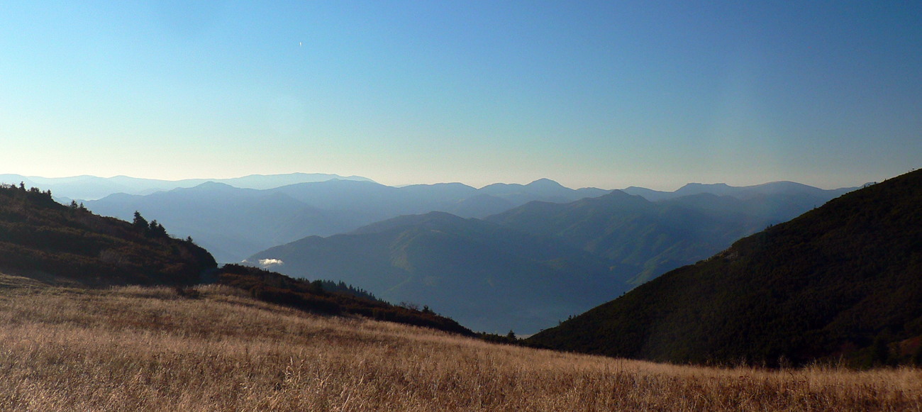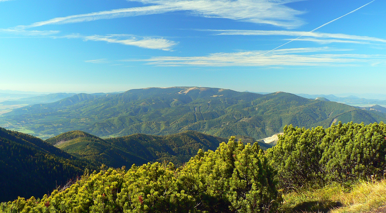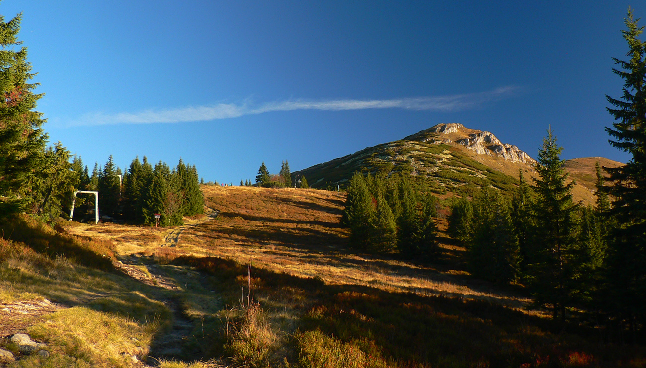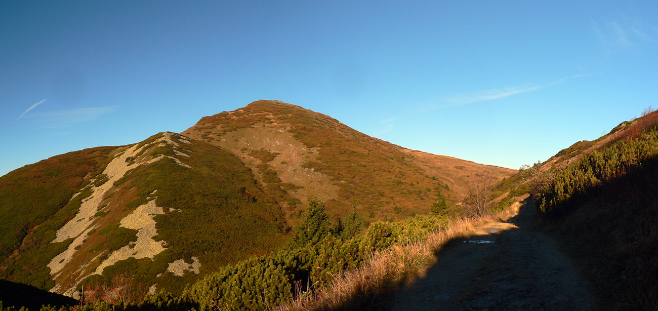 Ale zas až tak som nešibal do koní, aby som nefotil - to počasie proste nútilo každú chvíľu zastaviť a obdivovať panorámy jednej z najkrajších slovenských hrebeňoviek. Ráno síce ma prízemný mrázik a kosa v tieni hnali hore kopcom rezkejšie, ale už na Veľkom Kriváni to bolo skoro na tričko, bez vetra. Len sobotňajšia námraza ticho cupotala dole z kosodreviny a na chodníkoch, k slnku otočených, bolo trošku slizko z roztopeného srieňa. Bol som tam skoro presne na chlp ako pred dvoma rokmi (odkaz je nižšie), aj keď vtedy som na hrebeni mohol stráviť dvojnásobok času. Hlavne som ale mohol porovnať, ako vtedy farby jesene nastúpili oveľa skôr - vidno to aj na fotkách. Teraz ešte v lese prevládali odtiene zelenej a nad lesom to tiež ešte nebolo až tak do hrdzava.