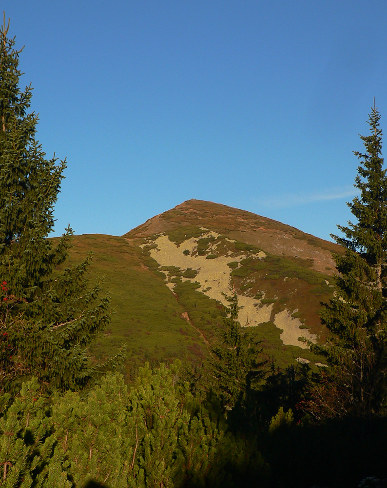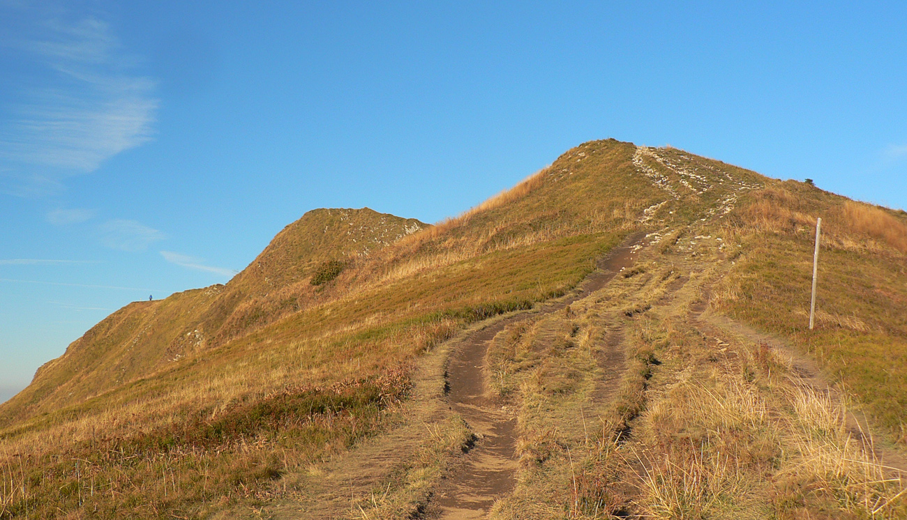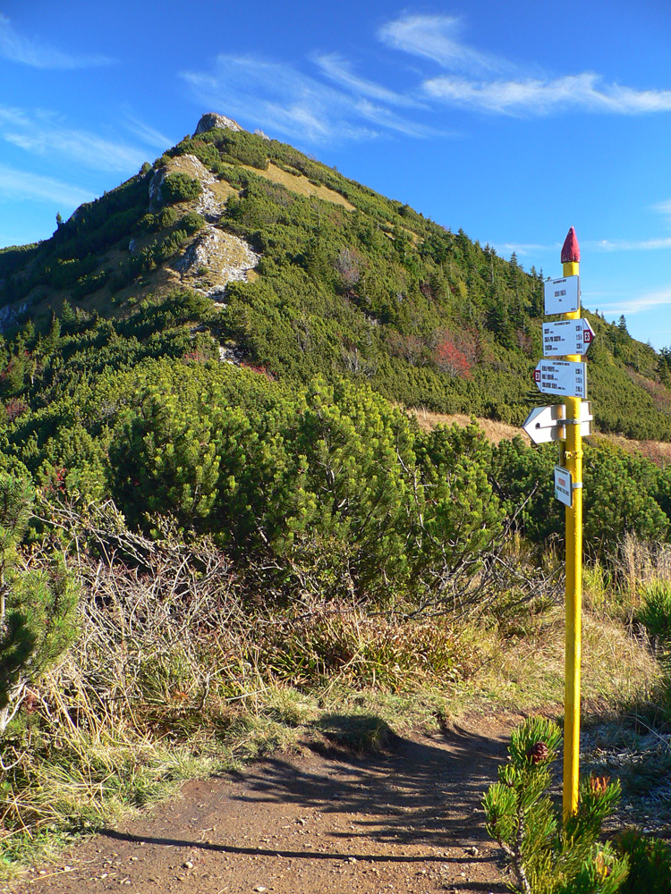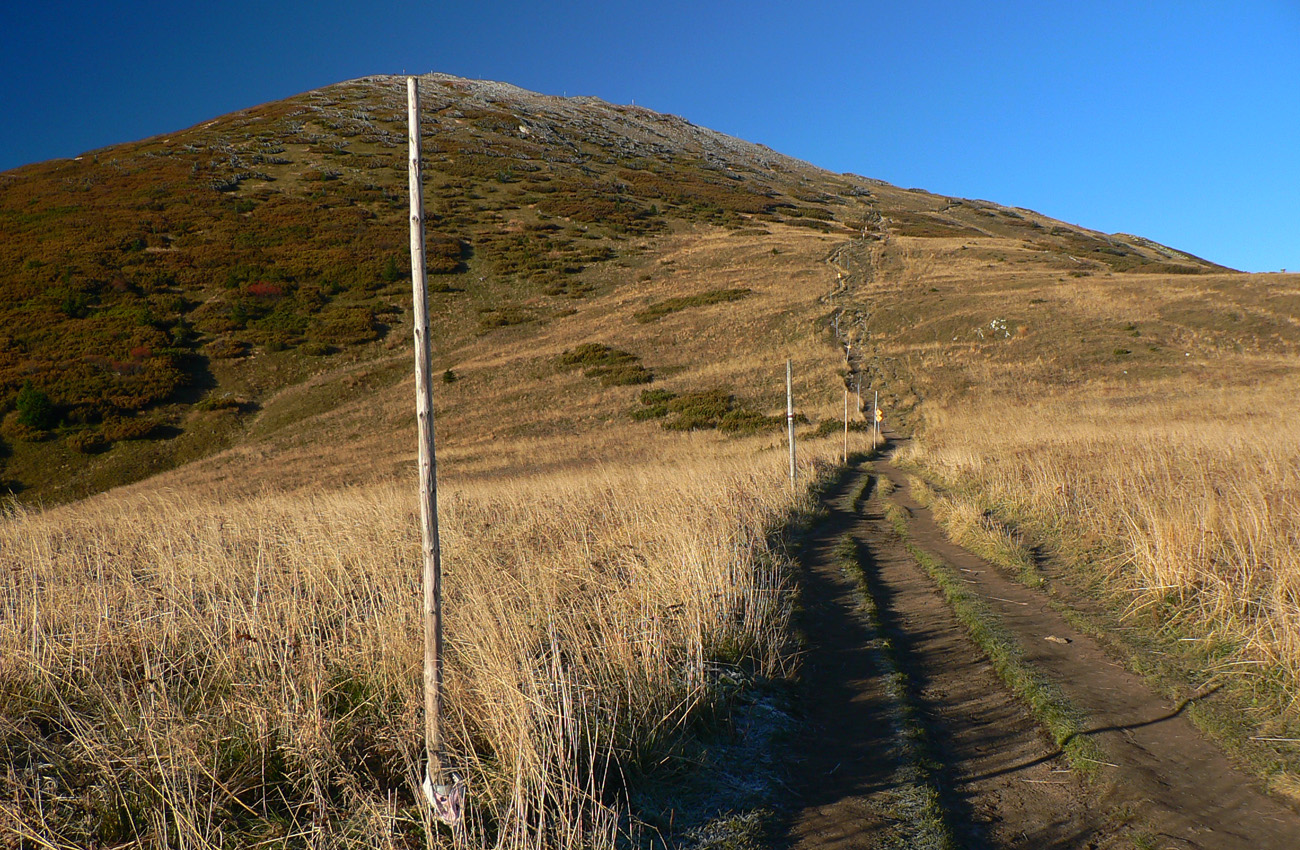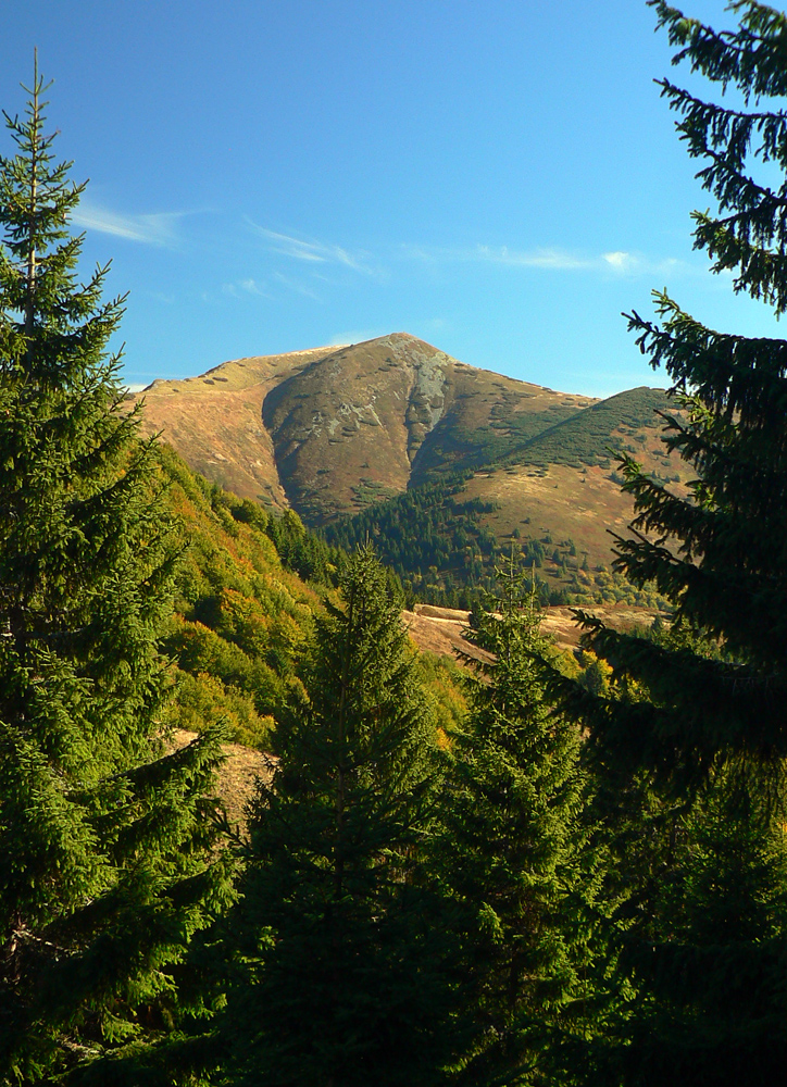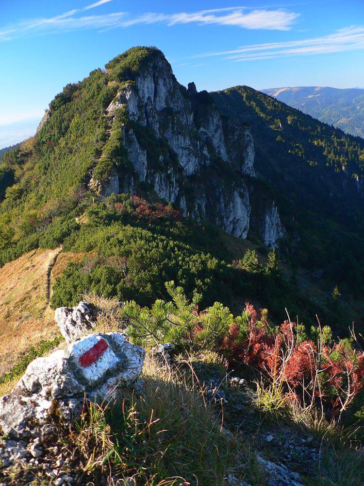 Ale zas až tak som nešibal do koní, aby som nefotil - to počasie proste nútilo každú chvíľu zastaviť a obdivovať panorámy jednej z najkrajších slovenských hrebeňoviek. Ráno síce ma prízemný mrázik a kosa v tieni hnali hore kopcom rezkejšie, ale už na Veľkom Kriváni to bolo skoro na tričko, bez vetra. Len sobotňajšia námraza ticho cupotala dole z kosodreviny a na chodníkoch, k slnku otočených, bolo trošku slizko z roztopeného srieňa. Bol som tam skoro presne na chlp ako pred dvoma rokmi (odkaz je nižšie), aj keď vtedy som na hrebeni mohol stráviť dvojnásobok času. Hlavne som ale mohol porovnať, ako vtedy farby jesene nastúpili oveľa skôr - vidno to aj na fotkách. Teraz ešte v lese prevládali odtiene zelenej a nad lesom to tiež ešte nebolo až tak do hrdzava.