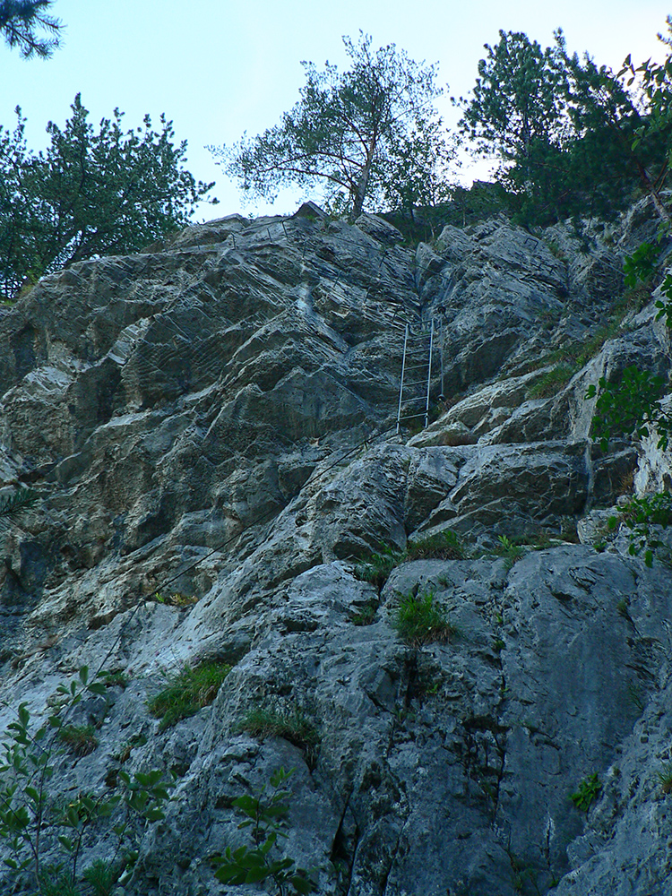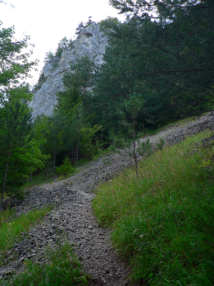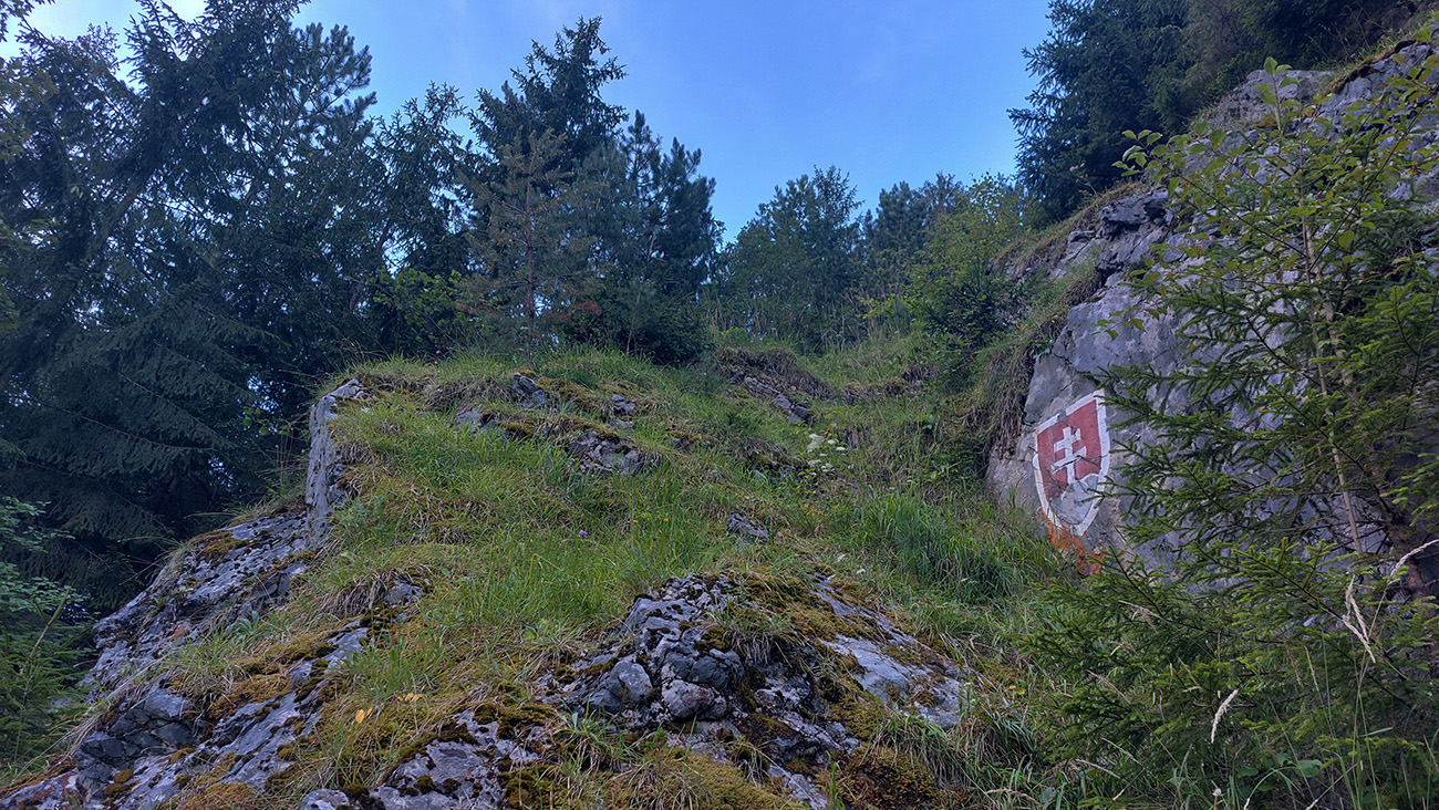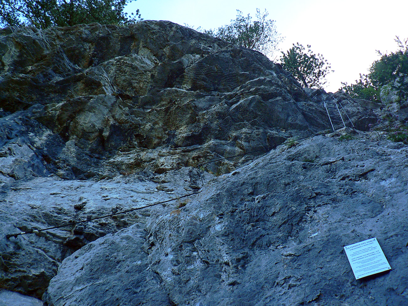 Dole dolinou len kúsok, minul som výjazd z bajktrailu Anakonda (TU) a o chvíľu už ma ťahala výrazná odbočka doprava, do starého lomu pod Hoblíkom. Na jeho začiatku zas doprava – ani tu sa nedá minúť odbočka z rovného do strmého chodníka, ktorý cikcakmi neomylne vedie hore, v ústrety bralám. A k nástupu do cvičnej ferraty, ktorej železo je ale zavesené dostatočne vysoko, aby nevybavených náhodných okoloidúcich veľmi nelákalo štverať sa hore. Aj pokyny na ceduľke hovoria jasne. Na vyhliadku nad ferratou sa dá dostať samozrejme zhora po chodníku.