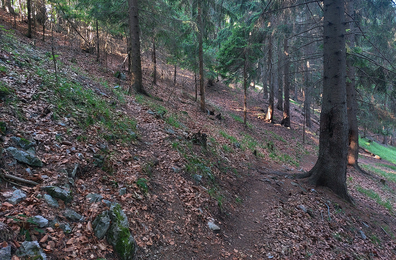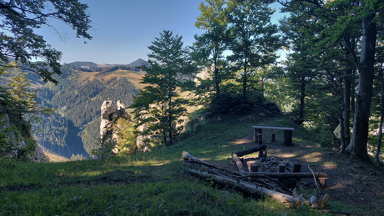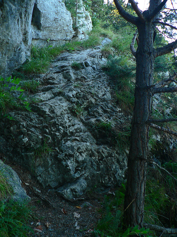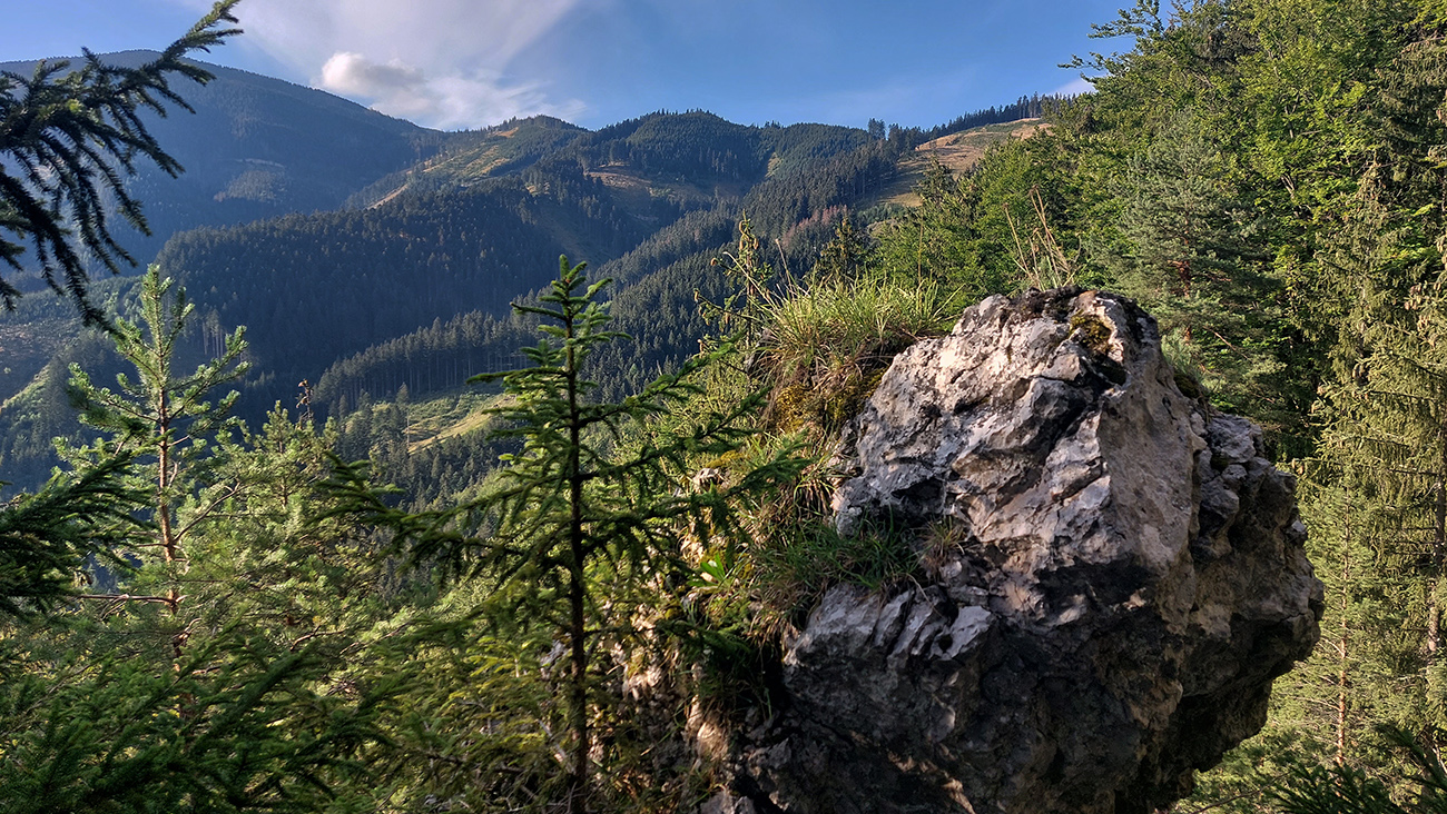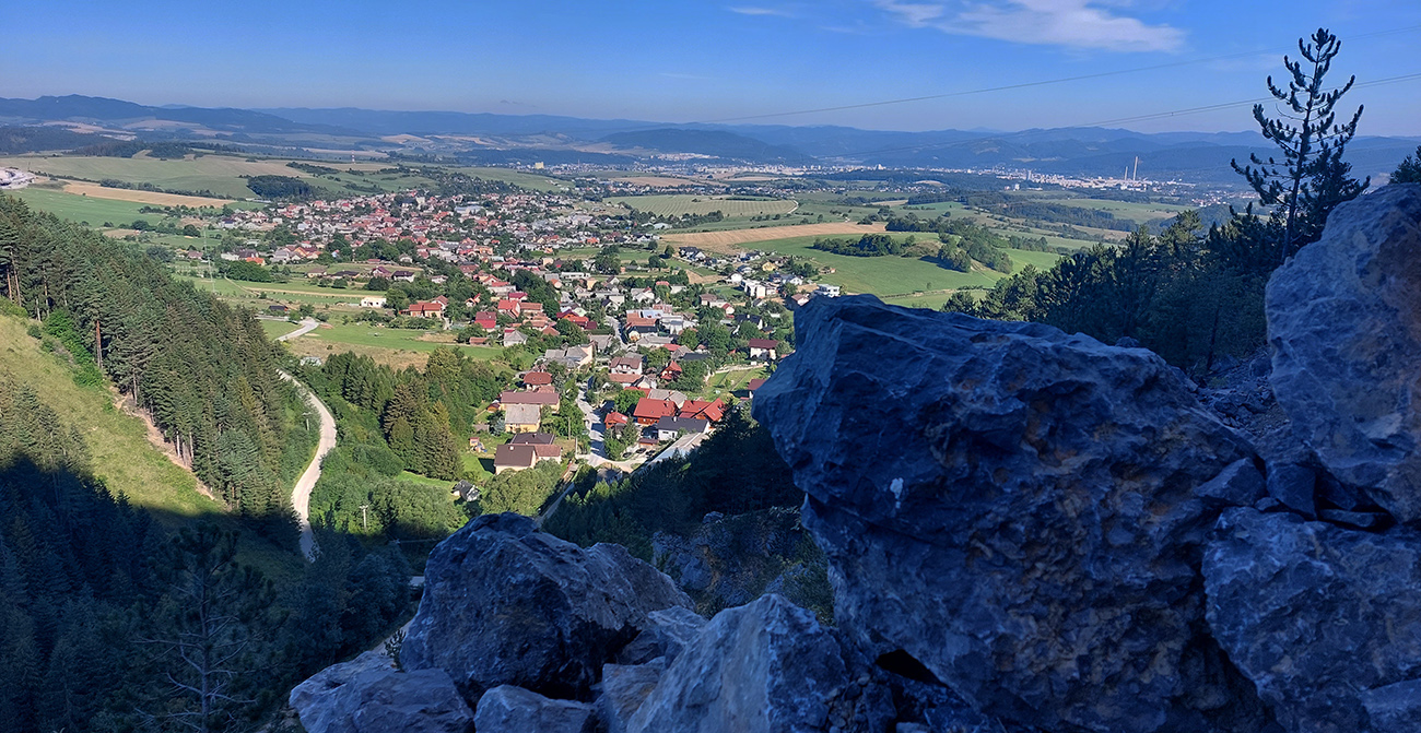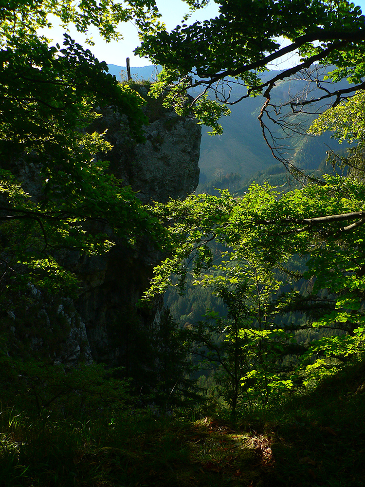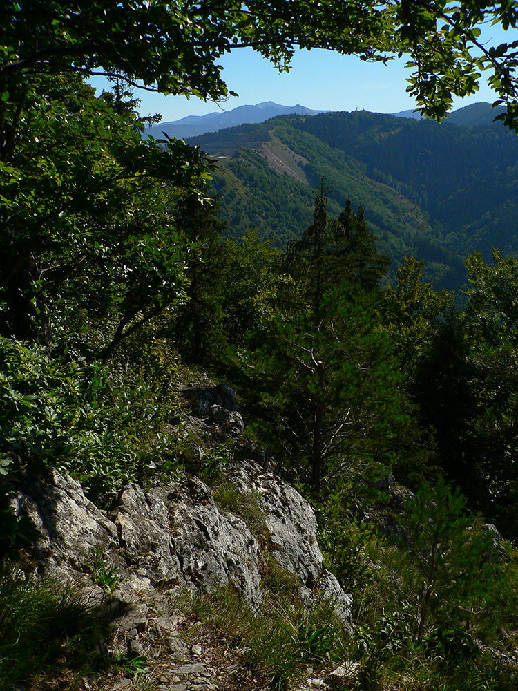 Potom ide chodník viac lesom, pohodlnejšie ako na Valientovom dieli (menší sklon aj menej suti pod nohami). A nie je to jednosmerka, dá sa tu motať pomedzi skaly a odskakovať na viaceré vyhliadky. Zostup na druhú stranu je poriadne prudký až do sedielka, kde sú zasa dve možnosti. Prvá je doprava - spomínaný záver Anakondy, veľmi pekný chodník. Ale ten som už spoznal, tak som to stočil doľava na „obchvat“ Hoblíka z východu. Tiež veľmi pekný singlík, aj popri ňom sú početné malé bralká. Záver má strmší, spája sa so zostupovým chodníkom priamo z vrcholu a lezie z lesa pod stožiarom elektrického vedenia. Tam si už každý vyberie, či sa hodí doľava a strmo zostúpi chodníkom do doliny, alebo menej strmo po ceste doprava, na lúku nad dedinou.
