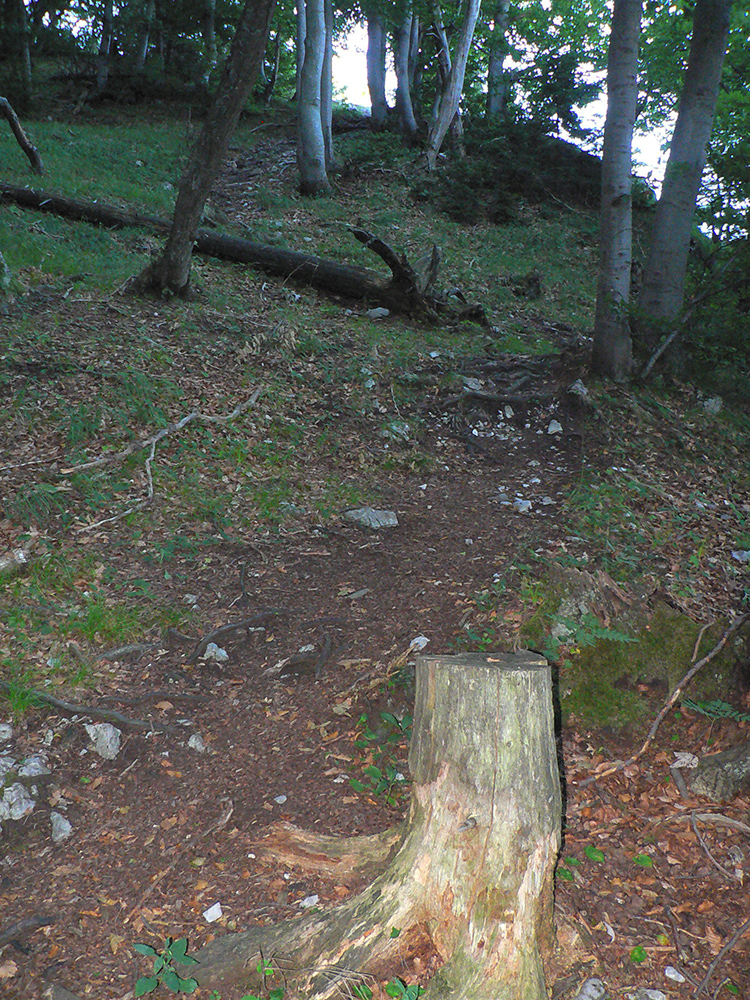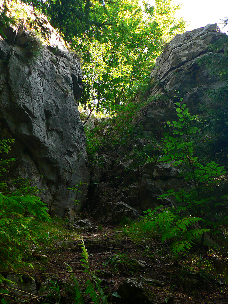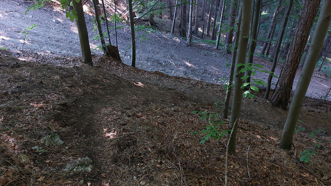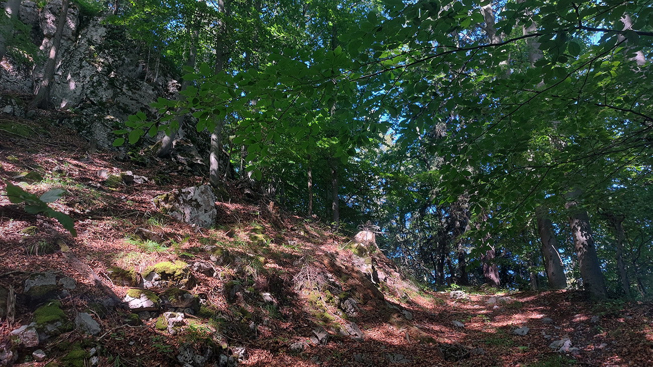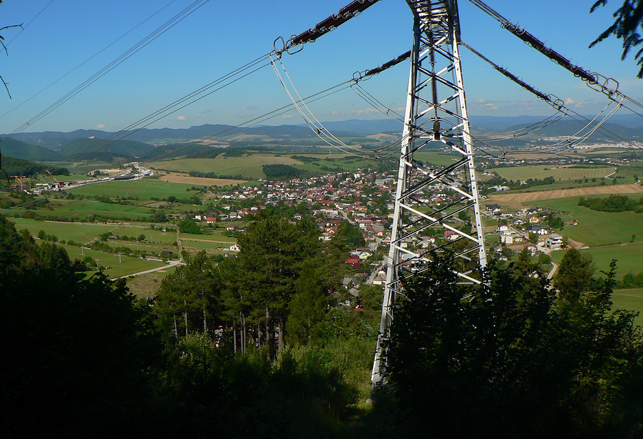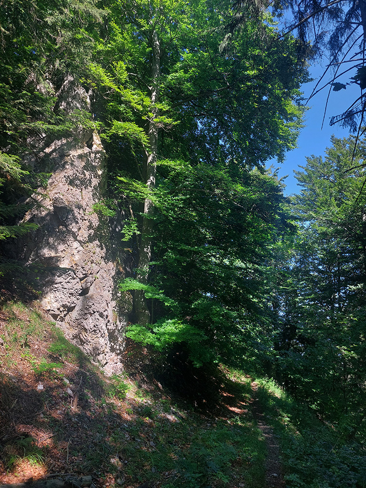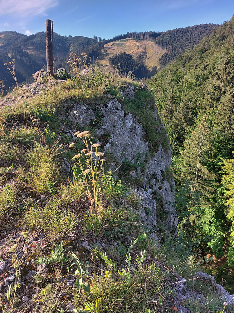 Potom ide chodník viac lesom, pohodlnejšie ako na Valientovom dieli (menší sklon aj menej suti pod nohami). A nie je to jednosmerka, dá sa tu motať pomedzi skaly a odskakovať na viaceré vyhliadky. Zostup na druhú stranu je poriadne prudký až do sedielka, kde sú zasa dve možnosti. Prvá je doprava - spomínaný záver Anakondy, veľmi pekný chodník. Ale ten som už spoznal, tak som to stočil doľava na „obchvat“ Hoblíka z východu. Tiež veľmi pekný singlík, aj popri ňom sú početné malé bralká. Záver má strmší, spája sa so zostupovým chodníkom priamo z vrcholu a lezie z lesa pod stožiarom elektrického vedenia. Tam si už každý vyberie, či sa hodí doľava a strmo zostúpi chodníkom do doliny, alebo menej strmo po ceste doprava, na lúku nad dedinou.
