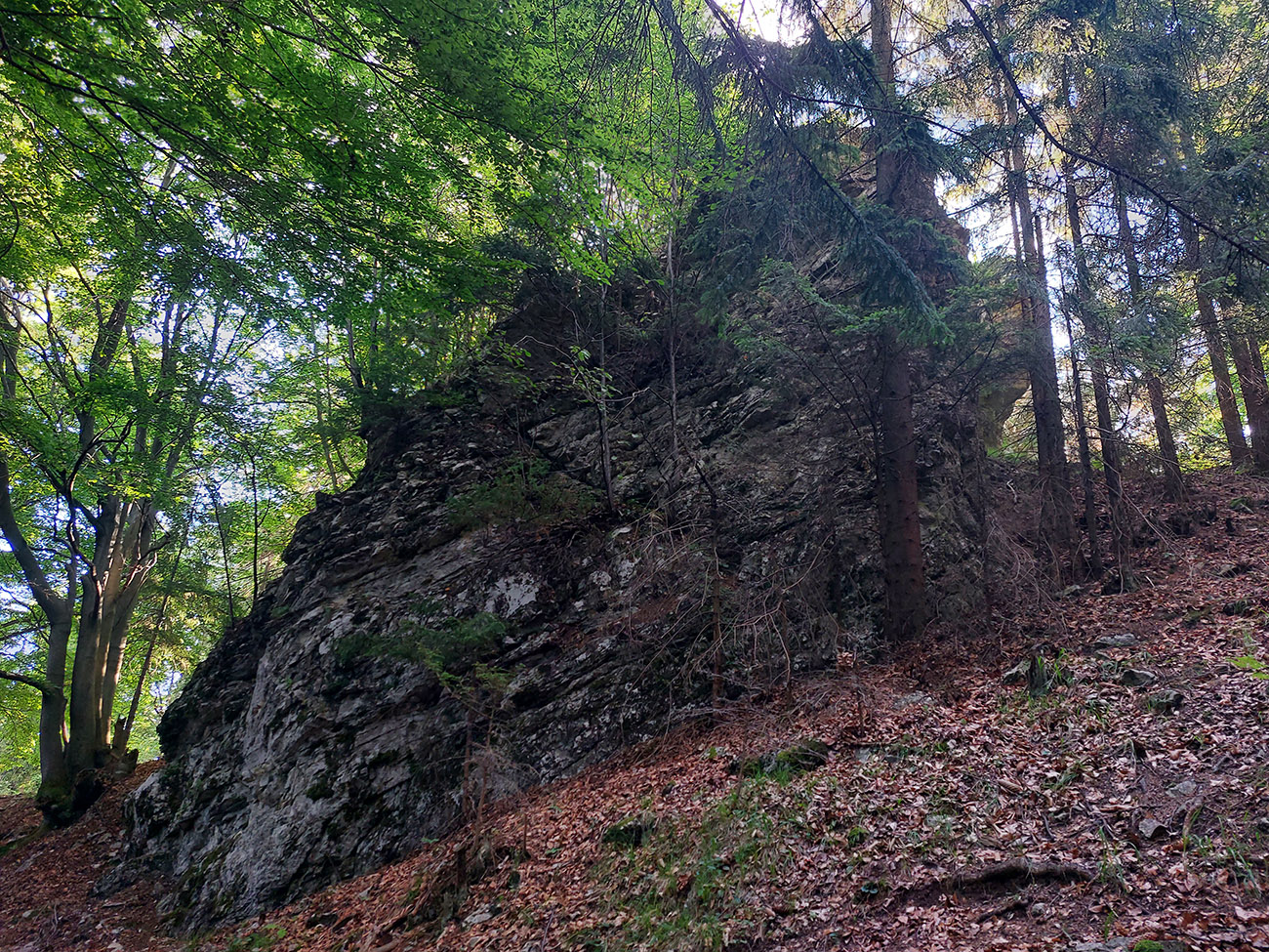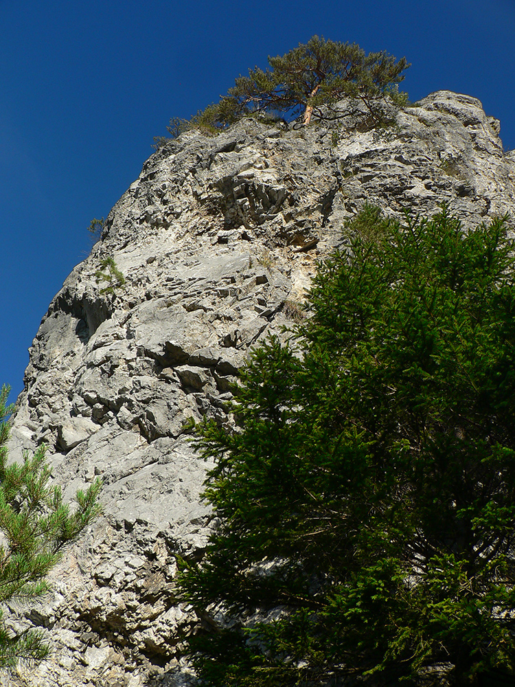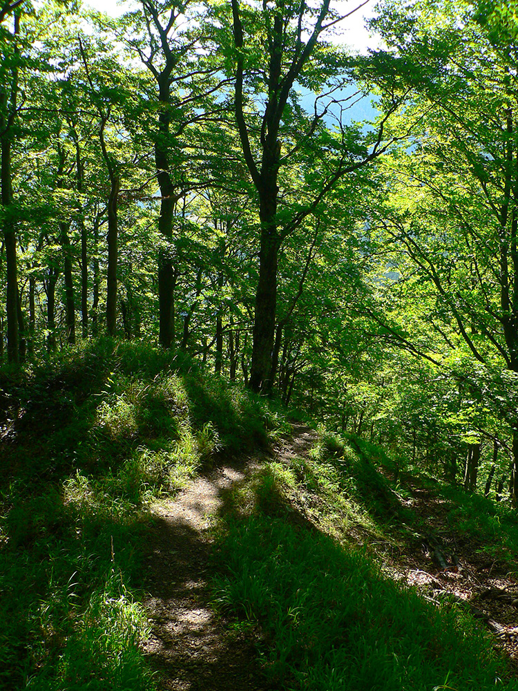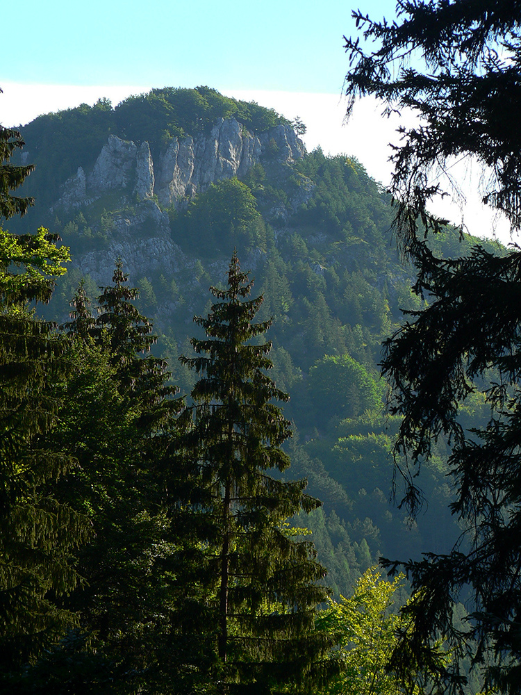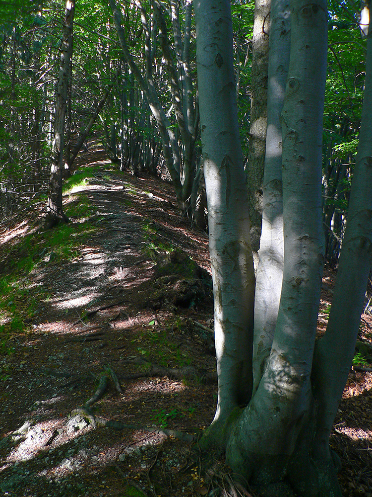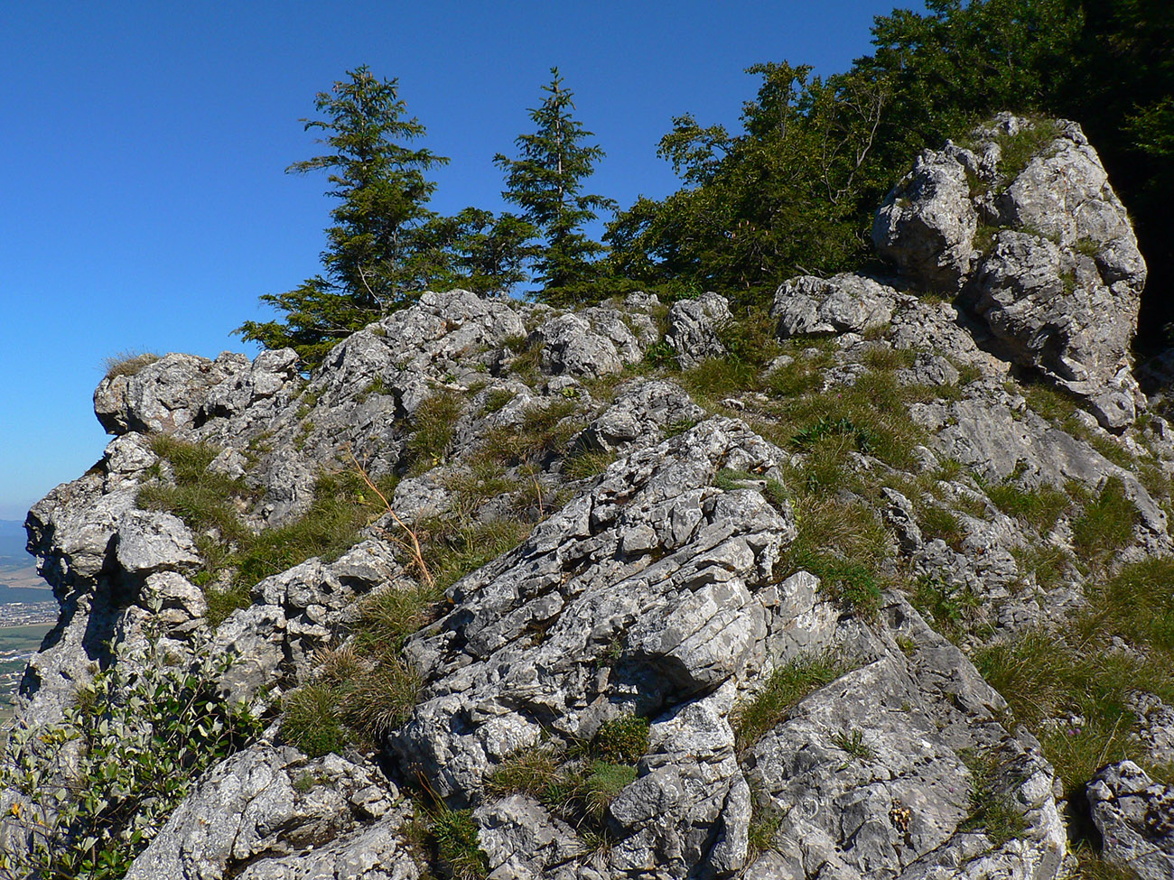 Potom ide chodník viac lesom, pohodlnejšie ako na Valientovom dieli (menší sklon aj menej suti pod nohami). A nie je to jednosmerka, dá sa tu motať pomedzi skaly a odskakovať na viaceré vyhliadky. Zostup na druhú stranu je poriadne prudký až do sedielka, kde sú zasa dve možnosti. Prvá je doprava - spomínaný záver Anakondy, veľmi pekný chodník. Ale ten som už spoznal, tak som to stočil doľava na „obchvat“ Hoblíka z východu. Tiež veľmi pekný singlík, aj popri ňom sú početné malé bralká. Záver má strmší, spája sa so zostupovým chodníkom priamo z vrcholu a lezie z lesa pod stožiarom elektrického vedenia. Tam si už každý vyberie, či sa hodí doľava a strmo zostúpi chodníkom do doliny, alebo menej strmo po ceste doprava, na lúku nad dedinou.