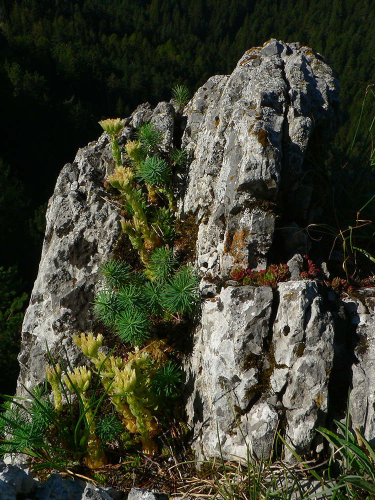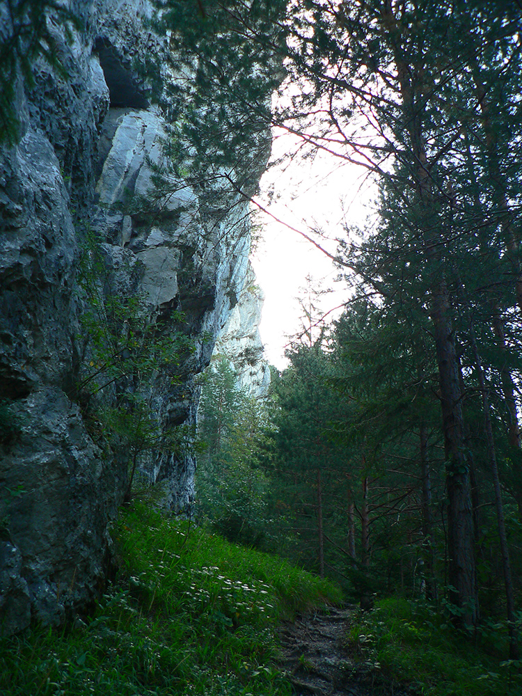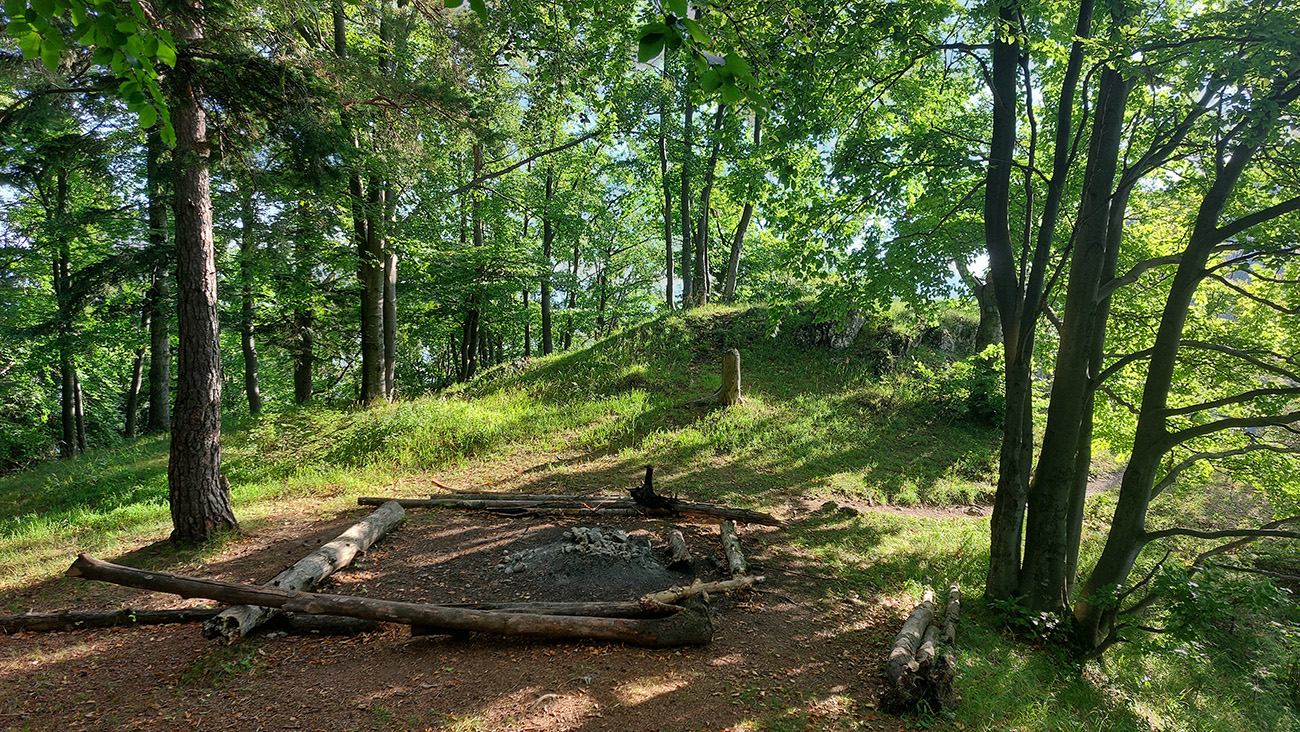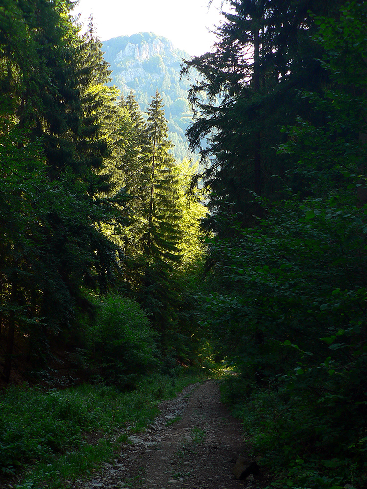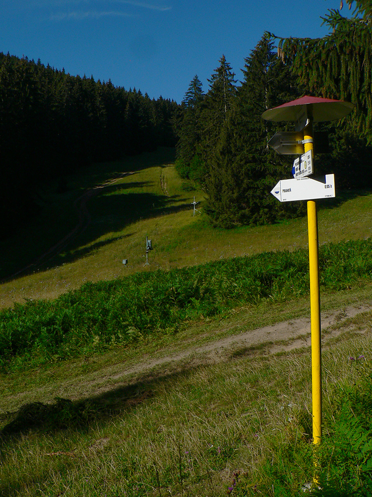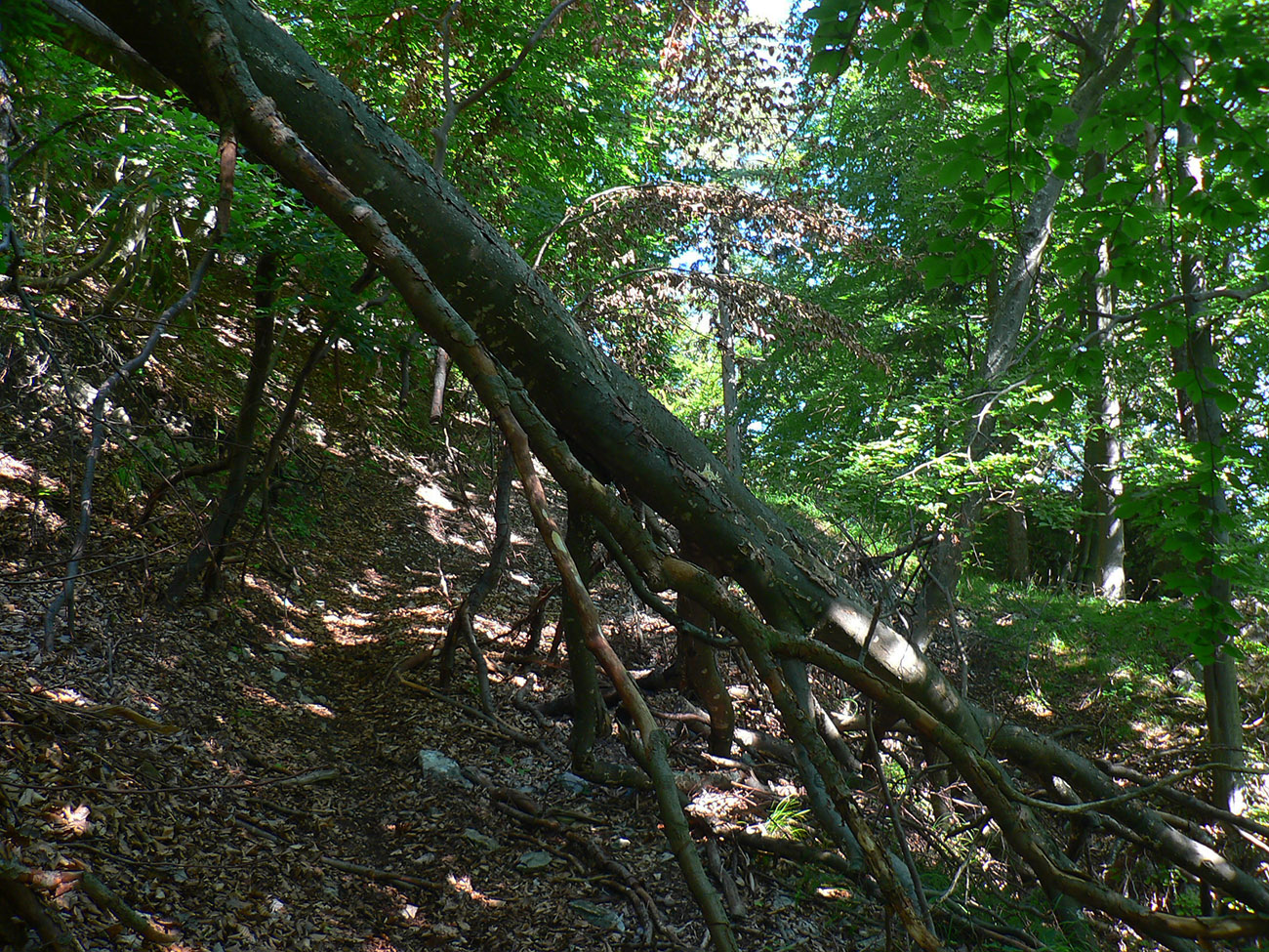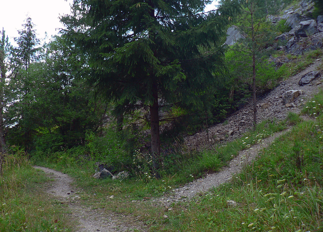 Potom ide chodník viac lesom, pohodlnejšie ako na Valientovom dieli (menší sklon aj menej suti pod nohami). A nie je to jednosmerka, dá sa tu motať pomedzi skaly a odskakovať na viaceré vyhliadky. Zostup na druhú stranu je poriadne prudký až do sedielka, kde sú zasa dve možnosti. Prvá je doprava - spomínaný záver Anakondy, veľmi pekný chodník. Ale ten som už spoznal, tak som to stočil doľava na „obchvat“ Hoblíka z východu. Tiež veľmi pekný singlík, aj popri ňom sú početné malé bralká. Záver má strmší, spája sa so zostupovým chodníkom priamo z vrcholu a lezie z lesa pod stožiarom elektrického vedenia. Tam si už každý vyberie, či sa hodí doľava a strmo zostúpi chodníkom do doliny, alebo menej strmo po ceste doprava, na lúku nad dedinou.