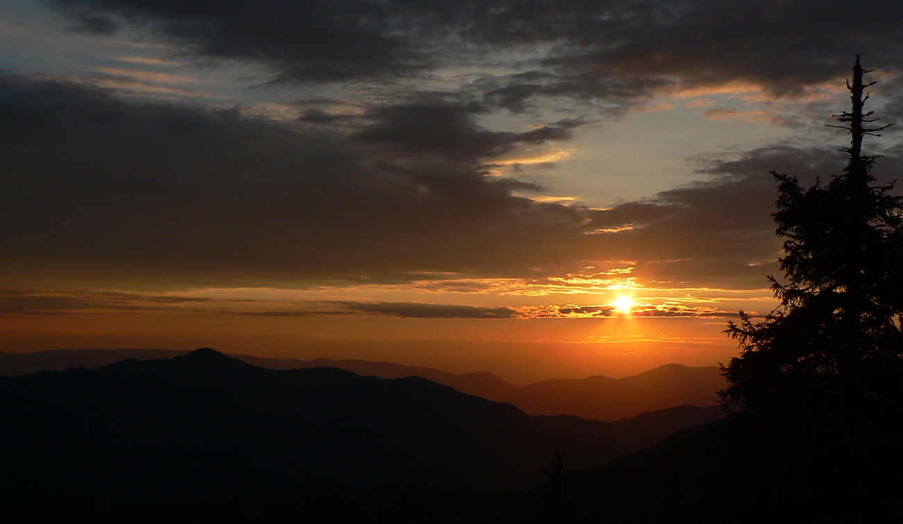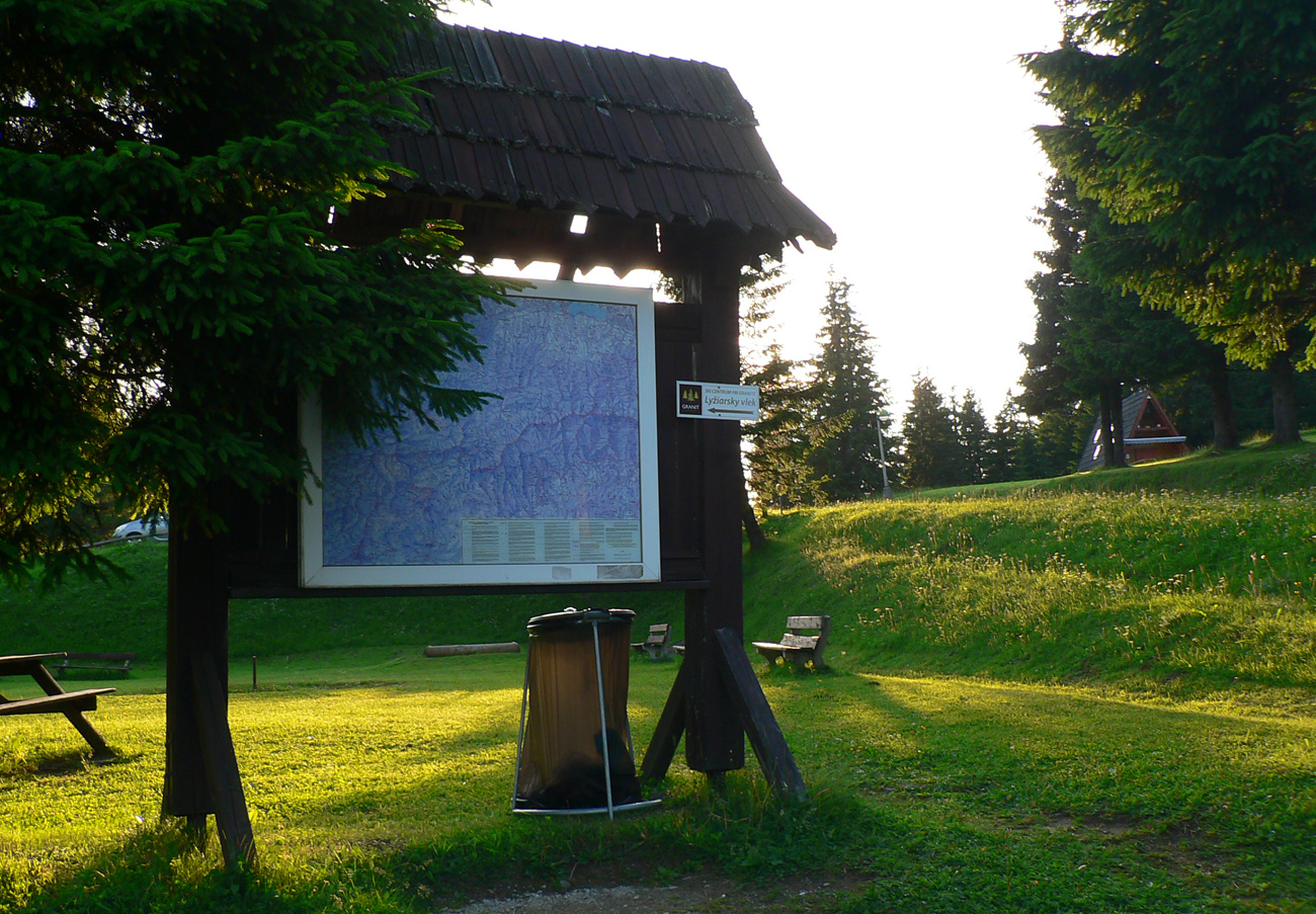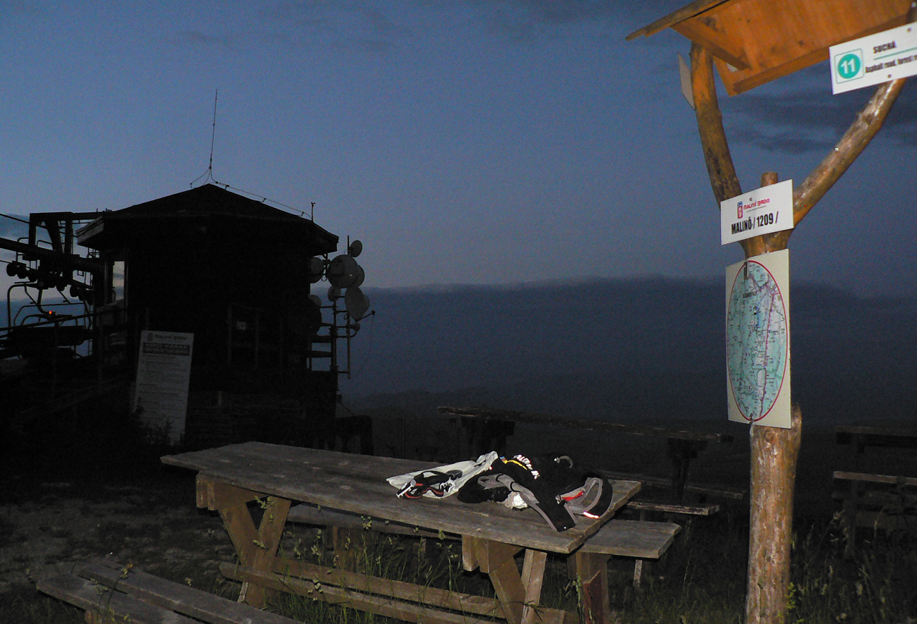 Medzi chatami, pri mape, taktická porada. U je síce nastavený ísť do Ľubochne, ale O už dlho vymýšľa otočiť to radšej do Ružomberka. Argumenty: krajinársky je to krajšie, mimo NP v noci, lepšie spoje domov. Jeden svoj zámer ale radšej ešte nespomína... U teda aspoň uprace batoh (treba čelovku nachystať) a na začiatku stúpania piaty raz dotankuje. Kam tá voda mizne??? Vďaka gélom to teraz beží skoro samo a švihať už netreba, času dosť, takže pohoda. A tu je to už po širokých chodníkoch, dá sa aj obzerať. Pár vyplašených kopytníkov, ktoré sa so súmrakom odvažujú na chodník vylizovať odhodené obaly po turistických prasatách, pár posledných výletníkov a slnko nad obzorom vyrába neskutočné oranžové exhibície. Nadobro sa ukrýva za Vyšným Šiprúnskym sedlom. Na lúkach smerom pod Vtáčnik začína O tak nenápadne: vieš, máme skoro tri hodiny do vlaku...