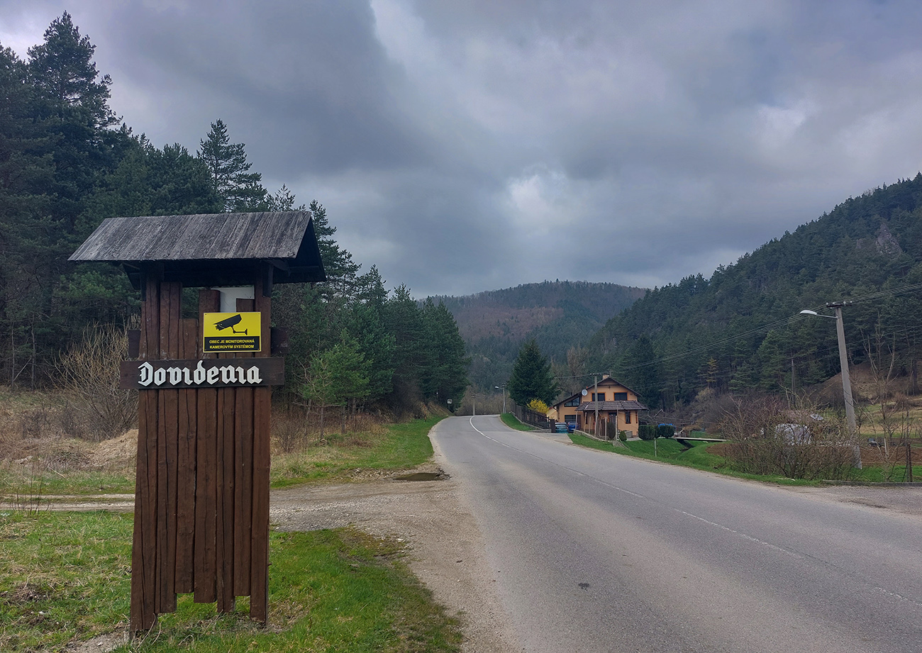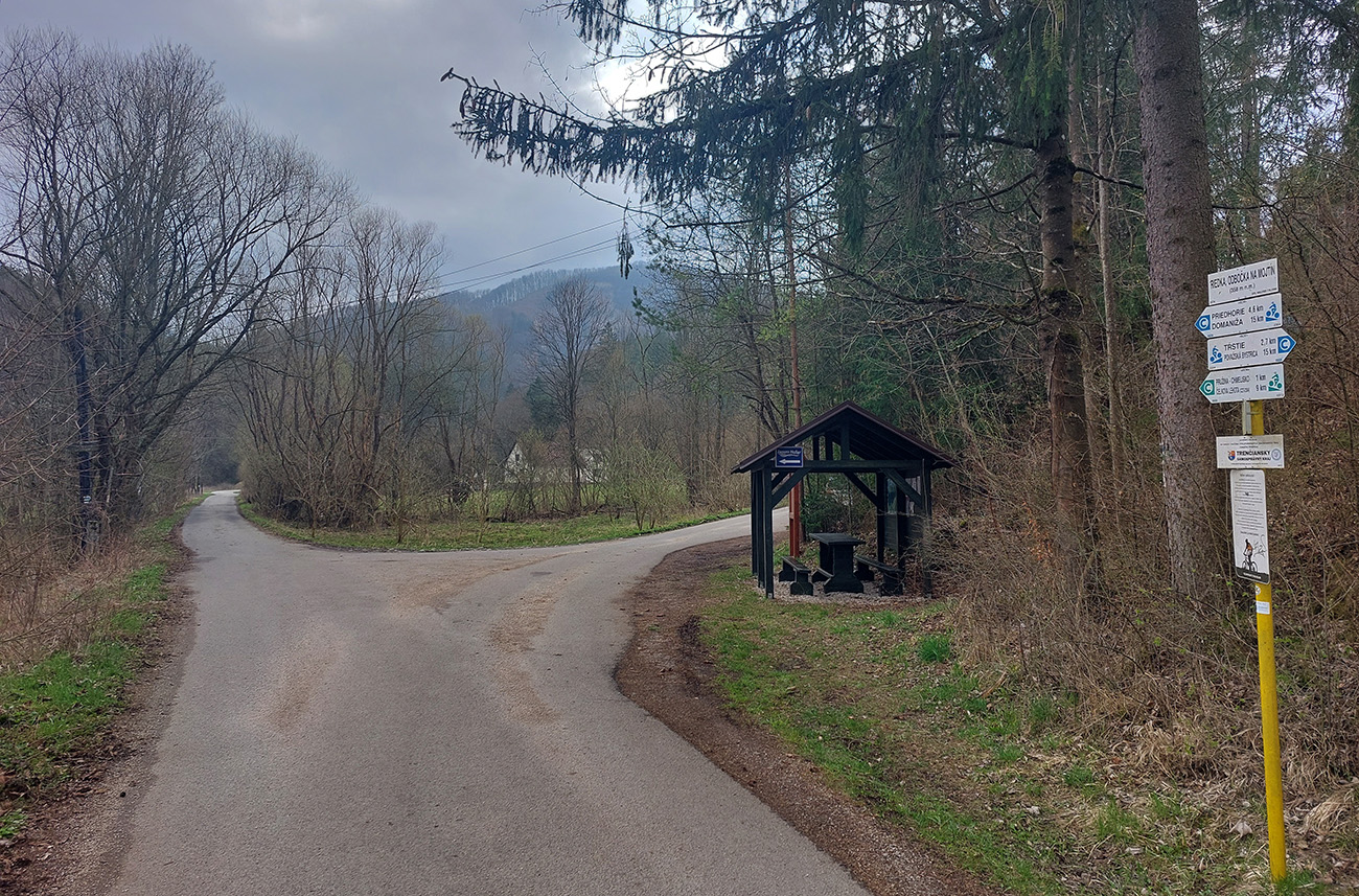Hore som to otočil pri veľkonočne vyzdobenej zastávke autobusu a davaj nazad. Pôvodne som mal síce v pláne zokruhovať to cez Belušské Slatiny a znova cez Visolaje, ale pod tým strmým kilometrom, na odbočke do Hluchej doliny, vyzeral byť asfalt tiež prudko použiteľný, tak som radšej išiel opáčiť tam. A dobre som spravil – dolina tiež veľmi pekná, braliek a skaliek požehnane, pod kolesami hladko, stúpanie príjemné. Otočil som to tam, kde asfalt skončil – na spodnom okraji lúky, pod nejakou chatou, na skok od Zliechova: