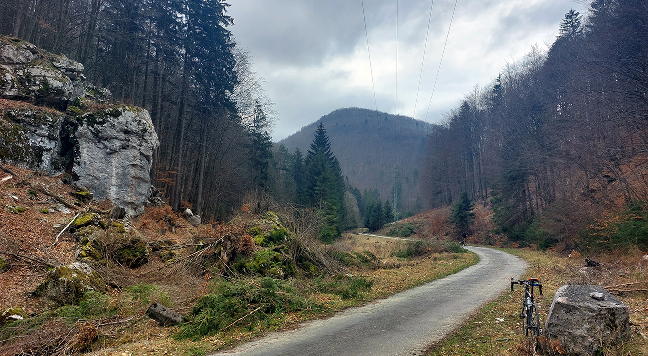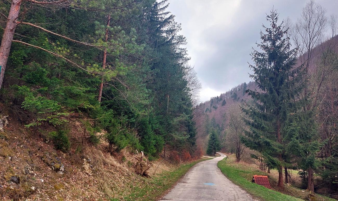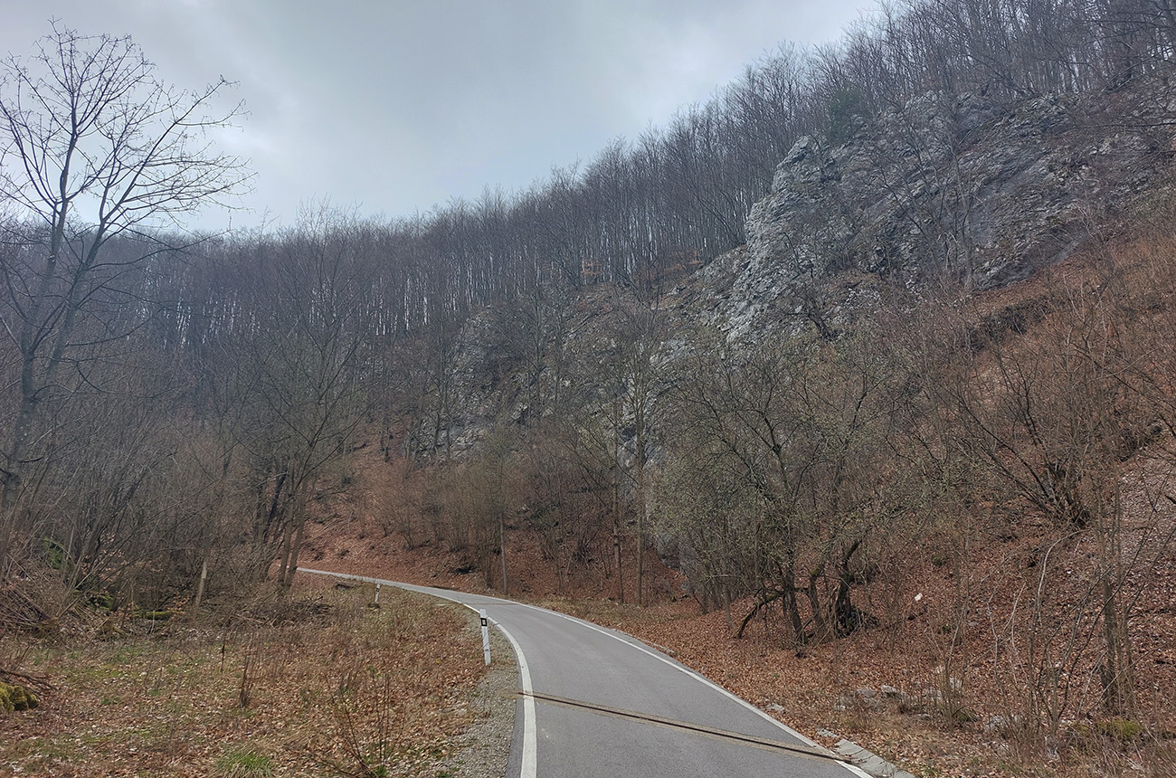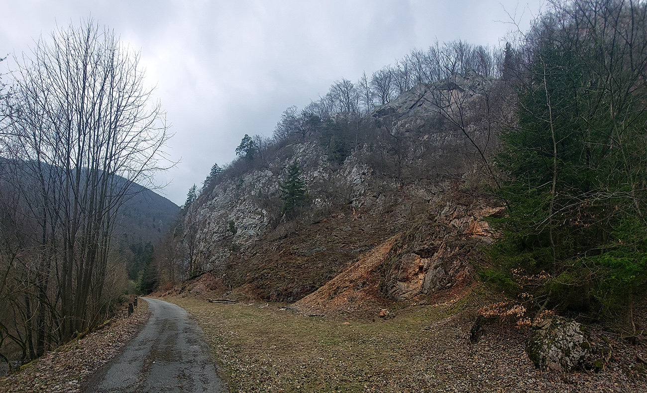 Dolinka pekná, pomedzi stále holé stromy pekné výhľady na bralnaté svahy. Zimný posyp na ceste ešte v hojných množstvách síce, ale zo stopy vyhádzaný autami, no proste paráda! Takéto cesty, čím po nich človek ide hlbšie do lesa, tým sú horšie, tu ale presne naopak – a dokonca posledný, superstrmý kilometer pod Mojtínom čisto nová cesta. Len bolo treba kolesá správne smerovať, kolmo cez široké odtokové jarky :-) Ako bonus ale nádherné skalné steny nad hlavou, no radosť sa trápiť. Lebo na tých 18% (podľa značky) mi zúfalo chýbali prevody, ale najmä nohy.