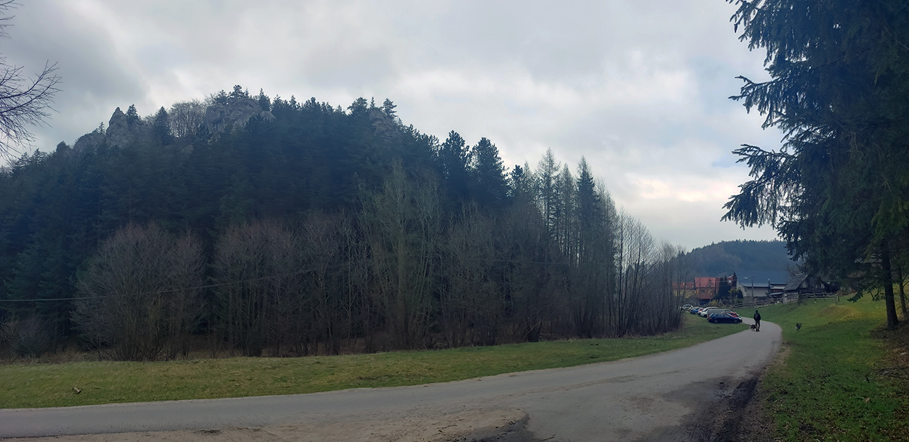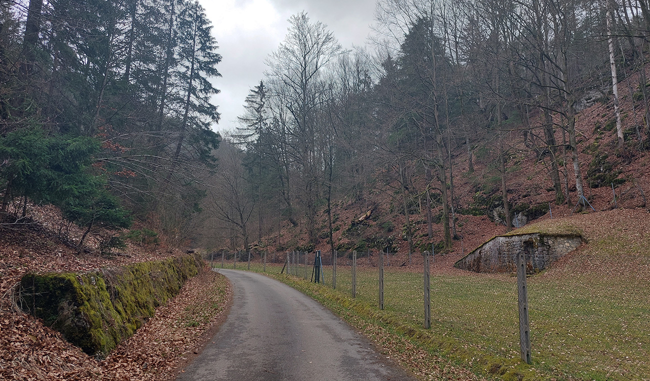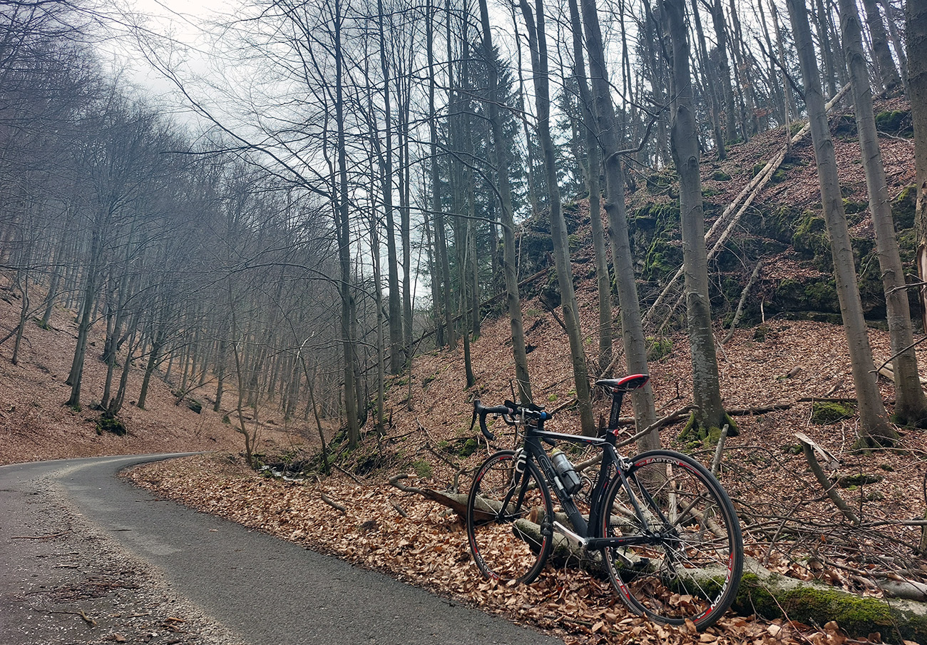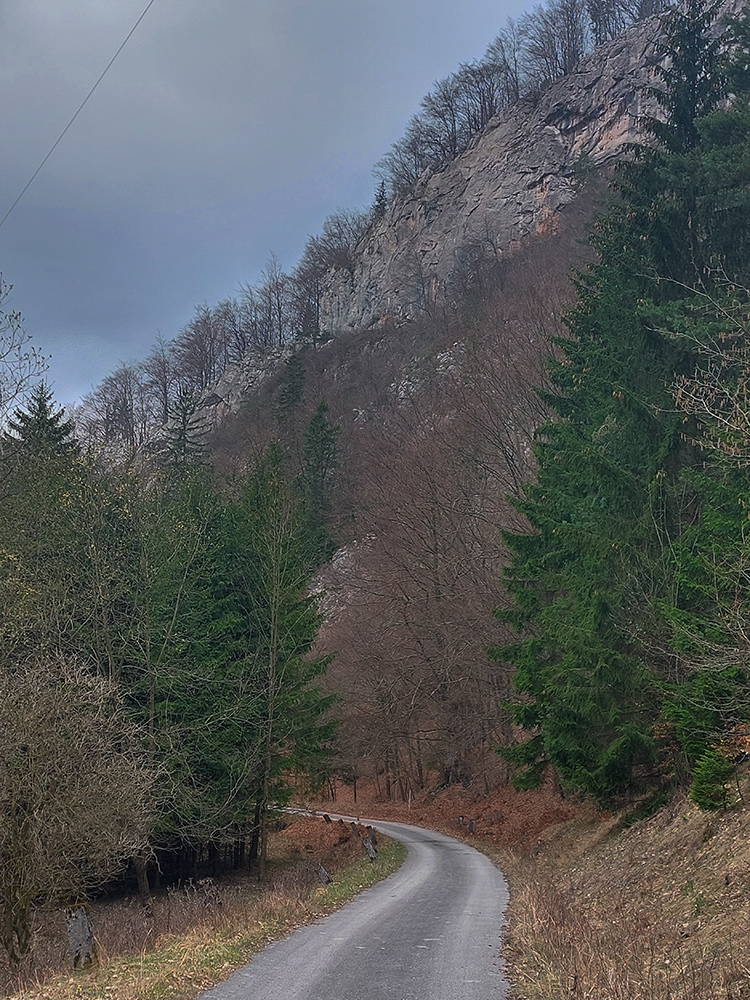 Dolinka pekná, pomedzi stále holé stromy pekné výhľady na bralnaté svahy. Zimný posyp na ceste ešte v hojných množstvách síce, ale zo stopy vyhádzaný autami, no proste paráda! Takéto cesty, čím po nich človek ide hlbšie do lesa, tým sú horšie, tu ale presne naopak – a dokonca posledný, superstrmý kilometer pod Mojtínom čisto nová cesta. Len bolo treba kolesá správne smerovať, kolmo cez široké odtokové jarky :-) Ako bonus ale nádherné skalné steny nad hlavou, no radosť sa trápiť. Lebo na tých 18% (podľa značky) mi zúfalo chýbali prevody, ale najmä nohy.