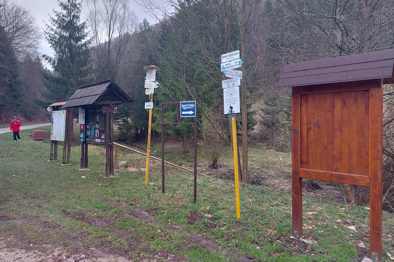 Rýchly fičák dole dolinou, nazad až na križovatku Riedka, a vrhol som sa doprava, vymeniac turistickú modrú za zelenú a cykloturistickú naopak, zelenú za modrú :-) Neďalekú odbočku cez Chmelisko do Pružiny som ignoroval, bol som zvedavý na dolinu Radotiná, smerom do Priedhoria. A parádna je, hladkosťou asfaltu, ale najmä krajinársky: znovu početné skalné steny a bralá nahusto rozhodené po svahoch, na dne početné záchyty prameňov pitnej vody. V doline už turistická pešia aj kolesová premávka hustla, cítil som sa v tej spoločnosti na cesťáku síce trochu cudzorodo, ale hrubšie gumy tu ozaj netreba. Jedinou výnimkou z miestnych pozitív tam aktuálne bola ukážka idiocie nejakého miestneho „zemepána“ – balvanmi zatarasená cesta. Podľa nápisu na transparente mu zrejme štát kafre do biznisu, tak prečo neuškodiť všetkým ostatným, že? Napríklad záchranárom či hasičom, keby potrebovali prejsť (foto v galérii).