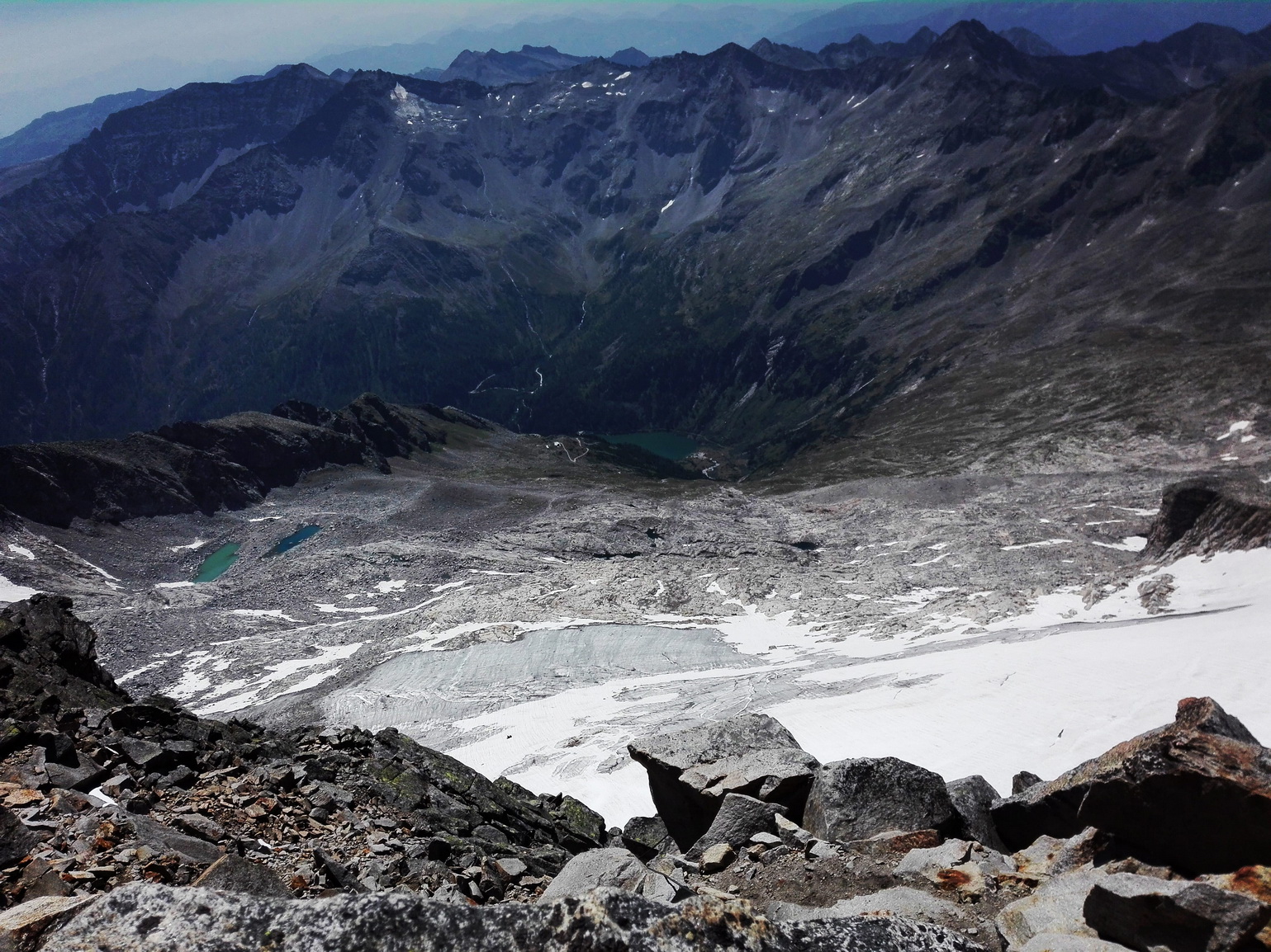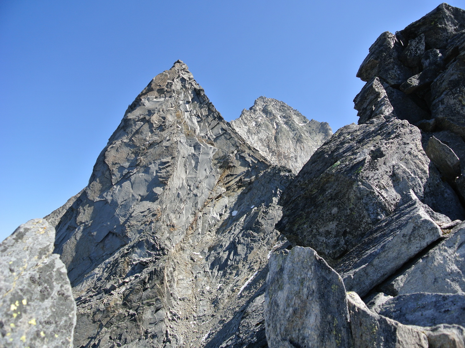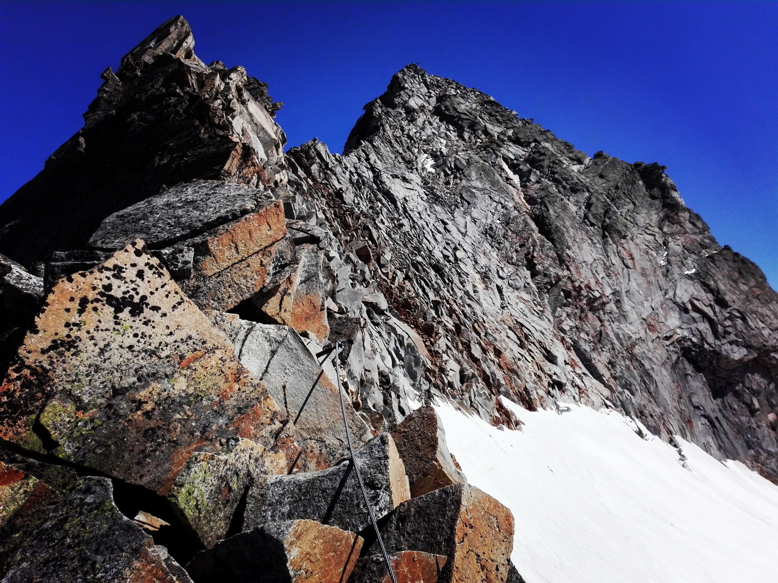 Lassacher Winkelscharte (2856m). Križovatka všetkých strán. Kto chce , môže ísť smer Sauleck, alebo poza dole do inej doliny na Celler Hutte. Pokračujem v smere Hochalmspitze a netrpezlivo vyčkávam na sľubovanú ferratu. Ale po nej ani stopy. Všade navôkol kamenný svet bez akýchkoľvek odtieňov zelenej, ani mach ani náznak trávy. Postupne plynulo sa dostávam na hrebeň, sem tam“ hore dole“ a“ hore dole“ , ktoré ma zavedie až k oceľovým lanám. Ferrata je B/C , výhľady sú niekedy ostré, plynie sa rýchlo, napriek mierne klzkej podrážke na neštastnej topánke. Na Hochalsmpitze sa vynáram o trištvrte na 12 . Vrchol je celkom zaľudnený, tak si svoju svačinku pošetrím na privátnejšie priestory výletu. Cvak , cvak, cvak, pridávam sa k fotografujúcej davovej psychóze a pokračujem v smere hrebeňa zostupujúco k Steinerne Mandln. Akýsi ujo mi po ceste povedal, že táto časť hrebeňa nie je až tak dobre zaistená atd. Možno mal pravdu, o niečo menej oceľových lán, stále však krásne do oči bijúce značenie na skalách.