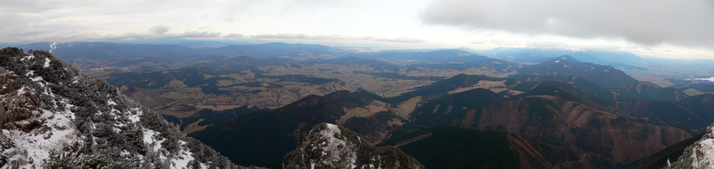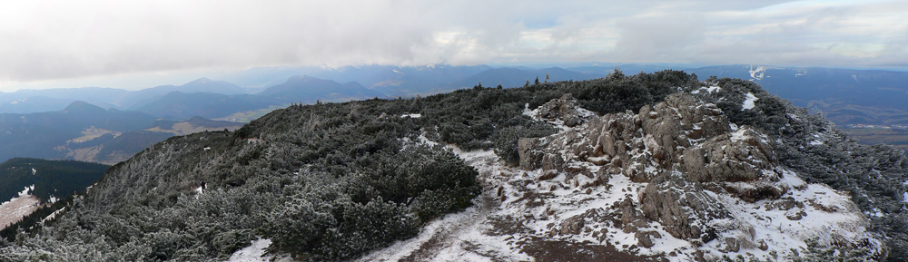 Záverečné kľučkovanie kosodrevinou na Choč je už pohodovka, aj keď miestami s trochou ľadu. Ale väčšinou je špinavý od blata, tak sa nekĺže. Z vrcholu si konečne raz užívam výhľady, aj keď je pod mrakom - doteraz som tu mal vždy šťastie len na vrcholovú hmlu. Zaujímavý je pohľad na sviežo zelené, dobre že nie rozkvitnuté januárové kotliny liptovsko-oravskie :-)