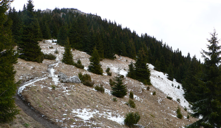 Dole k „hotelu“ na Strednej poľane sa púšťam po zelenej. Na tejto strane ani ten ľad už takmer nie je a už vôbec netreba využívať tyčovanie zimnej cesty na uľahčenie orientácie :-) Len pod hustými stromami v hustom tieni trochu šmykľavo ostalo. Inak hlina, šotolina. Viac sa šmýka v hornej časti posledného úseku zostupu, hneď pod poľanou – je to strmé, otočené na sever a v tieni hustého lesa. Ale po pár metroch už môžem obdivovať kamenné výtvory okolo chodníka, počínajúc Jánošíkovým stolom. Steny Solísk aj Tesných skaliek sa tisnú nad dolinu, ale akosi lepšie je ich vidieť pri pohľadoch dozadu. Pod nimi je po ceste zopár výdatných prameňov a nad dedinou všade samý vodojem a tabuľky ochranných pásiem vodných zdrojov.