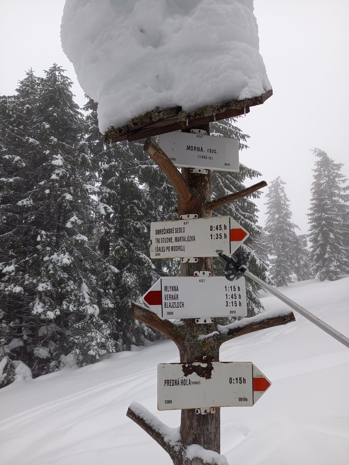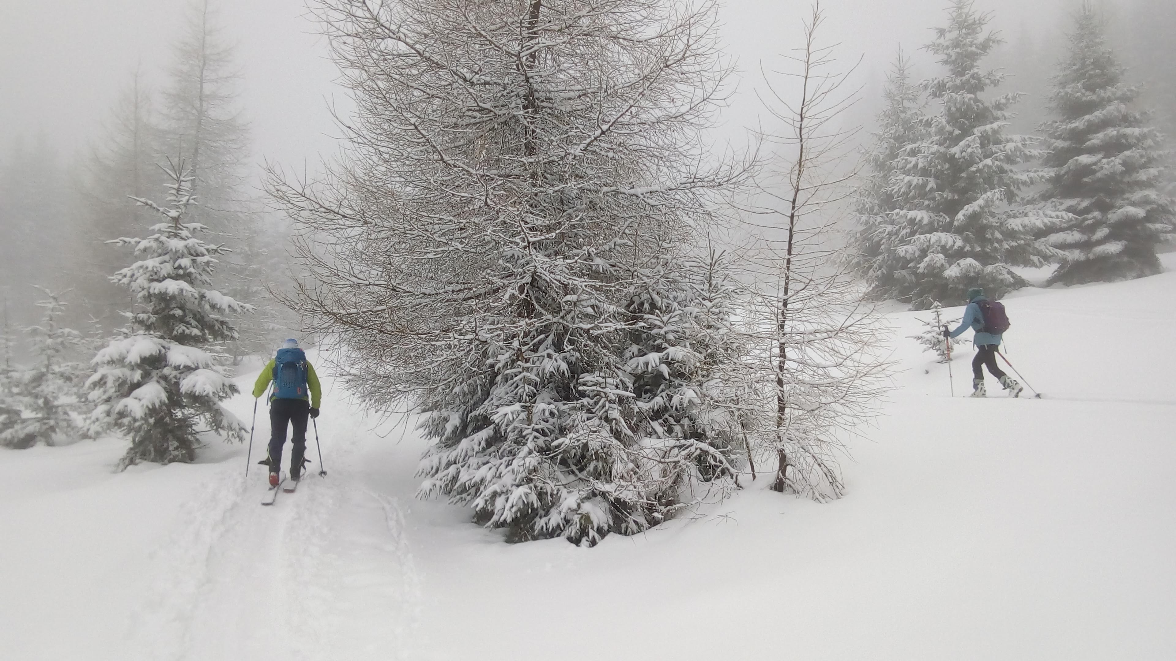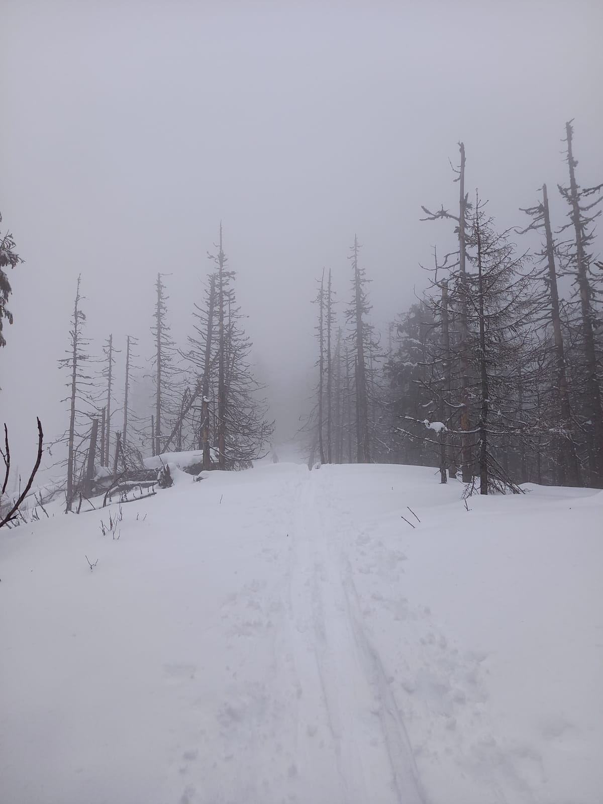 Na rázcestí Morna sa rozhodujeme pre dlhšiu variantu dookola cez Smrečiny, biela rozprávková krajina ako v hororovom filme láka stále neodolateľne ďalej a ďalej. Smrečianske sedlo, podľa smerovníka už len 2h40 na Kráľovu hoľu. Po čerstvej stope kľučkujeme neznačeným chodníkom na nižšiu Prednú hoľu 1545m, častý to cieľ miestnych freeriderov, aj náš. Vrchol aj celý výlet v hmle, výhľady na Kráľovku dnes nie. Konečne plošinka kde sa odopínajú pásy, iniciačné miesto každého skialpinistu. Unavené pásy a prázdne termosky do batohov, mierny odmäk aj vo februári, divná doba pokračuje, obliekať sa veľmi netreba. Hlavne zapnúť zipsy, putká, úchyty, prepnúť všetky sofistikované páčky do správnej polohy, všetci traja hlásime "pripravení" riadiacemu stredisku, môžu začať odpočítavanie.