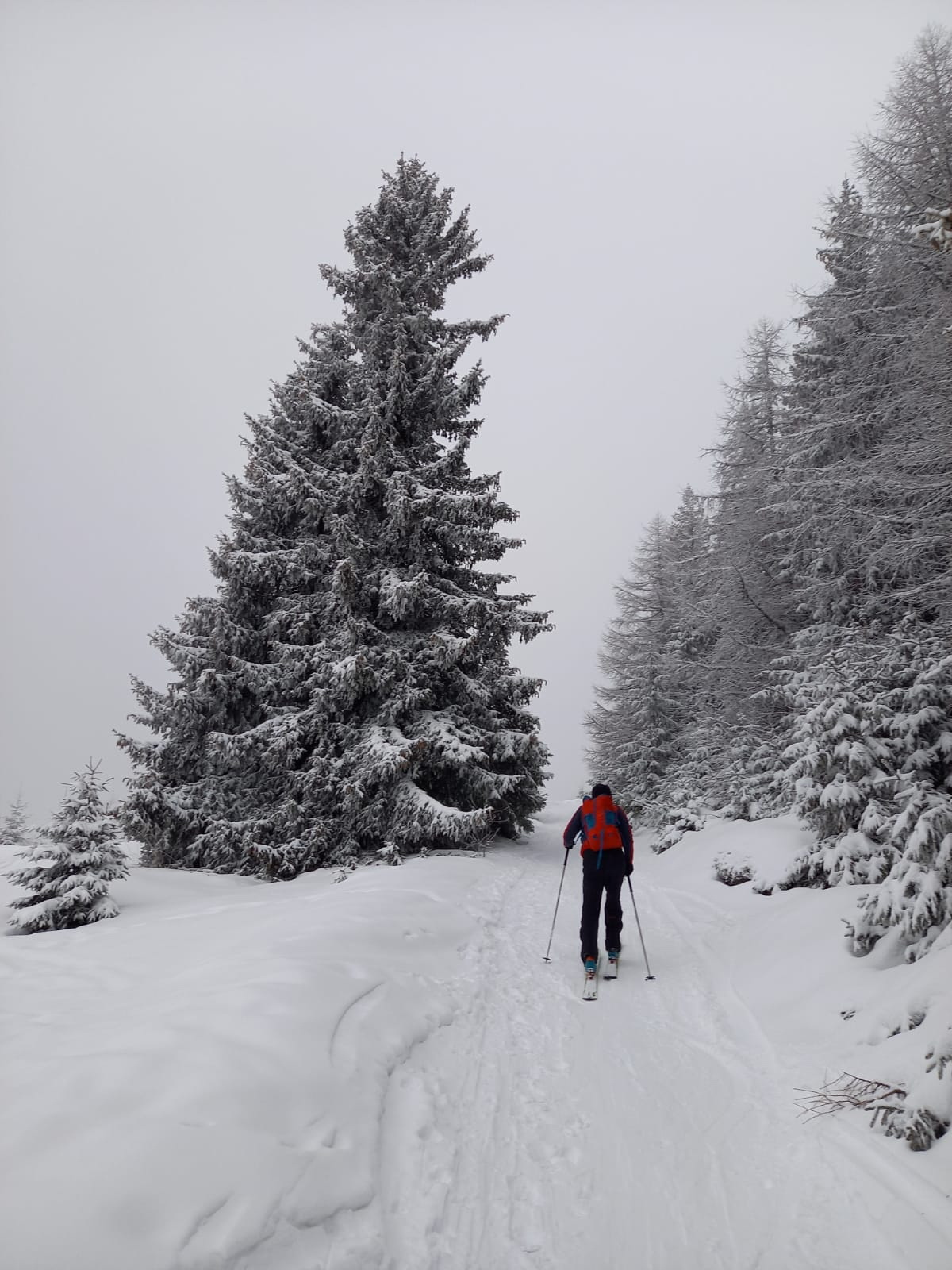 Začíname stúpať po zjazdovke skiareálu Vernár, na konci lana pokračujeme po červenej smer Kráľova hoľa. Úzke lesné koridory sa striedajú so širokými panenskými pláňami. Tadiaľ za pár hodín budeme svišťať dole! Všade ticho, ani lístok sa nepohne, samý ihličnan. Pár lyžiarov a snowbordistov kľučkuje oproti.