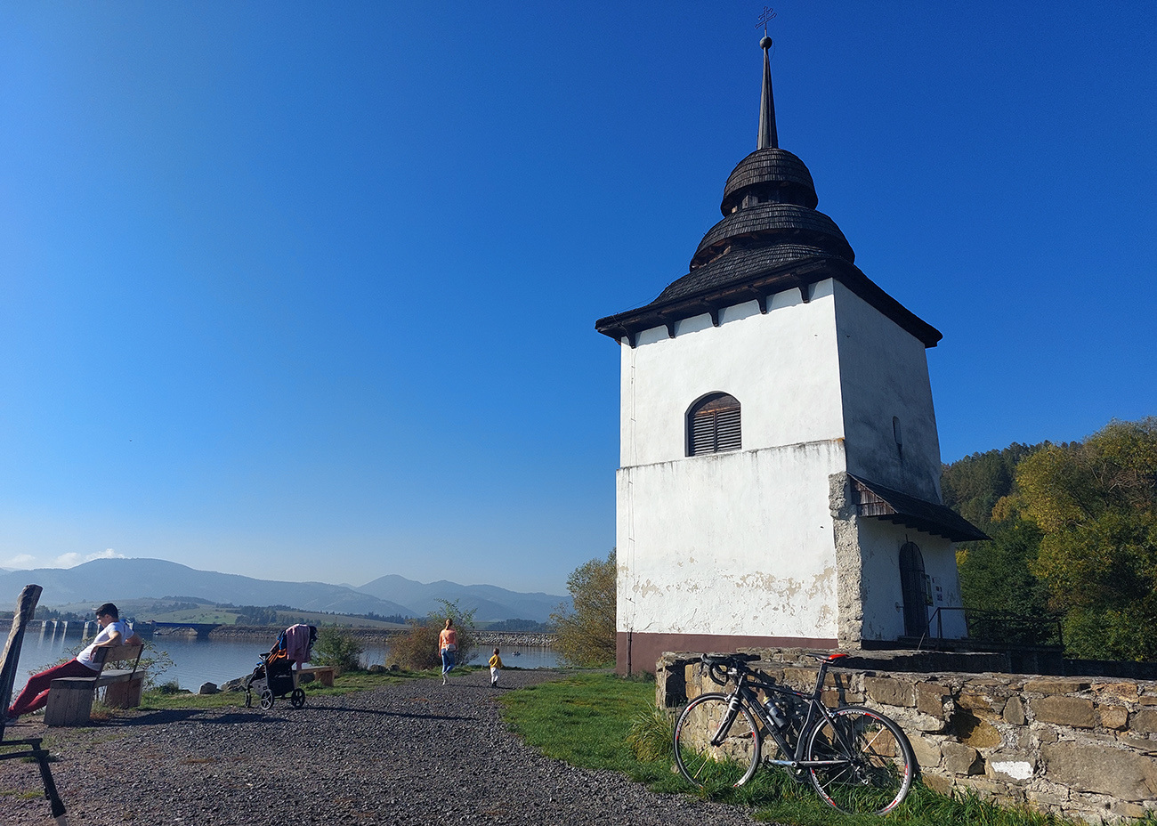 Nebol som tu pár rokov, tak len registrujem, ako sa všade vo veľkom stavia. Aj okolo križovatky v Bobrovníku, teda na ďalšej mojej odbočke. Aj o kúsok ďalej za ňou, kde už „prístavná infraštruktúra“ ozaj pripomína pobrežie mora. No najmä nesmiem vynechať ikonický kostolík na brehu priehrady – miesto, kde vznikajú fotky – kalendárovky, keď sa to vie. Ja samozrejme neviem, a okrem toho aj to protisvetlo a ešte rybári, ktorí autami dobre, že do vody nevlezú. Aj sem vedie cesta „na vlastné riziko“ a prepadliská na nej sú ešte exkluzívnejšie ako na tej predošlej. Asfalt ale stále super. Kúsok nad cestou a kostolíkom je inak aj známy archeopark Havránok, pripomínajúci tunajší život pred viac ako 2000 rokmi. Ale tam sa po hlinačke na cesťáku radšej netrepem.
