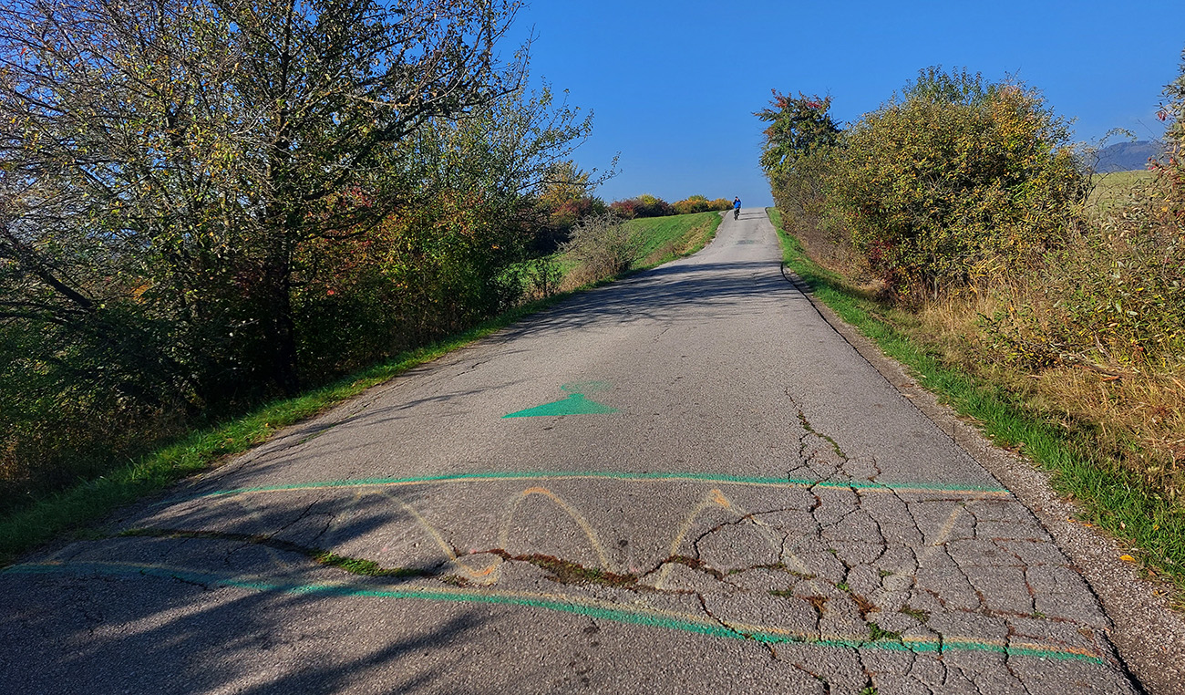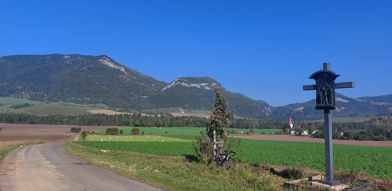 Aby som až do LM nešiel po hlavnej, odbočujem cez Sielnicu (cez centrum trochu hrboľatý asfalt), na jej konci pri Rybárni naskakujem na cestu do Zuberca a pred Matiašovcami fuk doprava, na ďalšiu neudržiavanú, cezpoľnú asfaltku cez kopček do Trnovca. Samozrejme zase na vlastné riziko. Mám ju zafixovanú ako opatrne jazditeľnú, a tak aj je. Takto na jeseň na ňu síce traktory navláčili niečo hliny, ale našťastie je sucho a podklad na pomalú jazdu hore kopcom dostatočne rovný. Len tesne pod vrcholom trochu tankodrom. Ale odmenou sú tu spätné panorámy Chočských vrchov pomedzi nedávno zasadené stromy a zastavenia kalvárie:
