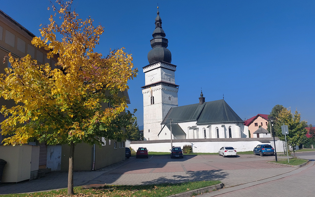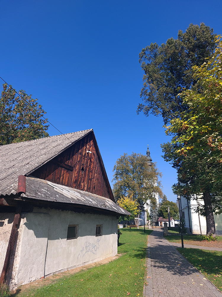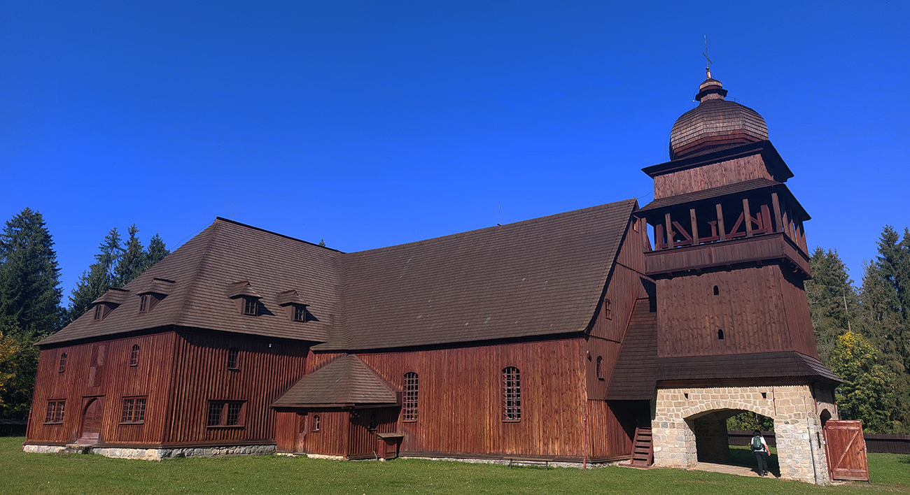 Predposlednú odbočku nemôžem minúť – zachádzka ku drevenému artikulárnemu kostolu nad dedinou Svätý Kríž sa oplatí. Je to grandiózna stavba, dnu je miesto pre 6000 ľudí! Akurát, že hore dedinou asfalt klasicky hrboľatie (tie naše slávne kanalizačné a plynovodné a ktovie aké ešte prípojky), za dedinou ešte viac a odbočka ku kostolu je poriadna vytriasačka. Ale kratučká, nevadí. Za odmenu mám kostol pekne nasvietený: