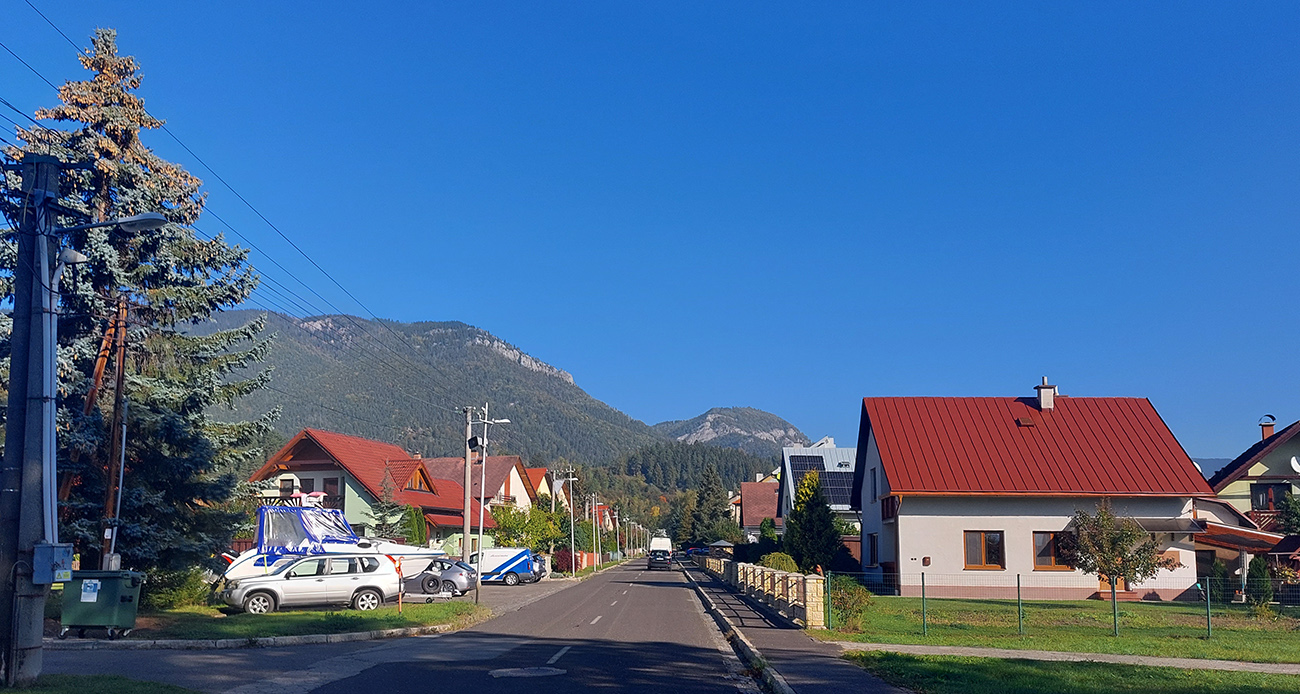 Zjazd dole do Trnovca potom už po hladšom, len na začiatku si treba párkrát pribrzdiť. Trnovec režem od začiatku po koniec, nech som na hlavnej čo najneskôr. Tu už takto pred poludním premávka hustne, ale v lete tu aj tak býva iný záhul - veď okolo ďalšieho akvaparku a ďalších, pridružených cirkusových atrakcií. A cesta tu nie je nadpriemerne široká. Do LM je to našťastie len kúsok, naľavo zase neúnavne pózujú Západné Tatry: