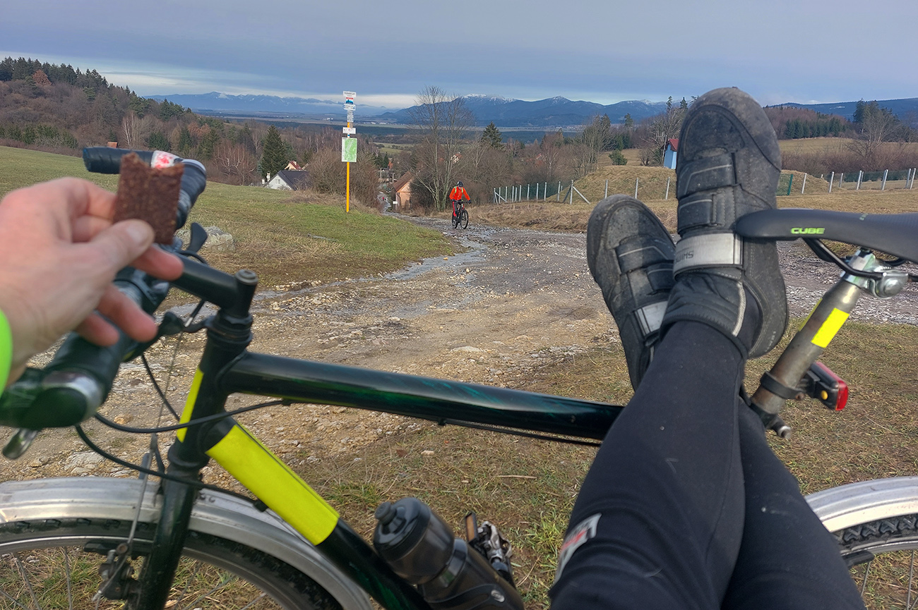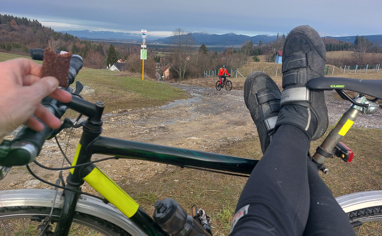 Obednú pauzu som si musel zaslúžiť – strmý je výšľap až nad horný koniec Skleného, ku krížu a smerovníku na Sklenianskych lúkach. No lavička už bola pekne osušená vetrom a počko parádne, výhľady nazad do kotliny tiež. A nebol som tam sám na bajku, si predstavte!