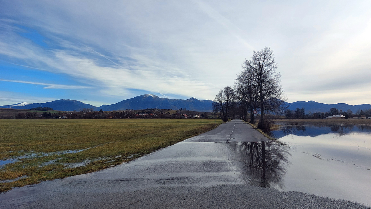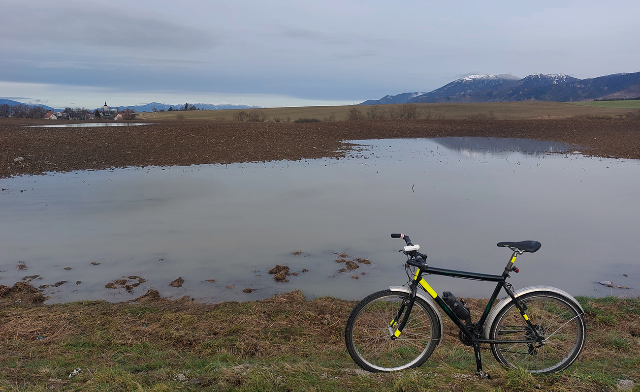 Nazad až nad Teplice rovnakou cestou, aj ten brod na okraji Rovnej hory mi podvozok znovu parádne umyl, ale už sa lepšie išlo, so sviežou podporou do chrbta. Taký príjemný, teplý, jarný vetrík - šľak ho traf na začiatku januára :-) A cesta skoro suchá. Chcel som sa samozrejme čo najviac vyhýbať hlavným cestám, tak som štrikoval kadejako cez Turčiansky Michal, cez oba Čepčíny a Ivančinú. Kadejaké jazierka aj v strede polí, jedno dokonca s ostrovom aj polostrovmi :-) Akurát v pozadí za nimi ten smutný pohľad na ledva pocukrované kopce Veľkej Fatry, aaaach jo...