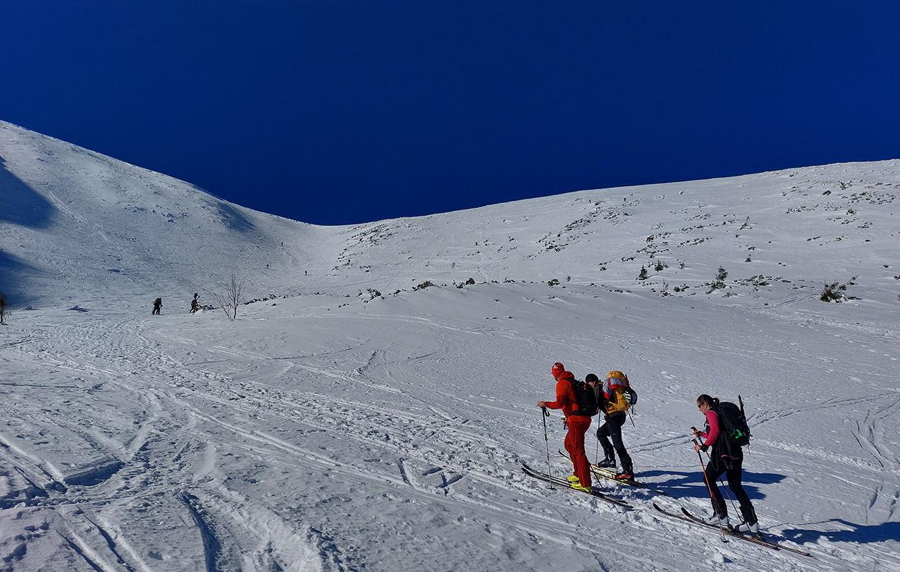 Sobota, siedmy marec, vyrazili sme do mierneho mrazíku z parkoviska P1 v Jasnej, smer Sedlo Poľany. Obloha gýčovito čistá, očakávaný úpek na južných svahoch. Severy vraj v top podmienke, uvidíme cestou hore. Plán bol okúsiť a zlyžovať takto zrána aspoň jeden juh niekde pod Kotliskami, potom pred páľavou utiecť do Derešských kotlov. Nakoniec to bolo mierne inak, ale nevadilo, aj keď nás mierne upieklo, poniektorých aj celkom na mäkko. A 2000 výškových je vraj celom dosť na takú prechádzku – no čo ja viem? Každopádne podobný nápad, ako sa dosať na hrebeň, malo v rovnakom čase doooosť veľa ľudí, ani sme sa nedivili. Lepšie ako po zjazdovkách. Keď sme potom popoludní po záverečnej zbehli dole, COROSy ukázali toto: