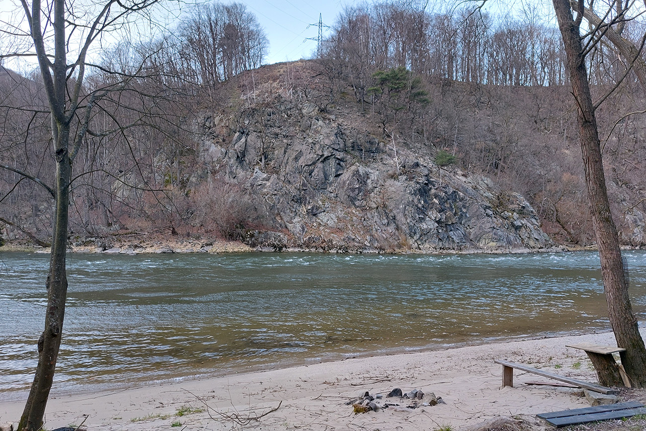 Potom už nekonečné roviny popri vode, s rastúcimi továrenskými komínmi v diaľke. A hustnúca premávka – všeeeetci sú tam, lebo je konečne príjemne teplo a ešte aj nedeľa. V lete budú na opačnej strane, lebo tam je viac tieňa. Niekde v polovici je možnosť skrátiť si okruh mostíkom na druhý breh, ale samozrejme valím až pod elektráreň.