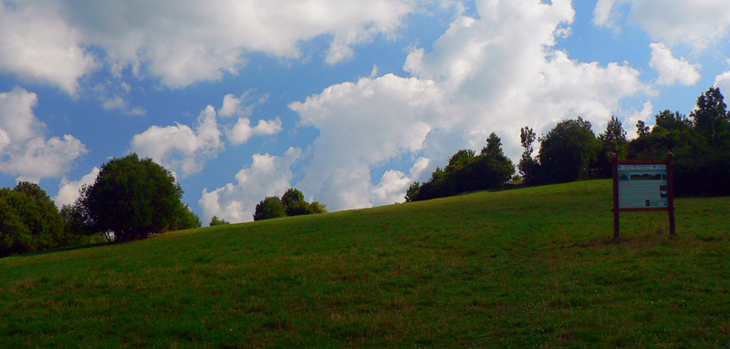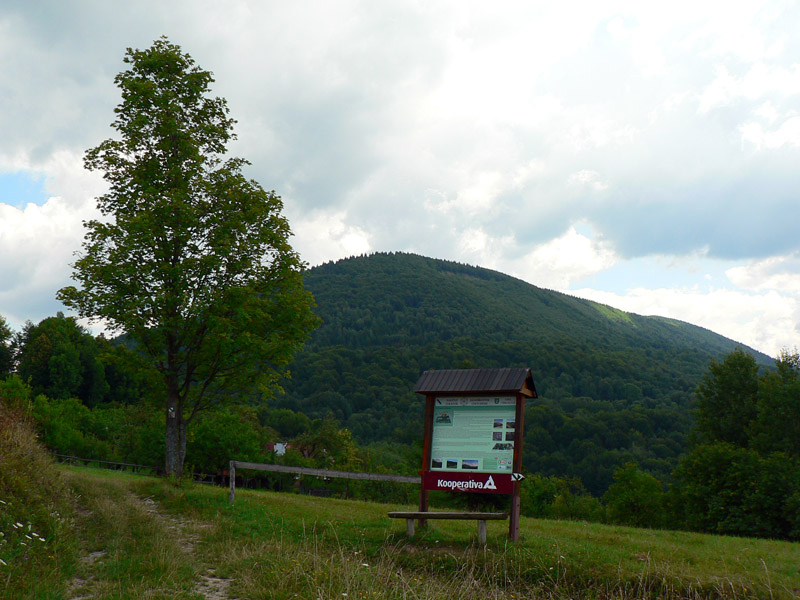 Ale po pár stovkách metrov sa sklon mierni, rozhľad sa zväčšuje, aj prvý infopanel je tu. Po temene Úboče sa preplietam cez diery v krovinách na medziach, okolo zvyškov terasových polí do osady Vyšní Berešovci. Na pravoboku v protisvetle pózujú Rozsutce, vľavo vzadu Mravečník, cez ktorý sa budem vracať. Tu sa blúdiť ani nedá, ale aj značenie je perfektné.