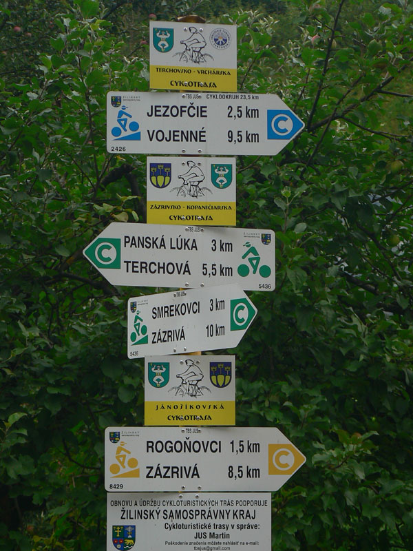 Terchová sa na jednej z tabúľ v centre chváli, že v okolí má vyznačených viac ako 250km cyklotrás. Takže je na čase preveriť možnosti. Hlavne značenie, lebo to vo viacerých oblastiach Slovenska dokáže skôr zmiasť ako pomôcť. Začínam na námestí – cez potok oproti obecnému úradu a infocentru je cyklomapa aj smerovník, naježený šípkami na všetky strany.