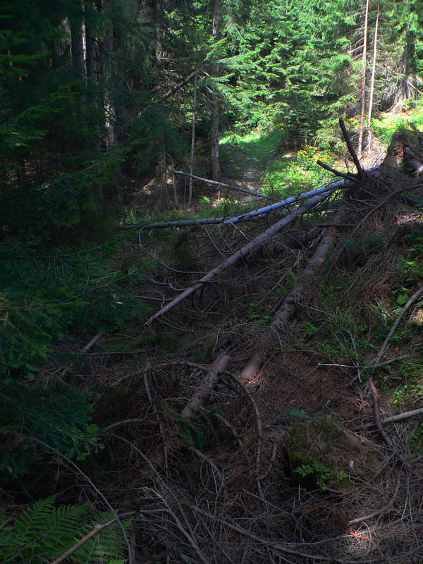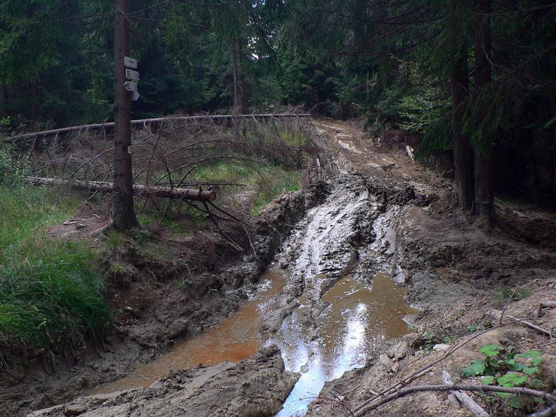 Pod Zázvorskou Kýčerou pozor! Treba zabočiť prudko doľava, aj keď cesta ide aj rovno. Ale smerovník navedie. Nasleduje najhorší mordor, ale niet ho kade obísť – jedine sa spustiť do doliny. Po zalesnenom hrebeni Vojenného nejde spevnená zvážnica, len hlinený tankodrom. Hlbšie koľaje som ešte nevidel – ako toto dajú po ťažbe do poriadku??? Nedajú, veď načo... Úplne super boli dve miestne tetušky, ktoré cestou odhadzovali nabok malé konáriky, vraj aby cesta pekná bola... Zjazd na lúky pri osade Káčerovci bol totálny adrenalín, jazda medzi koľajami miestami ako po kladine, za mokra nemysliteľné.