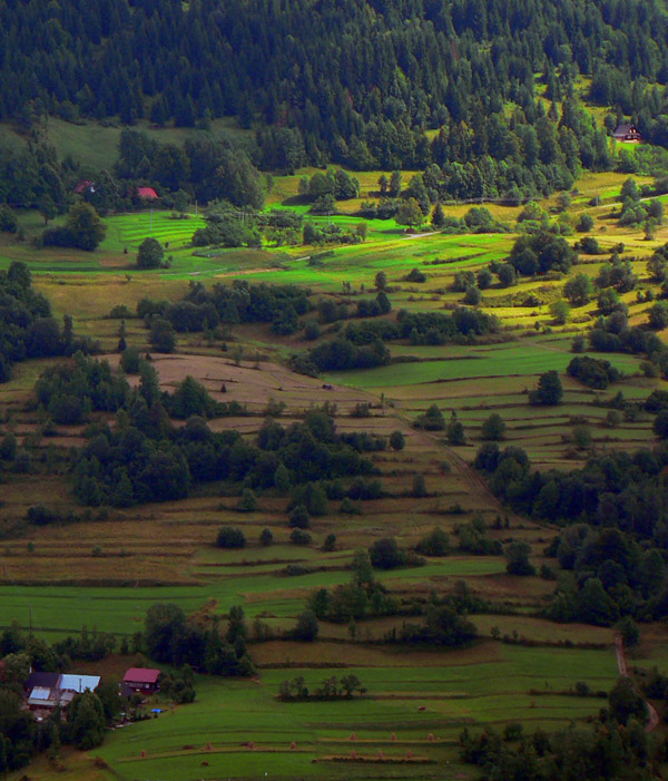 Po miernom zjazde v osade Šípková doprava a hore dolinou do osady Balátovci (fúha, riadne haciendy!). Oddych, asfalt. Za osadou žltá aj modrá cyklotrasa odbočuje na zvážnice doprava, ale mne sa nechce. Chce to niečo technickejšie aj do kopca :-) Možnosť tu je: rovno vedie žltá pešiacka značka a mapa sľubuje výstup lúčnou cestou a vyššie v lese traverzom bežkárskej cesty pod Kýčeru. To by sa predsa malo dať jazdiť! Na hrebeni sa napojím na tú modrú cyklocestu (č.2426).