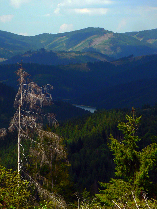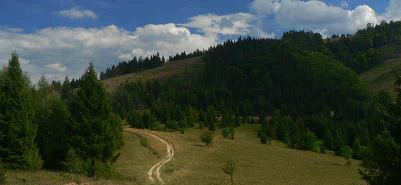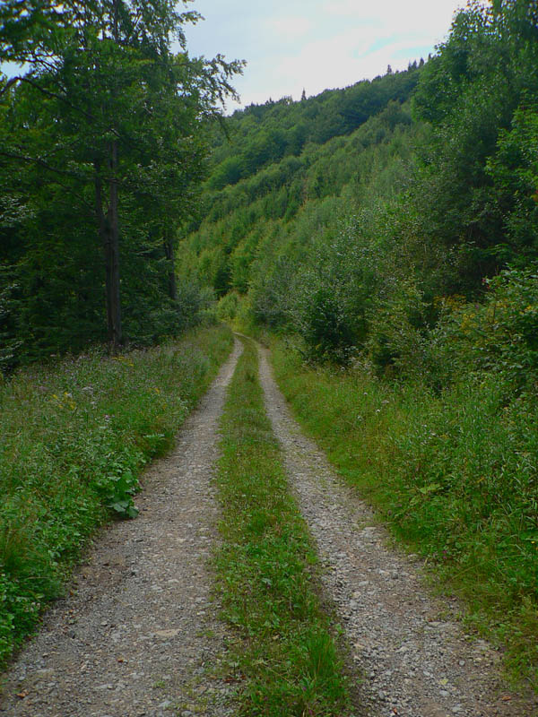 Konečne zas krásne lúky po širokom hrebeni, ale aj so širokou zvážnicou. A ťažia tu fest, na ceste hrubá vrstva ani nie prachu, ale púdru! Smrť pre ložiská, radšej idem po tráve vedľa. Výhľady sú najmä na sever – vidno cestu z Oravy na Kysuce aj vodárenskú nádrž Nová Bystrica, ale hlavne obrovské holoruby. Pohľady na juh cez dolinu sú zriedkavé, ale krajšie.