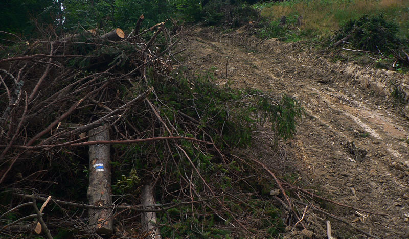 Ale ešte jeden bonbónik ma čaká! U Káčerovcov mením farbu – modrú (2426) za žltú (8428) cez Mravečník, tou by som sa mal dostať až do Terchovej. Ale pohľad do mapy dáva tušiť nejakú záludnosť :-) Výjazd z osady je ešte príjemný, ale prichádzam pod kopec a neverím, že toto niekto naplánoval pre bajkerov: svahy Mravečníka sú jedna obrovská plešina a cyklotrasa ide hore pekne s pešiackou modrou priamo po spádnici, stredom toho rúbaniska!!! Tlačím a neverím – miestami je problém ísť pešo, okolo len tráva po pás a konáre pod nohami, značky ani niet kam dať. Ale zrazu hluk – nado mnou bager! Rozširujú tu zvážnicu (asi na diaľnicu), vraj sa po jej serpentínach dá až odspodu. Tak využívam aspoň vrchnú polovicu. A hore ďalší bager, a ešte väčší . Aspoň že sa slušne uhol :-) Ak to bude takto aj dolu do dediny, tak vďaka.